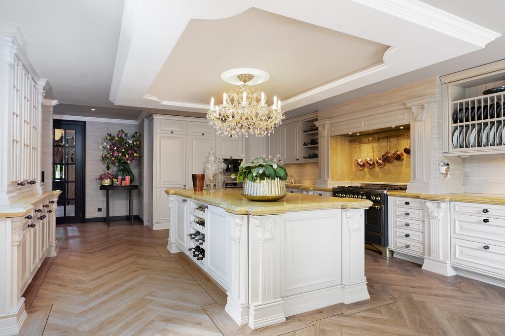 The grand entrance hall, with a built-in wardrobe and guest toilet, leads to the spacious country-style kitchen, equipped with a cooking island, china cabinet, and high-end built-in appliances, including two dishwashers, two refrigerators, two freezers, two combination convection ovens, and a five-burner Boretti stove. Double French doors from the kitchen, living room, and pool area open directly onto the beautifully landscaped backyard.