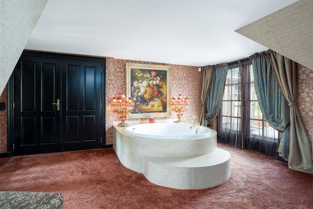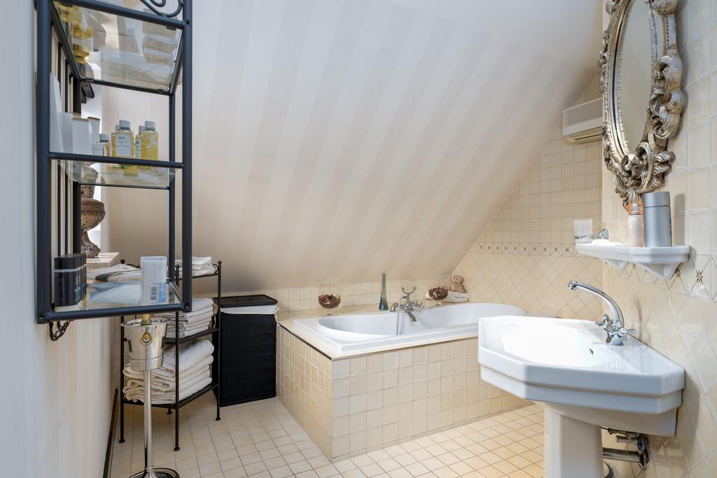 The first floor boasts three spacious bedrooms, each with a private bathroom. The master suite is in a league of its own, featuring a freestanding round bathtub, an en-suite bathroom with a toilet, an exclusive antique vanity (Pander) with double sinks, and a spacious walk-in shower. The suite also has direct access to the wellness area on the ground floor via a private staircase. A true eye-catcher is the impressive 50 m² walk-in closet, complete with a custom wardrobe system, mirrors, atmospheric lighting, and a marble floor. All bedrooms are equipped with air conditioning.