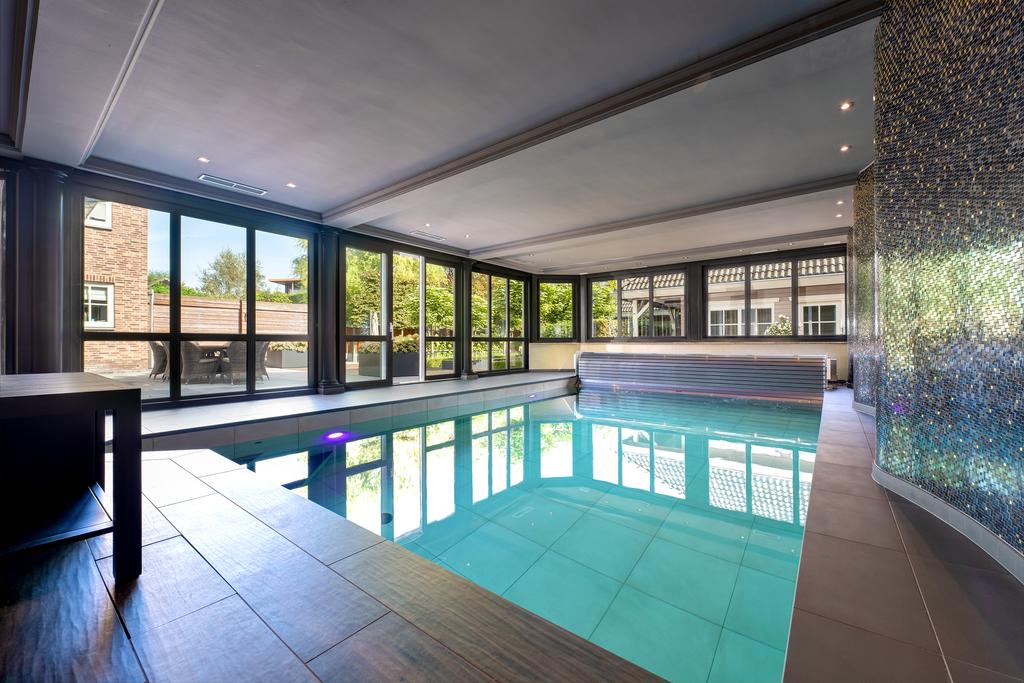 One of the absolute highlights of this property is the indoor swimming pool with a wellness area. This exclusive pool (renovated in 2022) is seamlessly integrated into the villa and separated from the living area by a glass wall. From the pool area, you have direct access to the expansive garden with a large terrace, ideal for relaxing in a luxurious lounge setting.