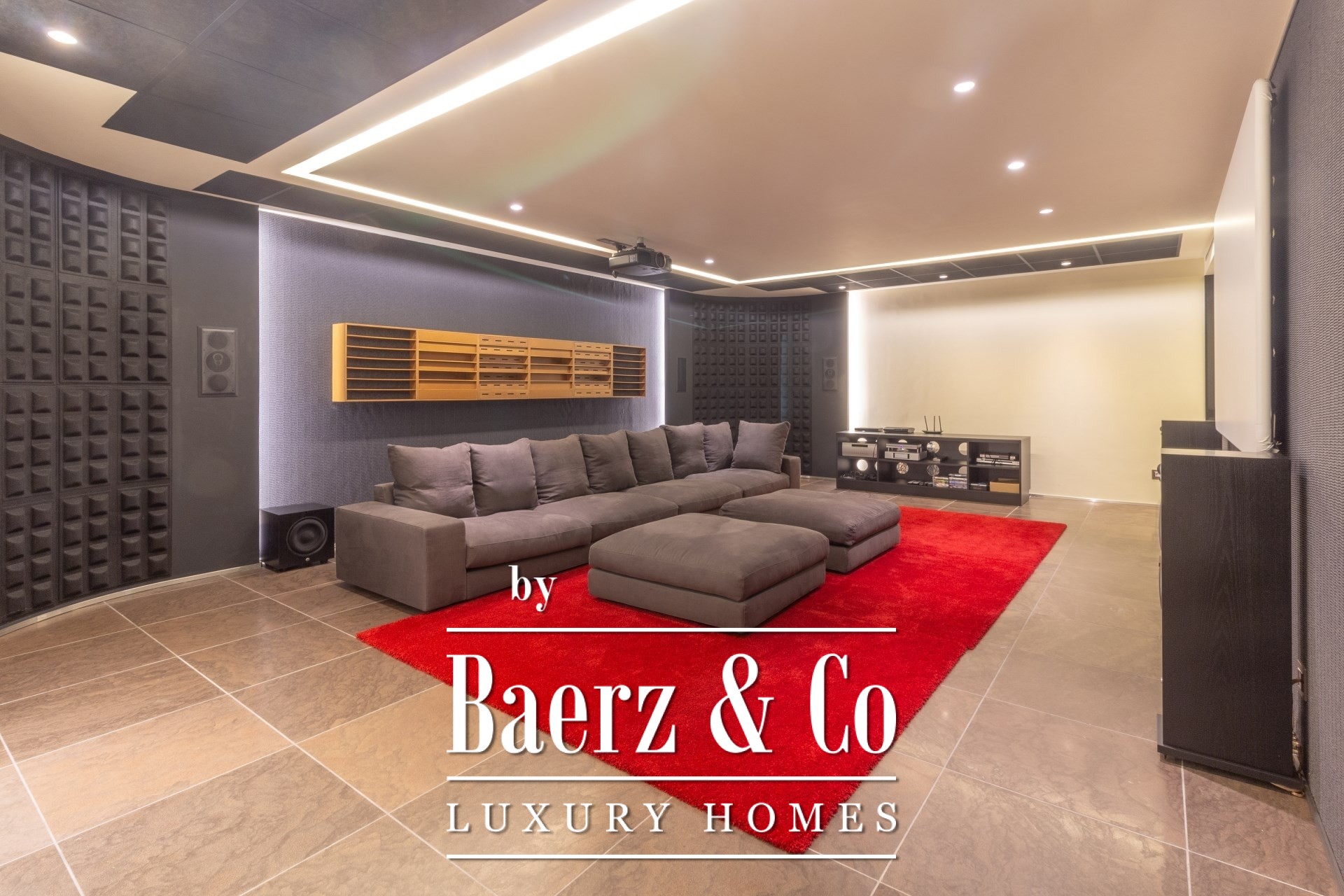 Outdoors, mature gardens surround the pool with its waterfall feature, a barbecue and outdoor kitchen, and expansive chill-out spaces. Underfloor heating, ducted air conditioning, electric windows, integrated audio, complete surveillance, and an elevator underscore the emphasis on comfort and security.