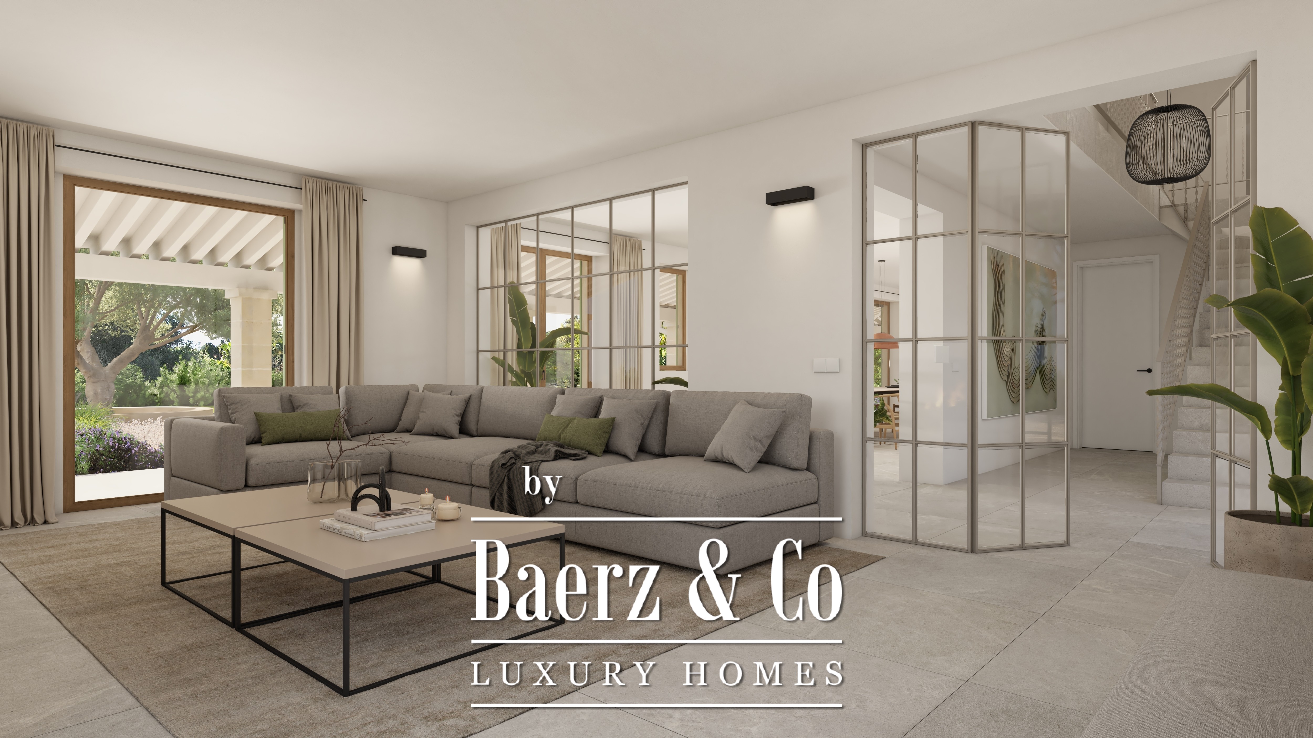 Villa Pollenca presents 411 m² of refined living space on a 16,423 m² estate where traditional Mallorcan stone architecture has been fully renewed in 2025 to exacting standards. Five double bedrooms and four bathrooms, three en suite, flow around a central salon with fireplace, a generous kitchen and dining area, a laundry, a wine cellar and guest conveniences. Natural stone floors with underfloor heating, full air conditioning, advanced domotics and double glazing ensure seamless comfort. Wide covered terraces extend to landscaped gardens, creating layered spaces for dining and repose. A private 70 m² pool anchors the outdoor rhythm, framed by mountain views and soft Mediterranean light. The property is self-sufficient with its own well, solar park with battery packs and a back up generator, while connected to the grid. Located on the quiet border between Pollenca and Alcudia, mornings are marked by the stillness of olive groves, afternoons by walks along historic lanes, evenings by the glow of village cafés and the nearness of marinas and beaches. Villa Pollenca is offered fully furnished, a ready sanctuary for year round living or an elegant holiday residence, where every element of privacy, craftsmanship and natural beauty is composed with enduring grace.