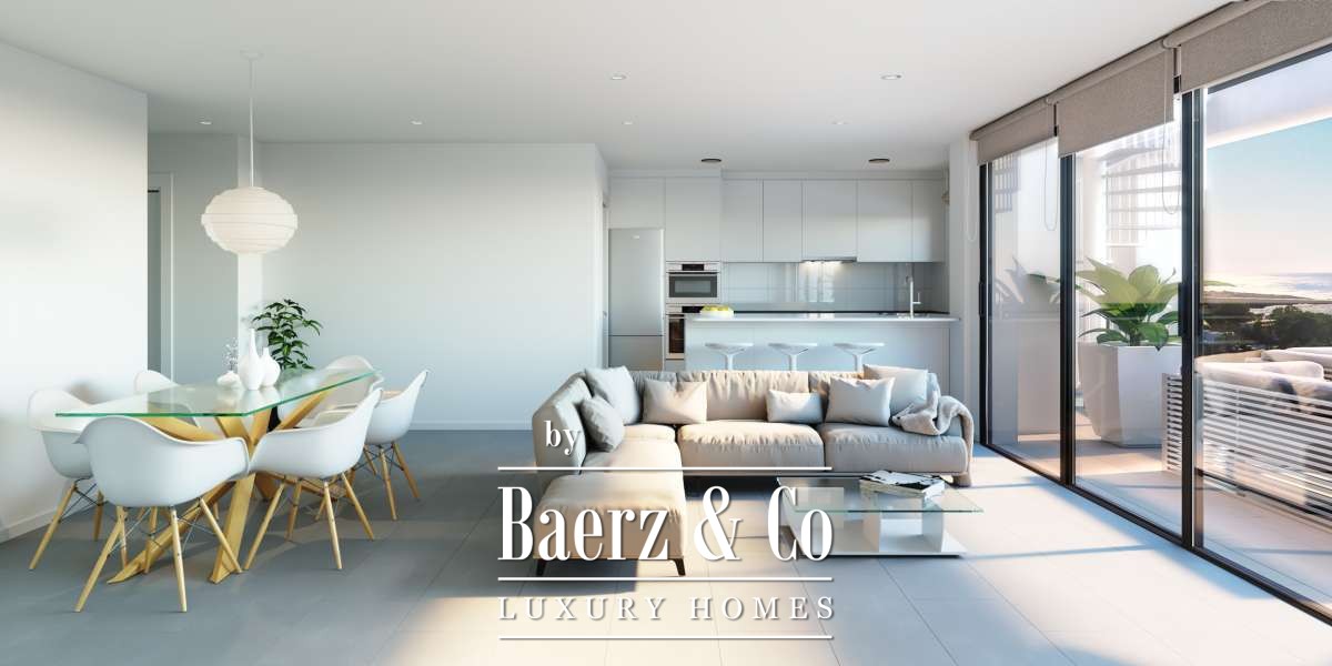 The residence offers 103 m² and three bedrooms, with the master suite featuring a private en-suite. Two bathrooms, a fully appointed kitchen, and a spacious living room establish a gentle rhythm throughout the interior. The west-facing balcony or terrace, generous in scale, frames evening sunsets across the sea. Top-floor apartments invite private pool installations and sunbathing lawns while ground-floor homes extend into the gardens and a communal pool.