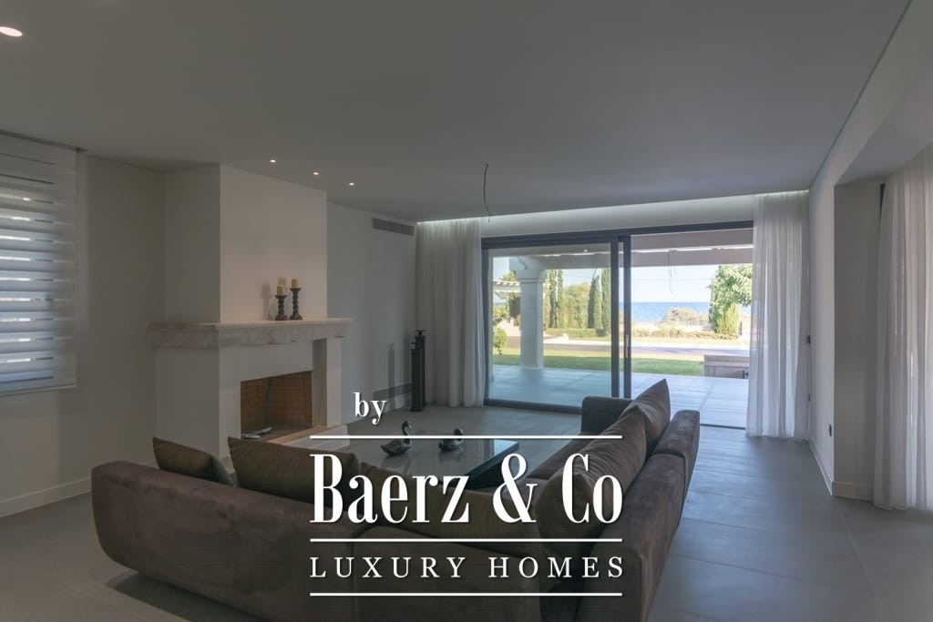The villa’s features include a fireplace, air conditioning, heating, high-speed internet, and satellite TV to ensure year-round convenience. Outdoors, the landscaped Mediterranean garden surrounds a 12 x 5 meter swimming pool, expansive patios, alfresco dining space, and two barbecue kiosks. Ample parking enhances everyday practicality. A rare 40-meter sea frontage establishes a direct connection to the coastline, making this coastal villa in Porto Heli a discreet retreat of architectural distinction and a remarkable opportunity in one of Greece’s most desirable residential settings.