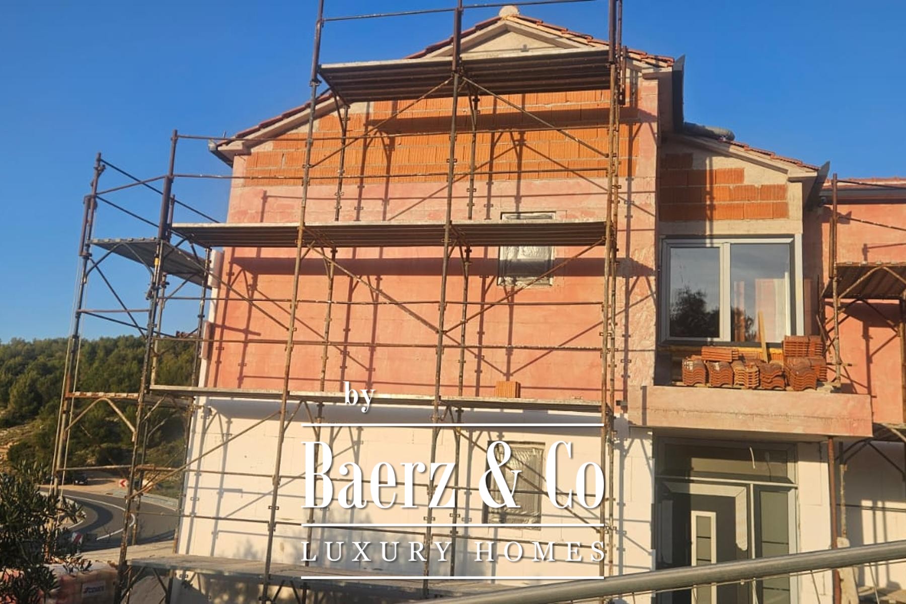 The house unfolds over a basement, high ground floor, and first floor, providing a harmonious flow between private and communal spaces. The ground floor welcomes you with an open-plan kitchen, dining, and living room, extending to a spacious terrace of 15.6 m² with sea views. Upstairs, three comfortable bedrooms each feature a private bathroom, with two rooms opening out to balconies that capture panoramic vistas of the Adriatic, while a third bedroom includes access to an adjacent balcony.