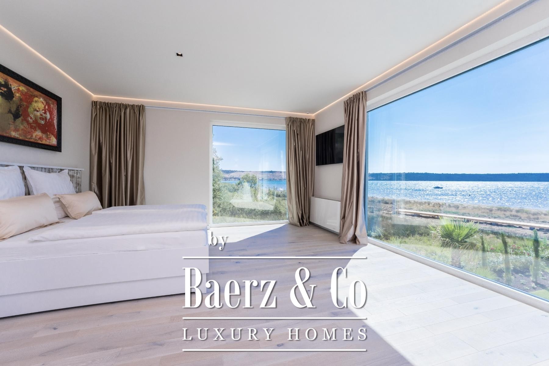 A 560 m² Mediterranean garden includes an automated irrigation system, video surveillance, and covered leisure spaces for all-day use. Amenities span two equipped kitchens, advanced security, and the option to acquire a neighbouring garage with storage and e-mobility connections. This luxury villa for sale in Ražanac balances architectural purity with comfort, positioned for those seeking refined coastal living in Croatia.