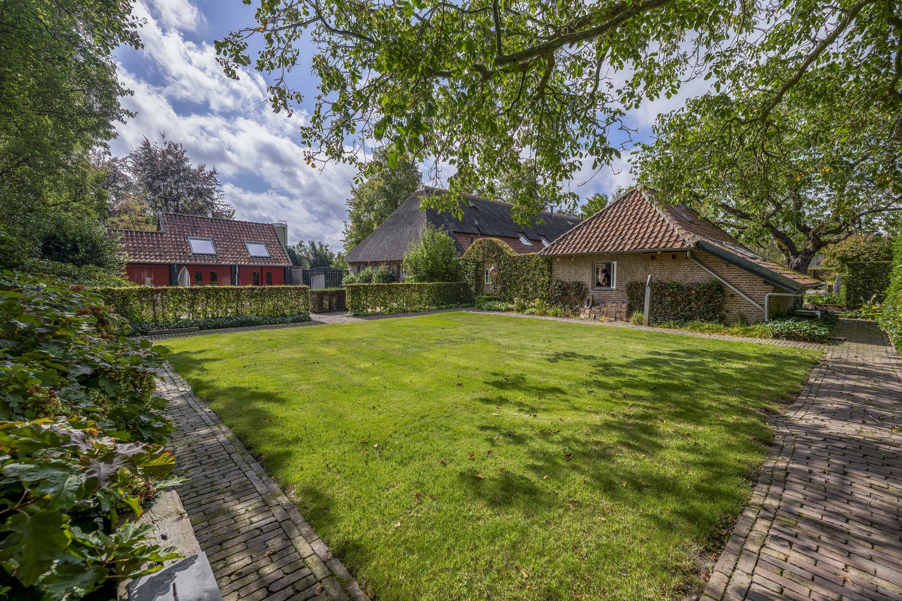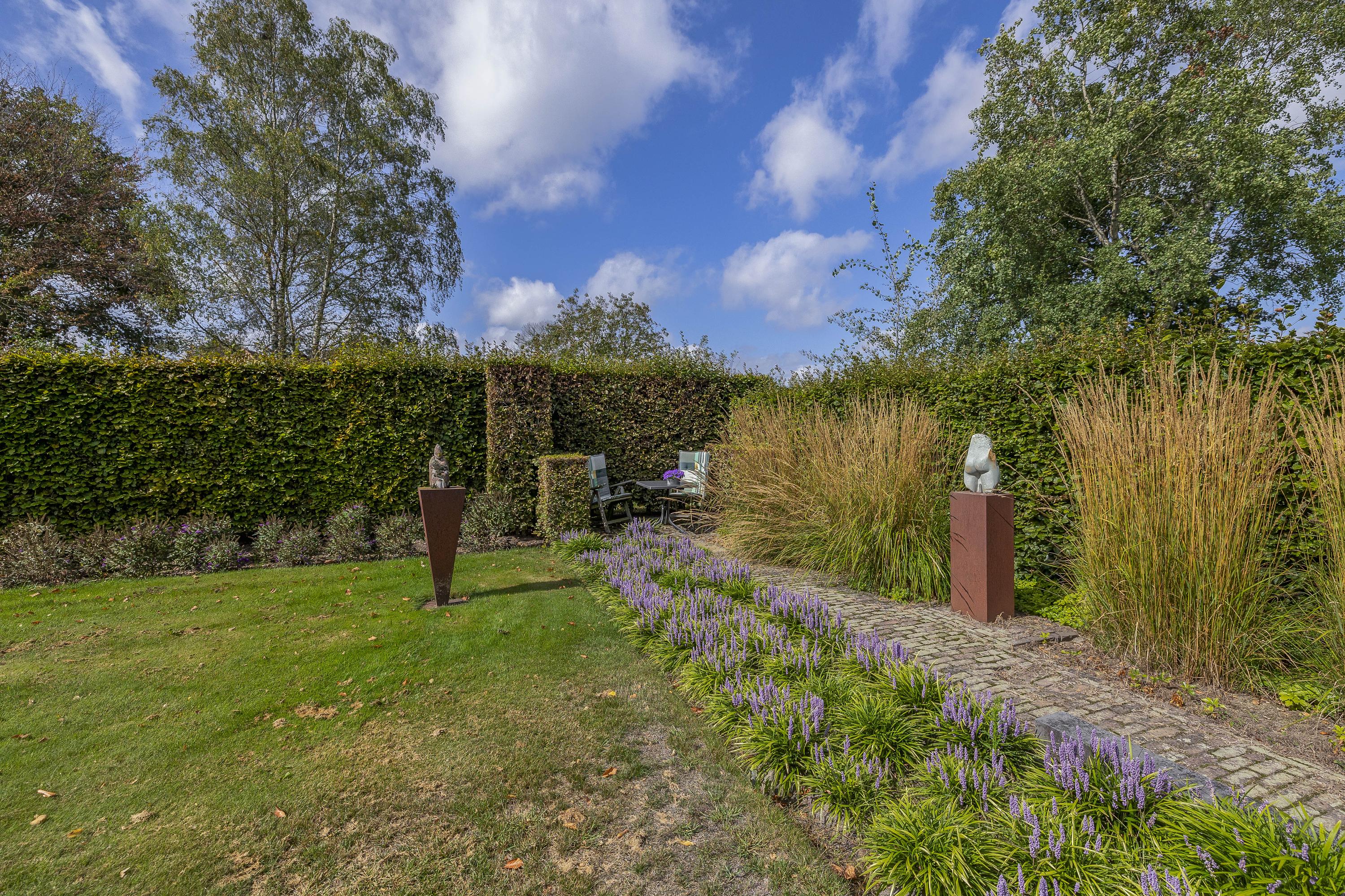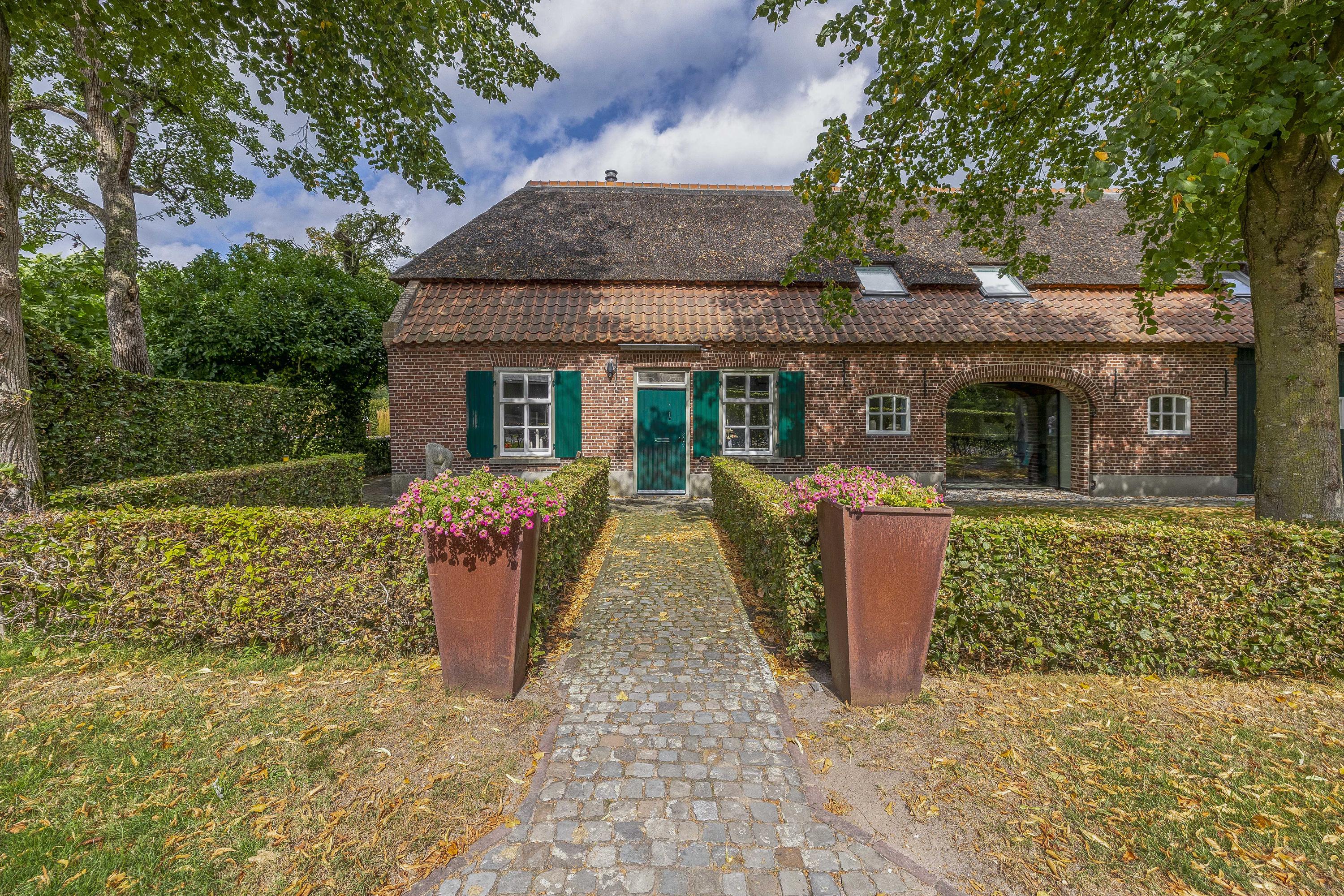 Behind the house and on the sides is a beautifully landscaped garden. On the left side is a nice, spacious area with a lawn, plant borders, old baked clinker paving, and various beech hedges. At the rear, you can enjoy a beautiful view, a large pond (with biological filter), a spacious lawn, plant borders, and mature vegetation. The garden is well laid out and well maintained. There is a double driveway on the right side of the property. The garden even offers the possibility of keeping small animals. There is also a section of the garden with a “lovers' lane.” To the left of the house is a landscaped jeu-de-boules court.