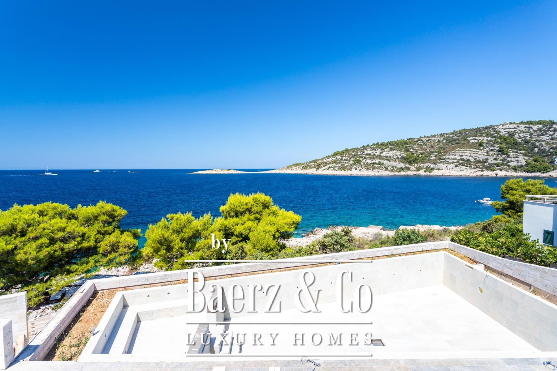 Unique ultramodern villa first row to the sea in the vicinity of Raznja!Outstanding contemporary exterior and interior design! The position right next to the sea, at the end of the construction zone, borders the green belt of the forest.The total area is 540 m2. The yard is 810 m2 in size.The villa consists of three floors.Floor -1: tavern with kitchen, fitness/gym with bathroom and potentially sauna, entrance to the 250 m2 swimming pool. with a pool of 75 m2.Floor 0: entrance hall, exit to the staircase, guest toilet, large living room with kitchen, bar, dining room, living room and terrace that opens to the sea.Floor +1: hallway, bedroom with bathroom, walk-in wardrobe and terrace with sea view, three more bedrooms