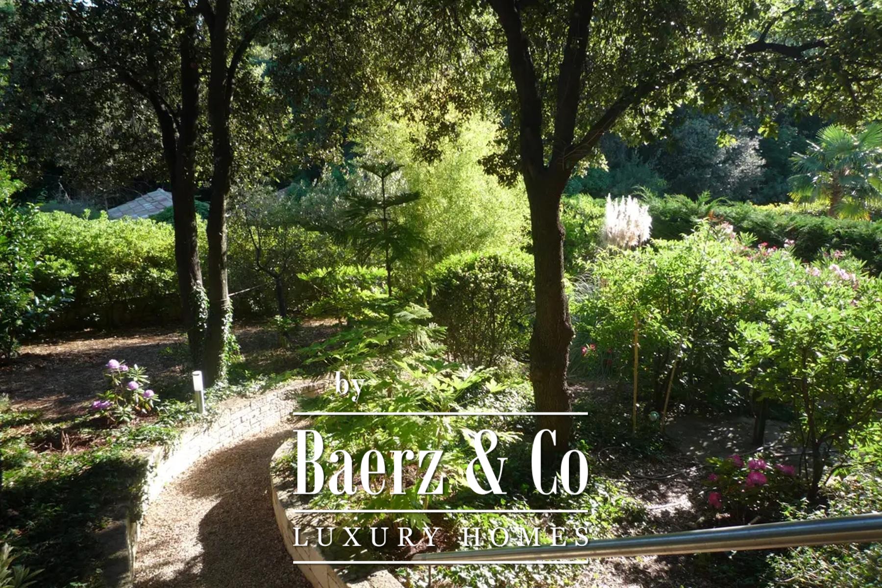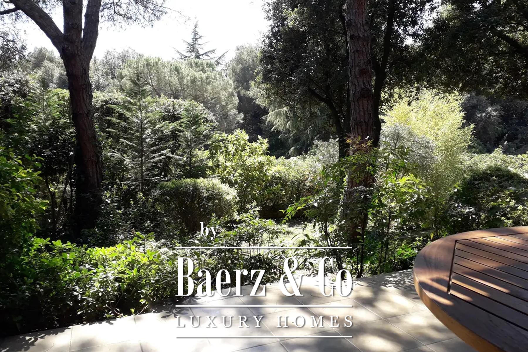 Upstairs, four tranquil bedrooms open onto balconies, with a gallery and shaded terrace connecting to a rooftop enclave for contemplative moments above the garden. The lower level hosts a summer kitchen framed in glass, and a wellness area with sauna, pools, and a landscaped terrace, while a cellar provides storage, central systems, and laundry.