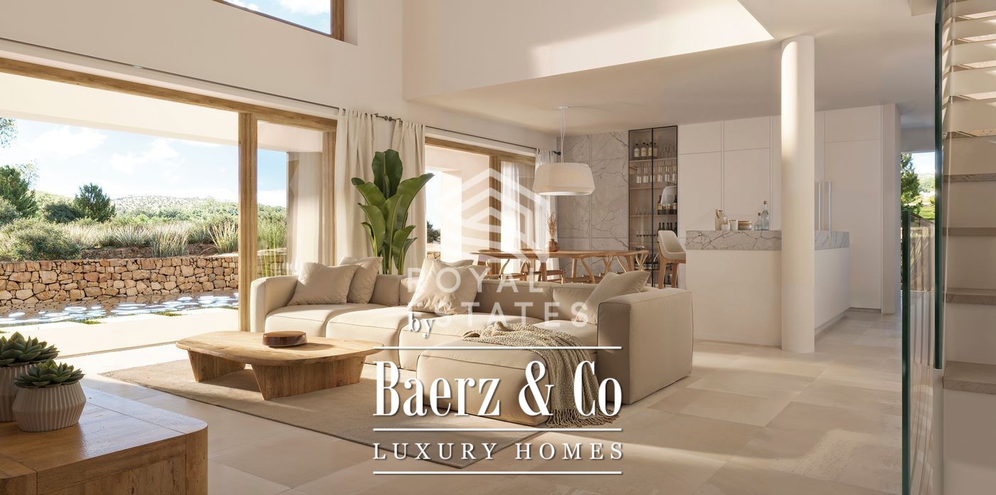 The development concept presents a contemporary take on traditional Ibizan architecture, defined by clean volumes, natural materials and an open flow between interiors and the outdoors. A granted building permit enables a swift move from vision to construction. The planned residence offers approximately 520 m² of built space with five bedrooms and five bathrooms, including distinct suites for family and guests. Interior design centers on abundant natural light and continuous movement between living, dining, terraces and pool area.
