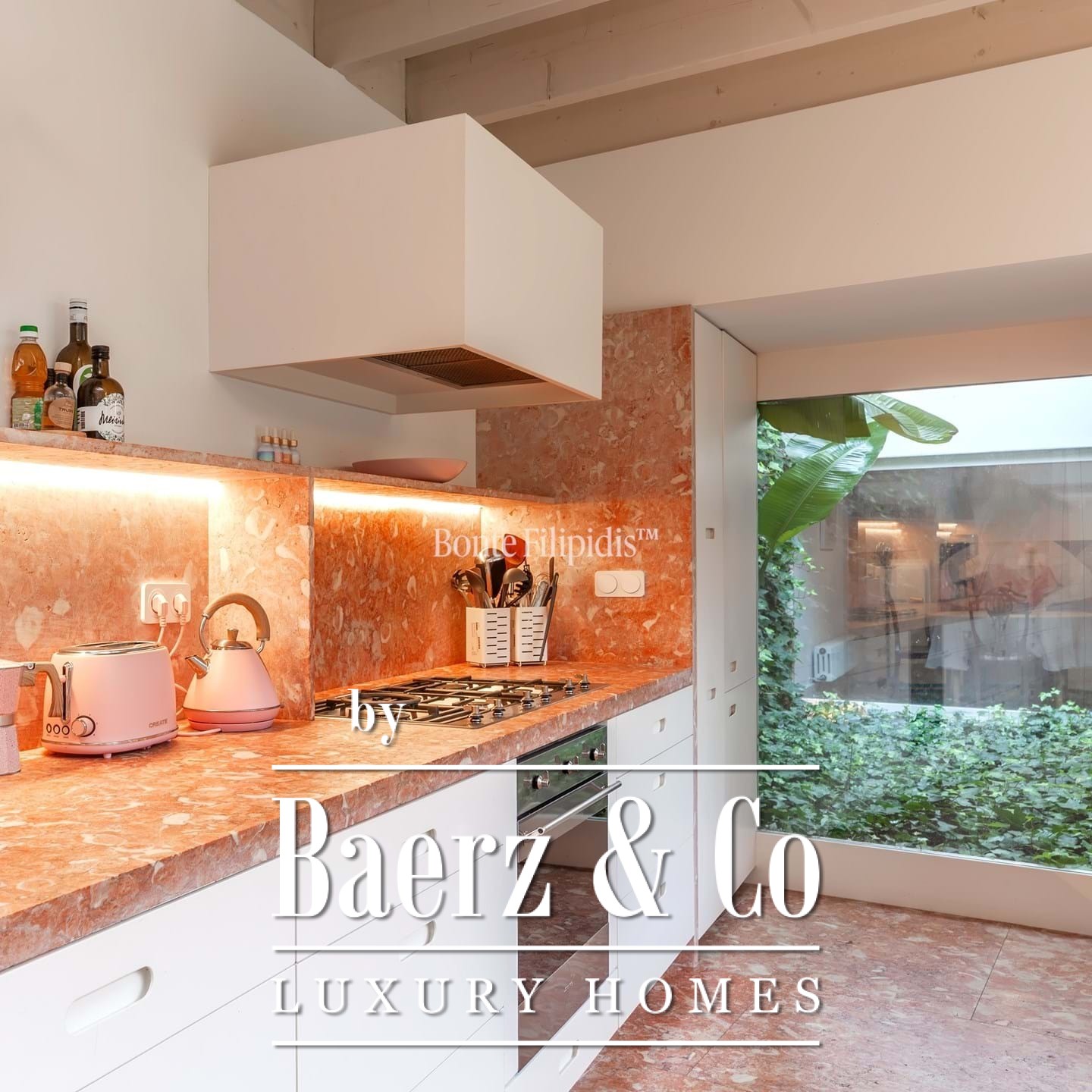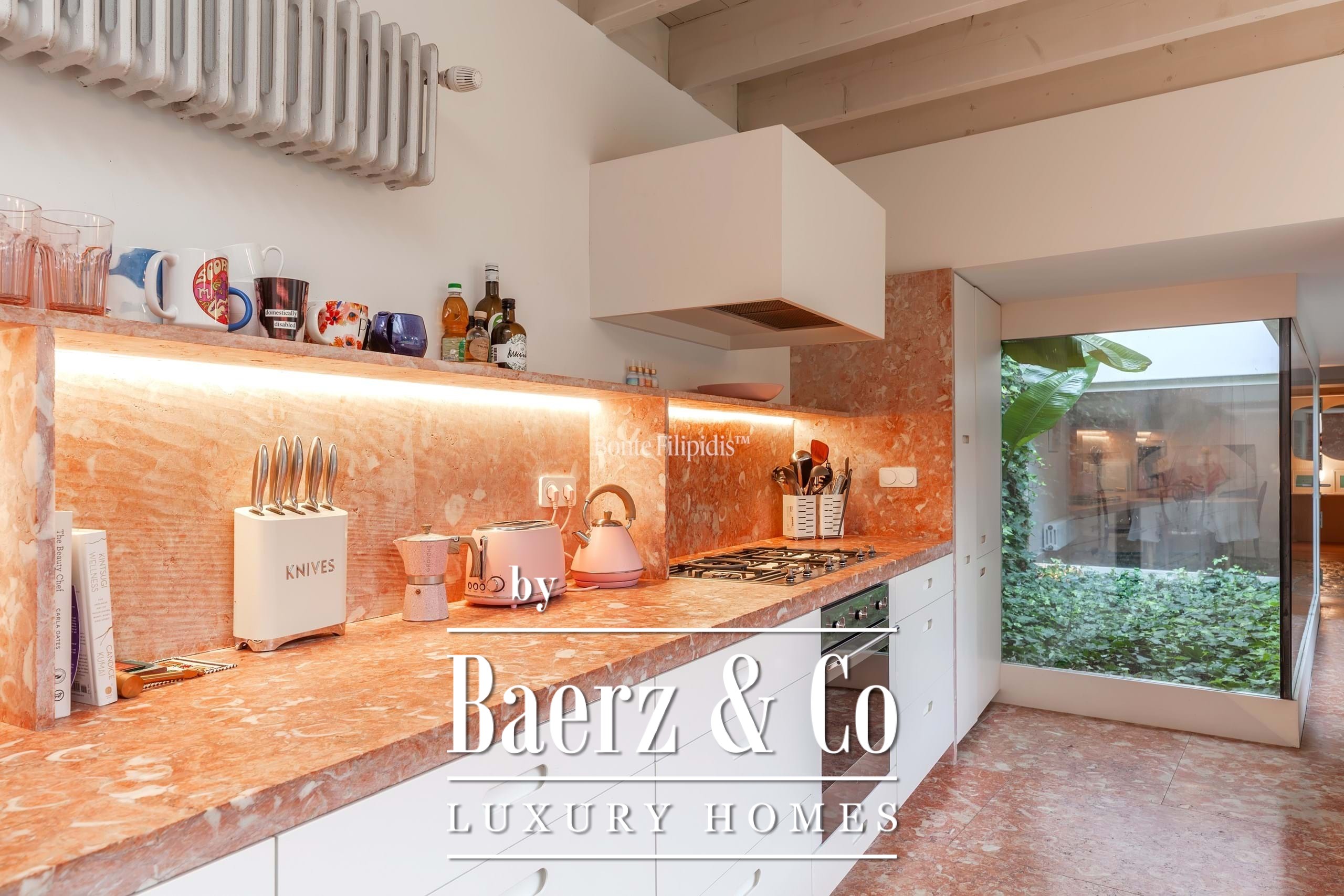 The primary living spaces are marked by original stone flooring and softly vintage accents, with large panoramic windows drawing natural light into the open-plan social area. Here, living and dining zones flow seamlessly out to an 80 m² private garden, a tranquil retreat bordered by mature greenery for quiet moments or reserved gatherings. Subtle material choices and precise detailing lend an understated sophistication to every space.