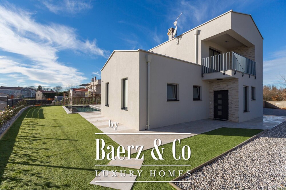 Villa Sveti Lovreč presents a considered retreat in Croatia, offering 198 m² of living space quietly seated on a 780 m² plot. This villa Sveti Lovreč is designed for refined privacy, defined by four bedrooms, each with its own bathroom, and an open living area enriched with natural light from floor-to-ceiling glass. The spatial rhythm flows seamlessly from the living room and dining area to the terrace, where a sun deck, pool, and summer kitchen with both wood and gas fireplaces invite effortless outdoor living.