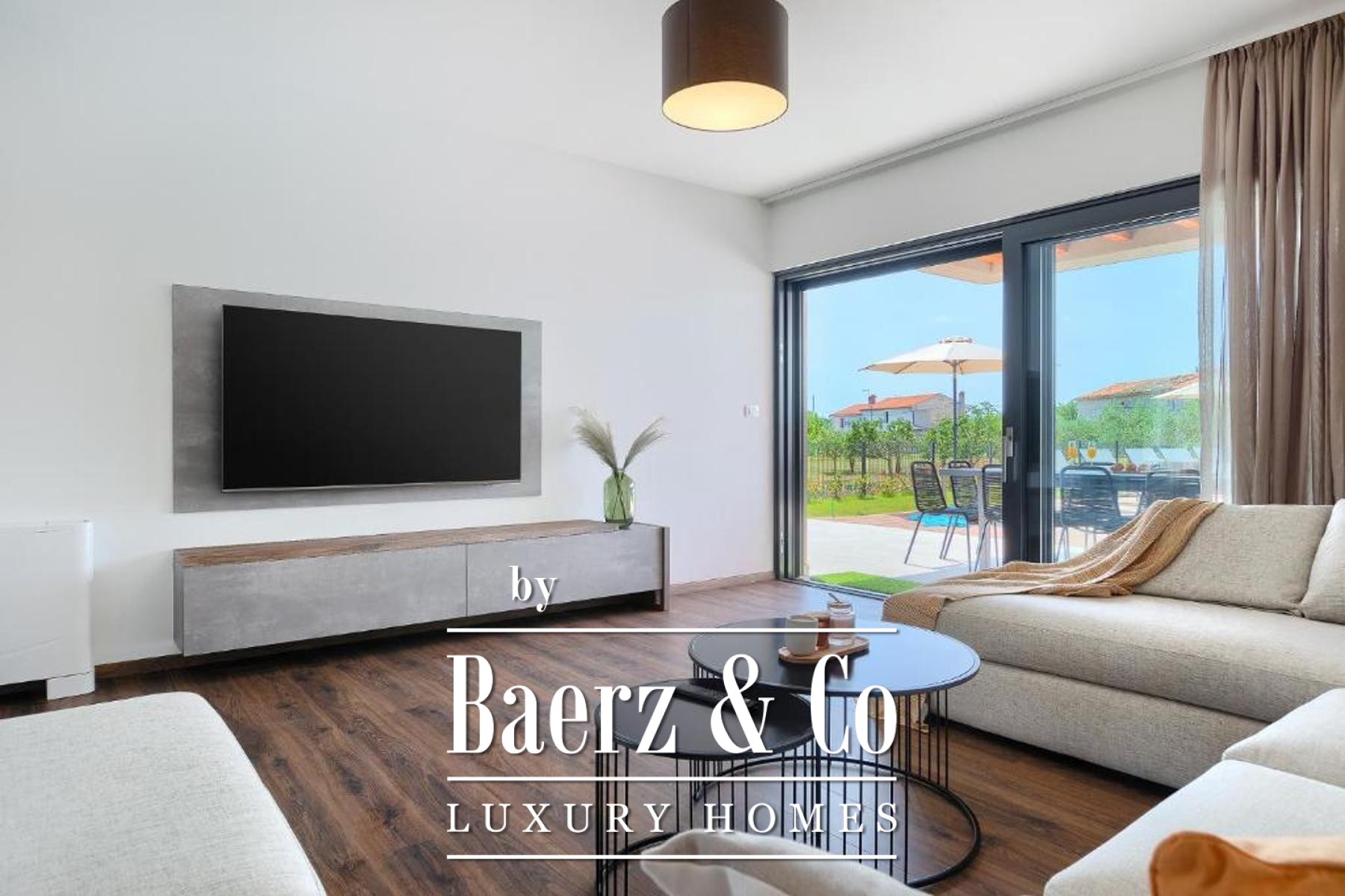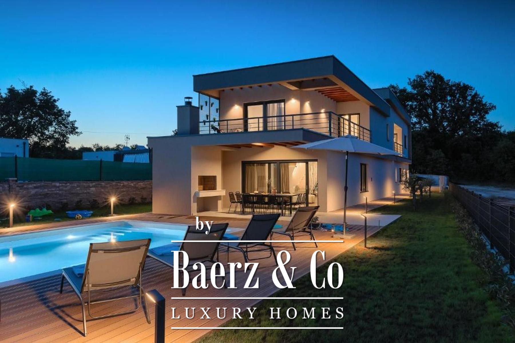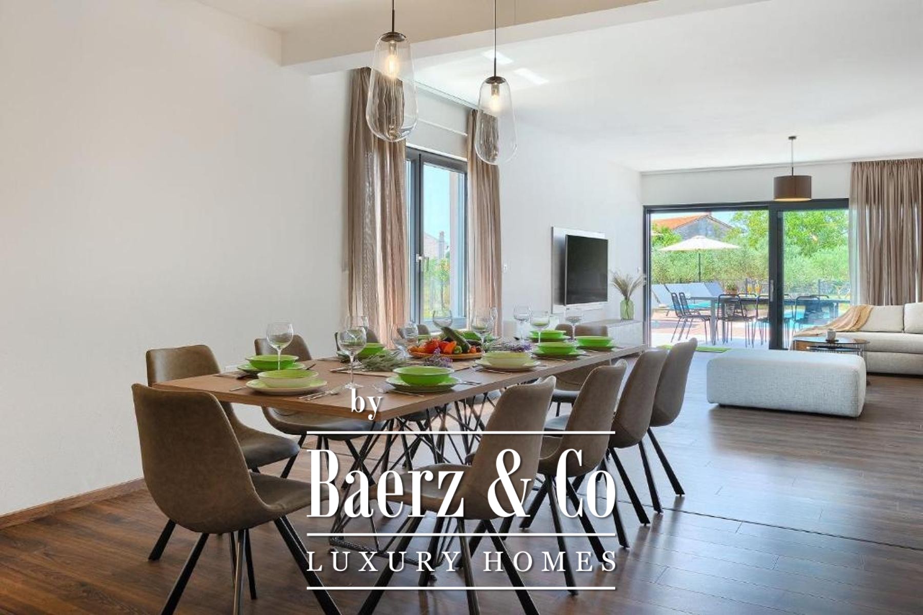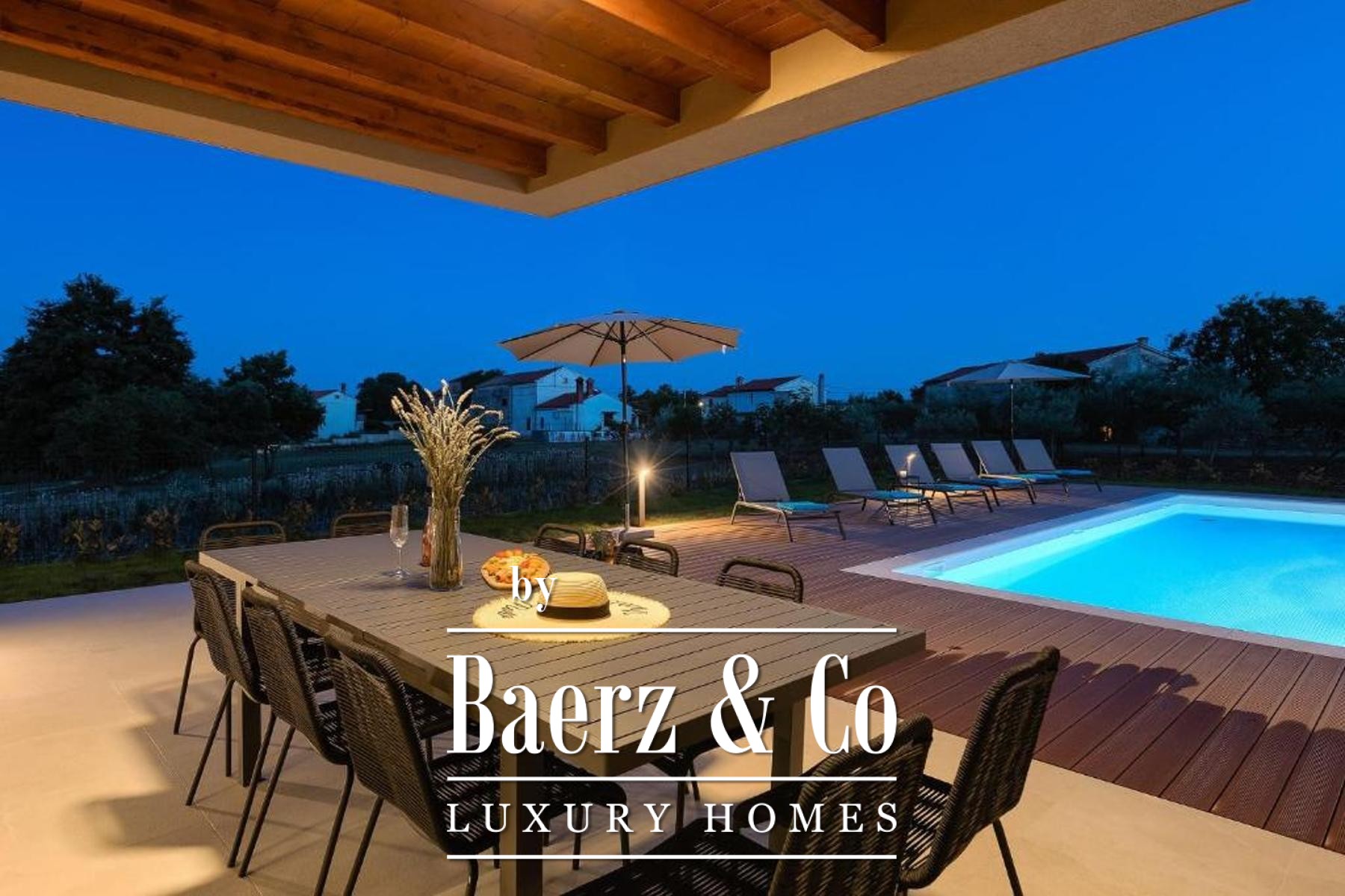 Outdoors, a fully fenced garden invites relaxation, its centrepiece a 50 m² heated pool finished in ceramic tiling and bordered by a tranquil sunbathing area. Modern heating and cooling systems throughout the villa underscore year-round comfort, whether for permanent residence, holiday retreat, or as a luxury villa for sale in Svetvinčenat. The environment, both natural and architectural, reflects an investment in privacy, quality, and the unhurried elegance of Istrian life.