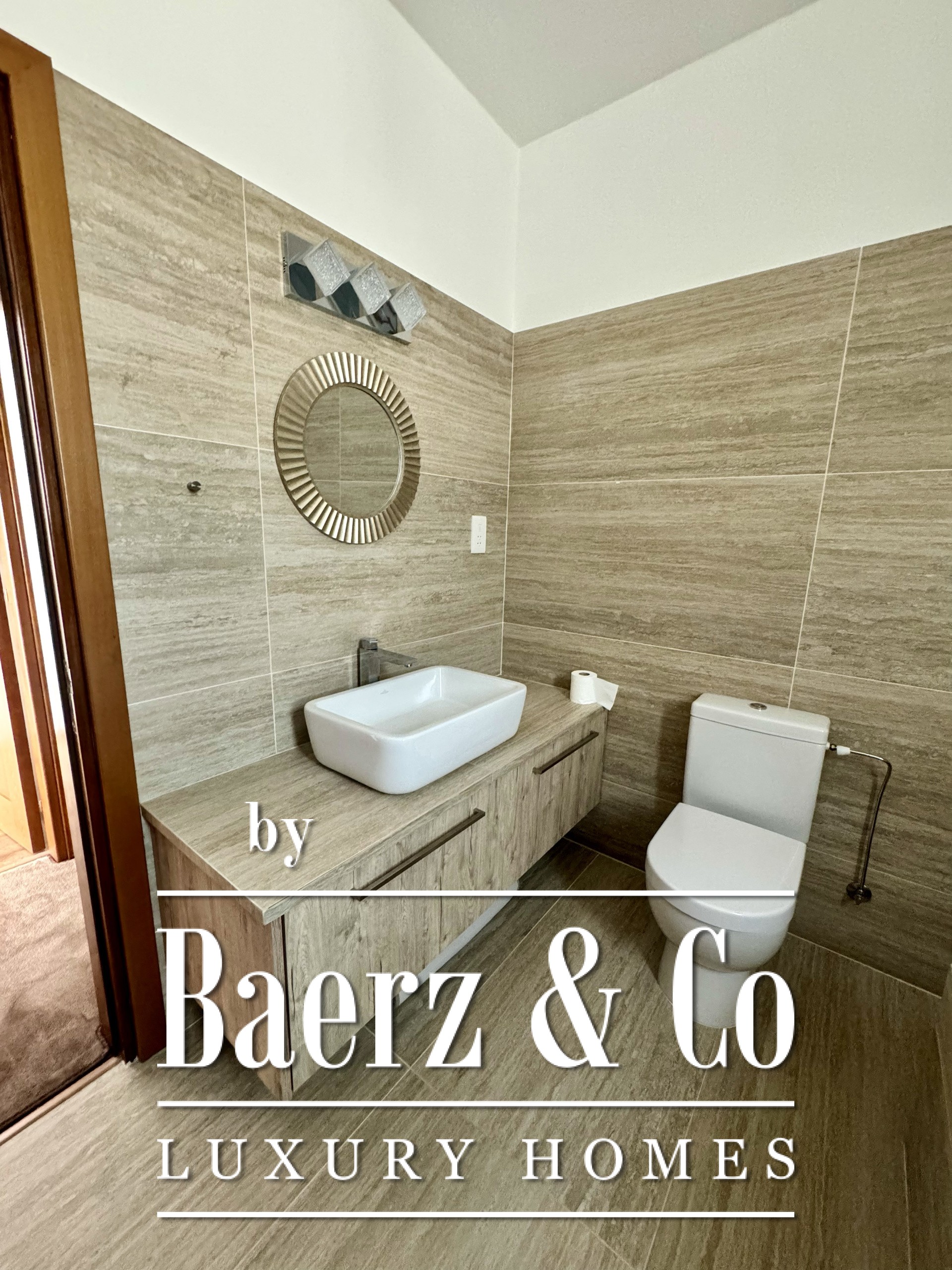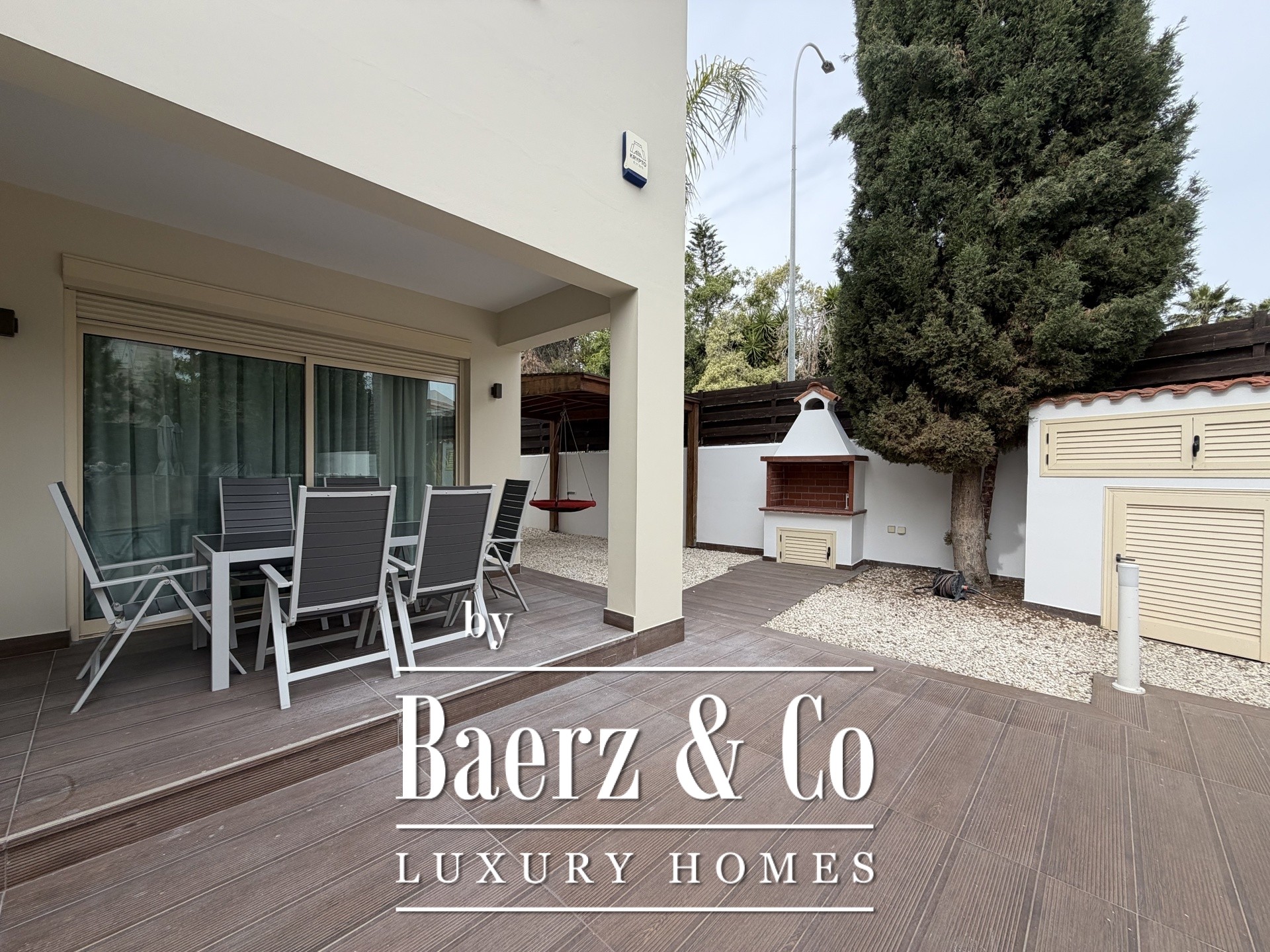 The fully furnished villa spans three levels with a 214 m² internal area on a 463 m² plot. Renovated in 2024, its five-bedroom layout includes five bathrooms and a guest WC. Four bedrooms reside on the second floor while the expansive master suite, complete with en-suite bathroom and a private storage room, occupies the top level. The kitchen faces the landscaped garden, complementing a separate dining area and a cozy living room anchored by a steam fireplace. Materials are elegantly matched with tiles, marble, and laminate throughout.