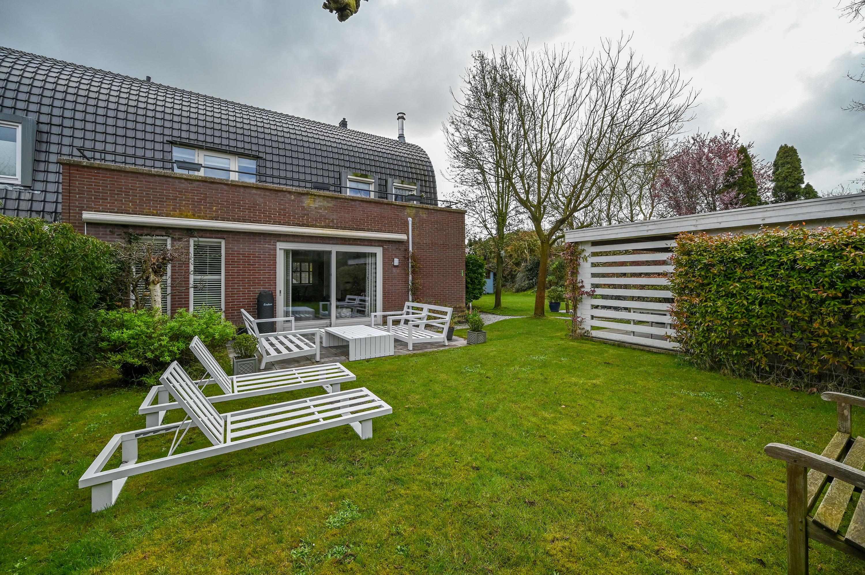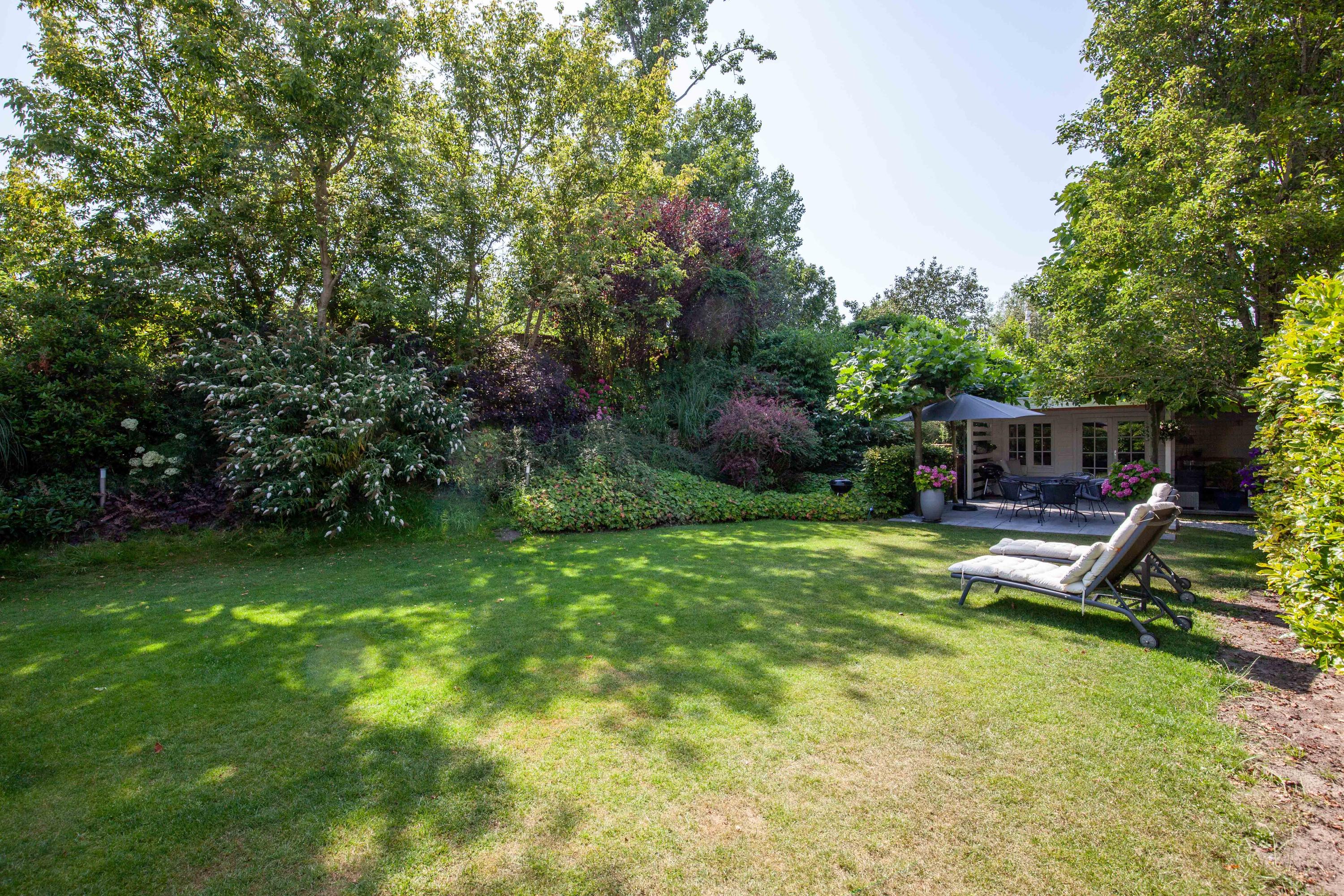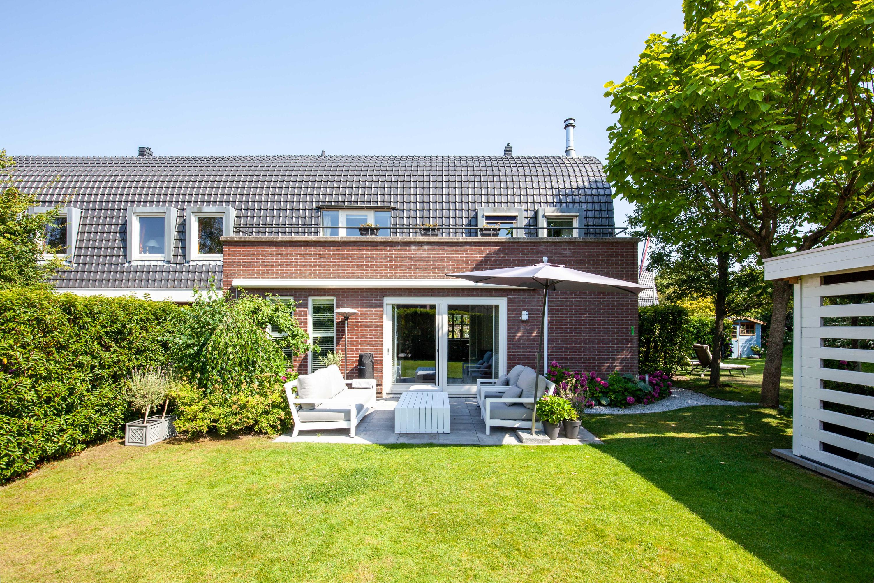 The beautiful garden is a true outdoor paradise, directly accessible via the sliding doors in the living room and via the side of the house through a charming open gate. The garden offers plenty of privacy and enjoys sunlight throughout the day, perfect for enjoying the outdoors. At the rear, there is a spacious terrace with a cozy seating area, complete with an awning spanning the full width of the house, ideal for both sun and shade. At the back of the garden stands a charming garden house with a covered area, perfect for a dining area with barbecue. The garden house features a neat wooden floor, electricity, and water, making it perfect as a workspace, hobby room, or for storage. Adjacent to the covered area is an additional terrace with seating, sheltered by a natural canopy of four beautiful plane trees, creating an idyllic spot to relax or entertain guests.