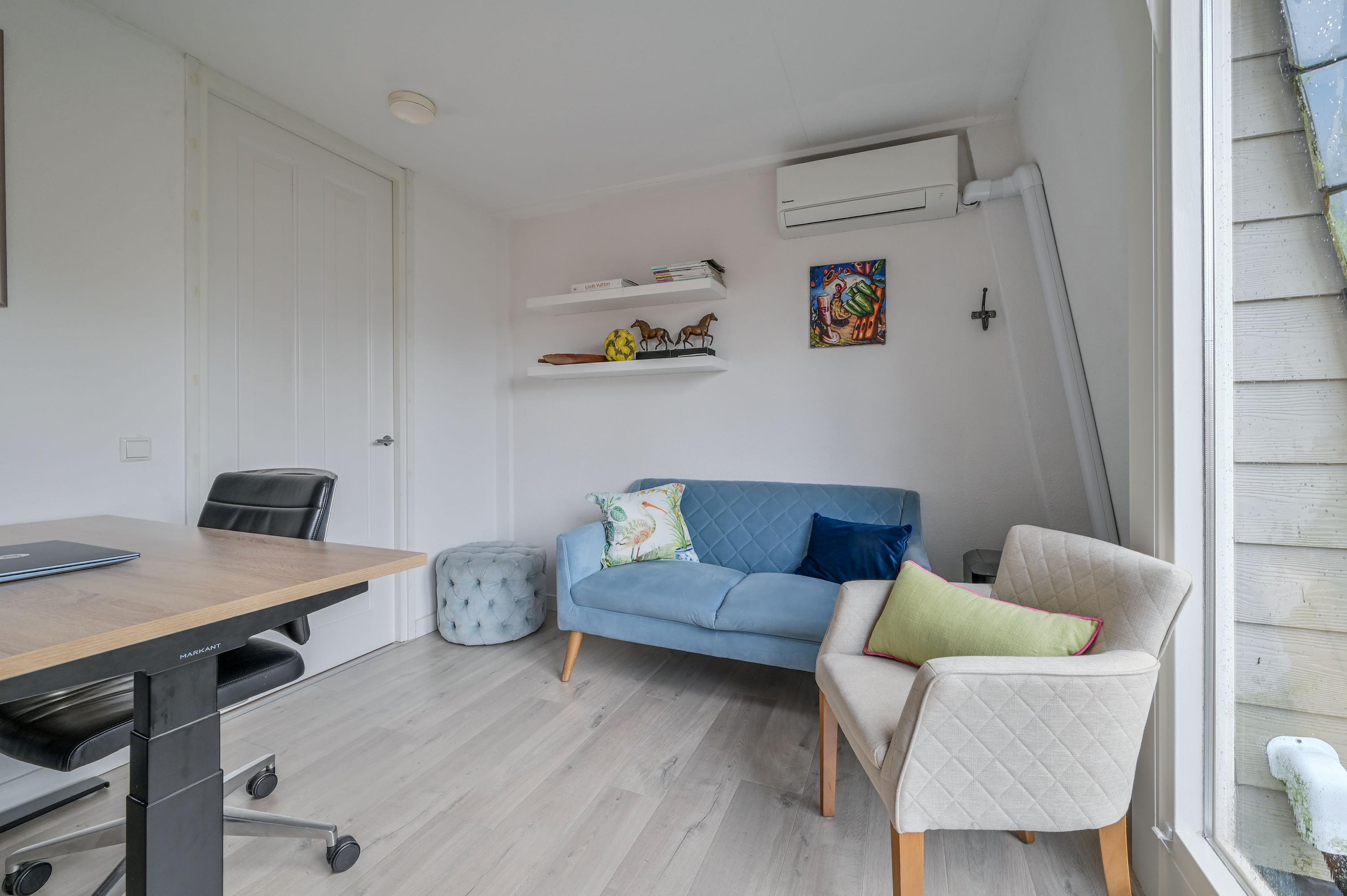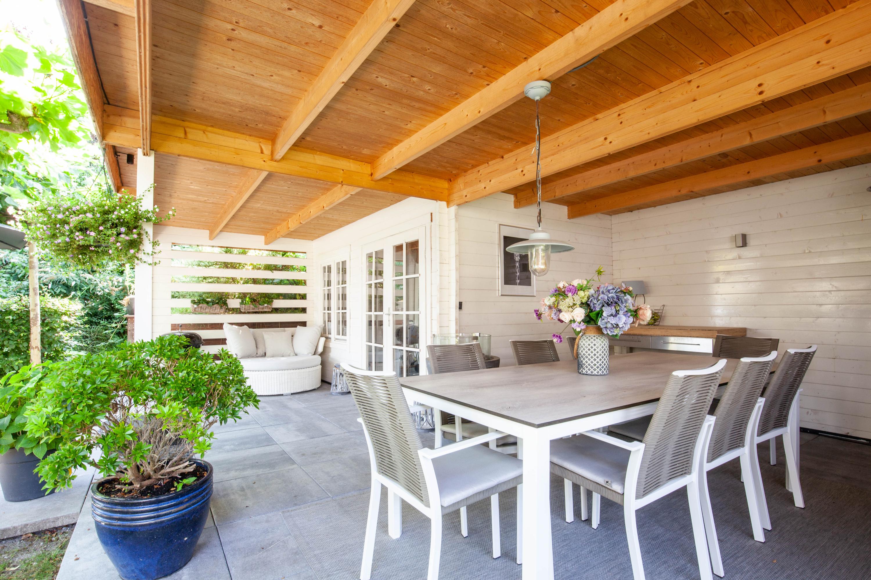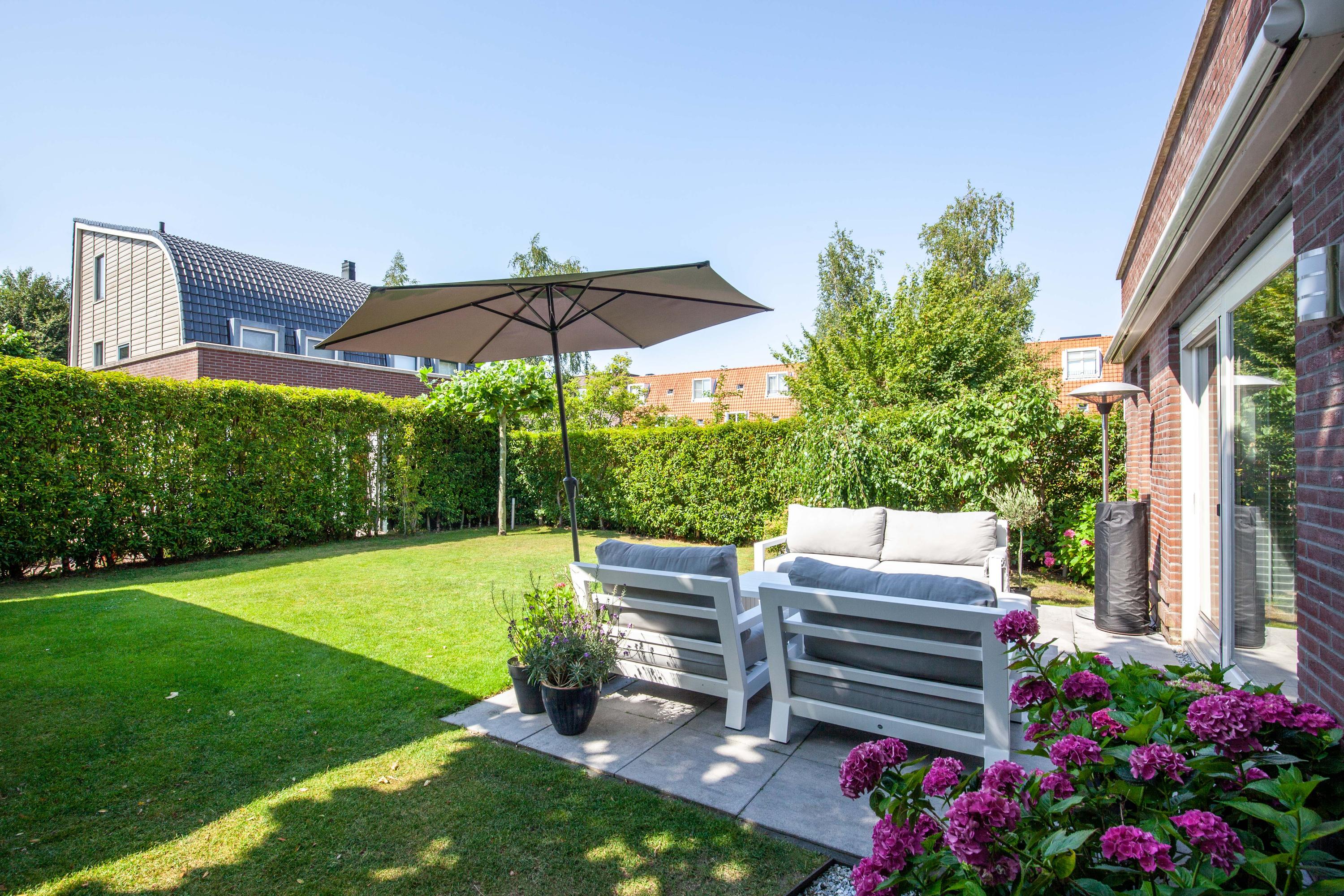 The beautiful garden is a true outdoor paradise, directly accessible via the sliding doors in the living room and via the side of the house through a charming open gate. The garden offers plenty of privacy and enjoys sunlight throughout the day, perfect for enjoying the outdoors. At the rear, there is a spacious terrace with a cozy seating area, complete with an awning spanning the full width of the house, ideal for both sun and shade. At the back of the garden stands a charming garden house with a covered area, perfect for a dining area with barbecue. The garden house features a neat wooden floor, electricity, and water, making it perfect as a workspace, hobby room, or for storage. Adjacent to the covered area is an additional terrace with seating, sheltered by a natural canopy of four beautiful plane trees, creating an idyllic spot to relax or entertain guests.