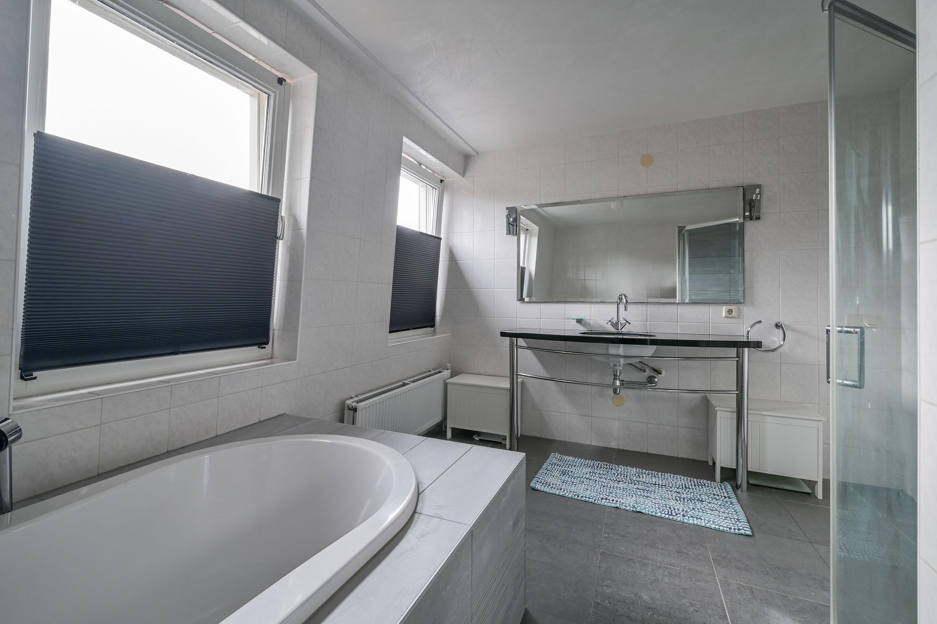The kitchen at the front is bright and spacious, with large windows and a corner window at the dining area fitted with charming shutters – an ideal spot for cozy meals. The country-style kitchen features a central island with an induction hob and practical drawers on both sides, complemented by an elegant wine rack. The L-shaped countertop provides ample space and is equipped with luxury built-in appliances, including a grill plate, fryer with extractor hood, and built-in food processor. At the window side, there is the sink area with a double sink, Quooker, and dishwasher. A large cabinet wall with a combination microwave, additional oven on the other side of the kitchen, and space for a large double fridge/freezer with ice machine (available for takeover) completes the setup. Under the stairs, there is also a convenient cupboard for coats and extra storage.