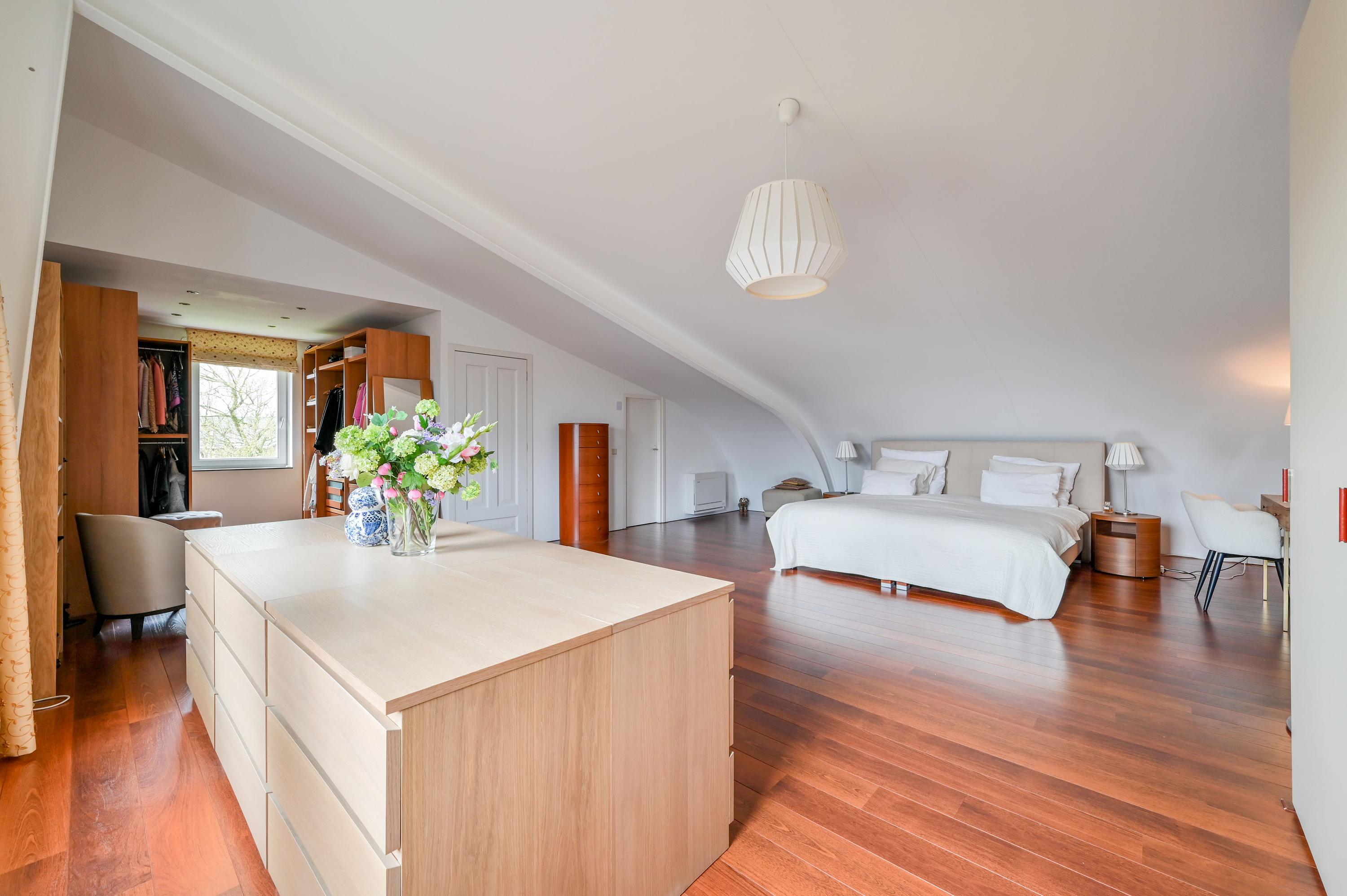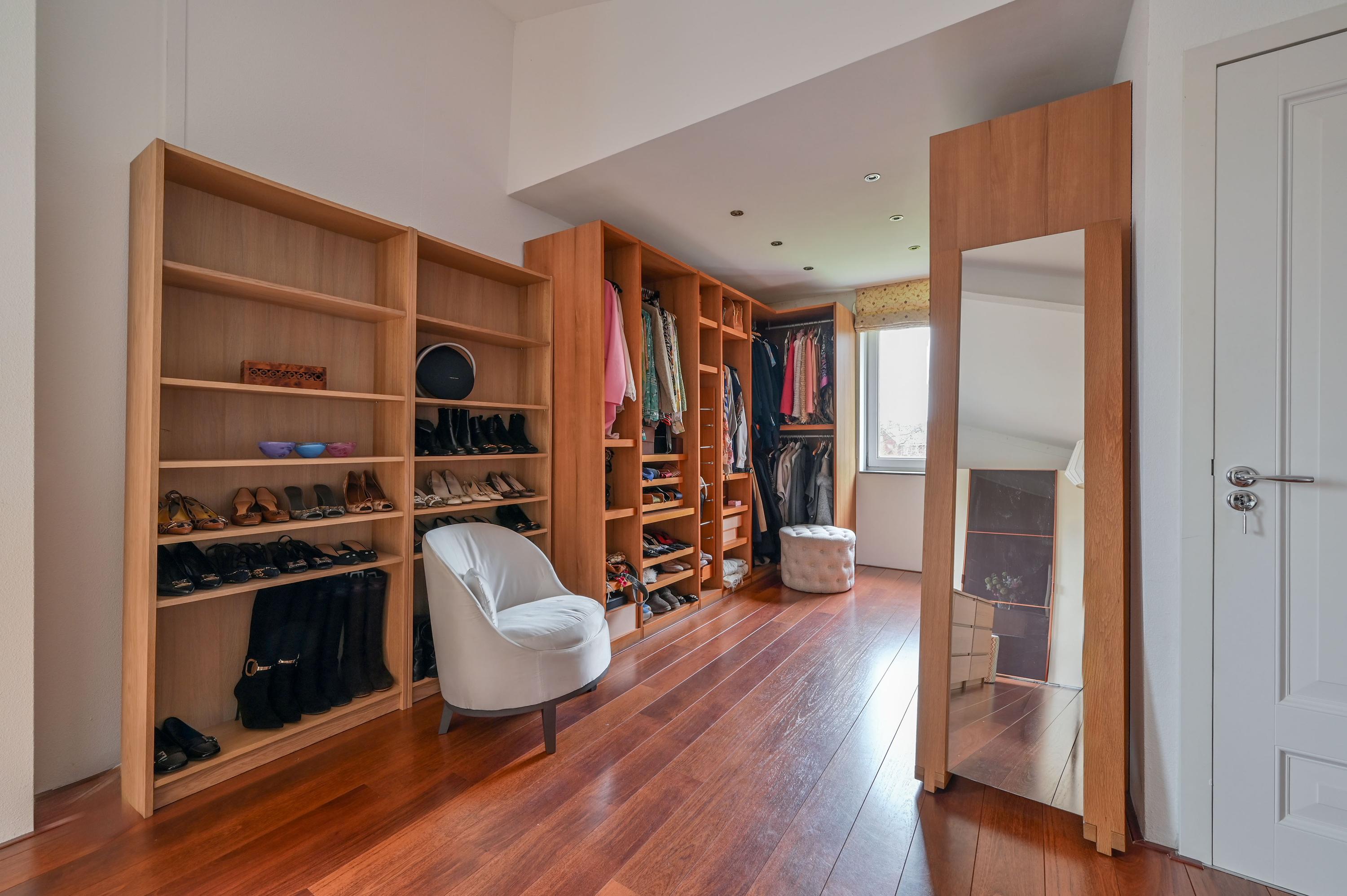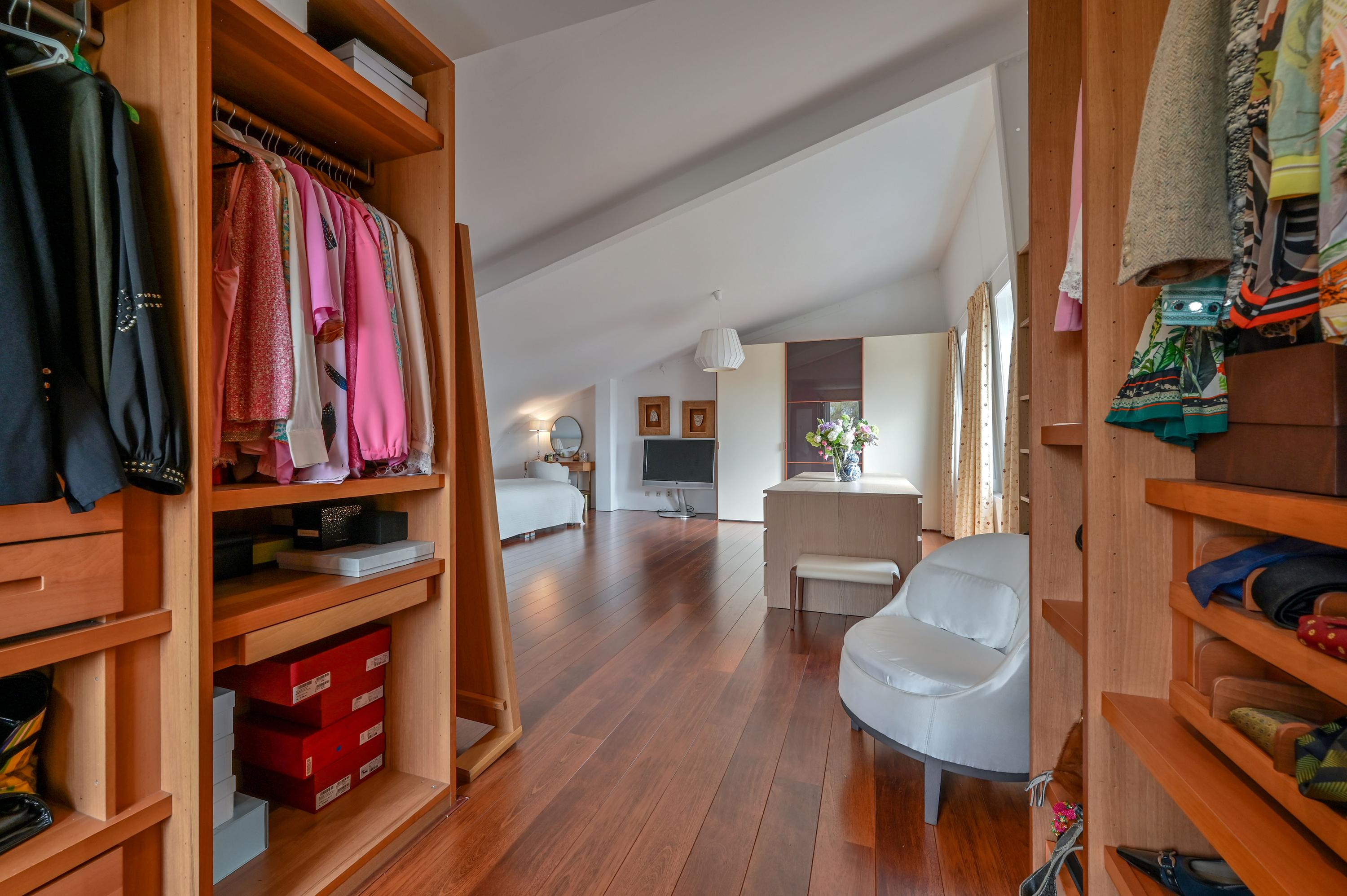 Via an open staircase, you reach the second floor, where the master suite is a true showstopper. This spacious room offers plenty of options for a luxurious and practical layout. The room features an open walk-in closet with a window overlooking the side garden, and a built-in wardrobe – both from the Italian brand Poliform – ensuring stylish and efficient storage. Two front windows and the side window provide ample natural light and are fitted with sunscreens. Laminate flooring and air conditioning complete the space. Due to its generous size, this floor also offers potential to add two attic rooms. Additionally, there is a spacious storage room with central heating and mechanical ventilation unit, ideal for extra storage and practical facilities.