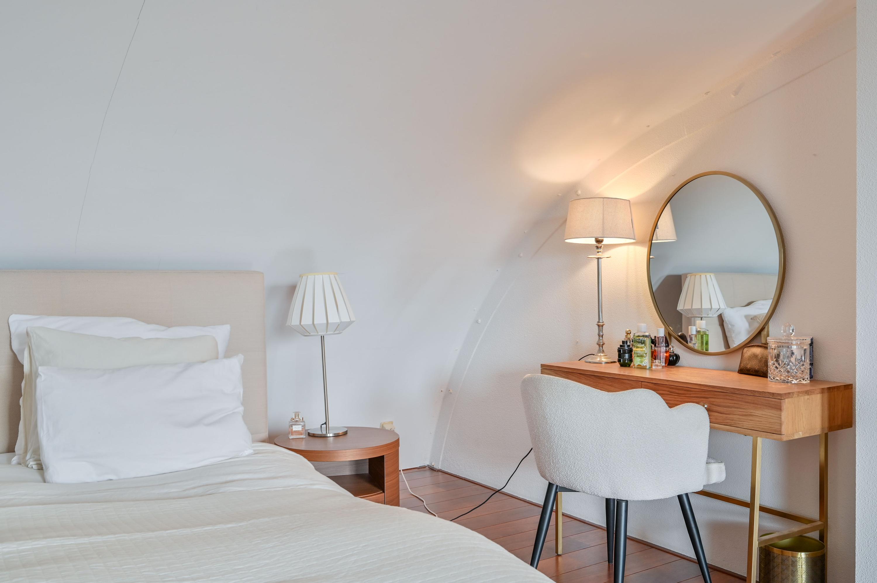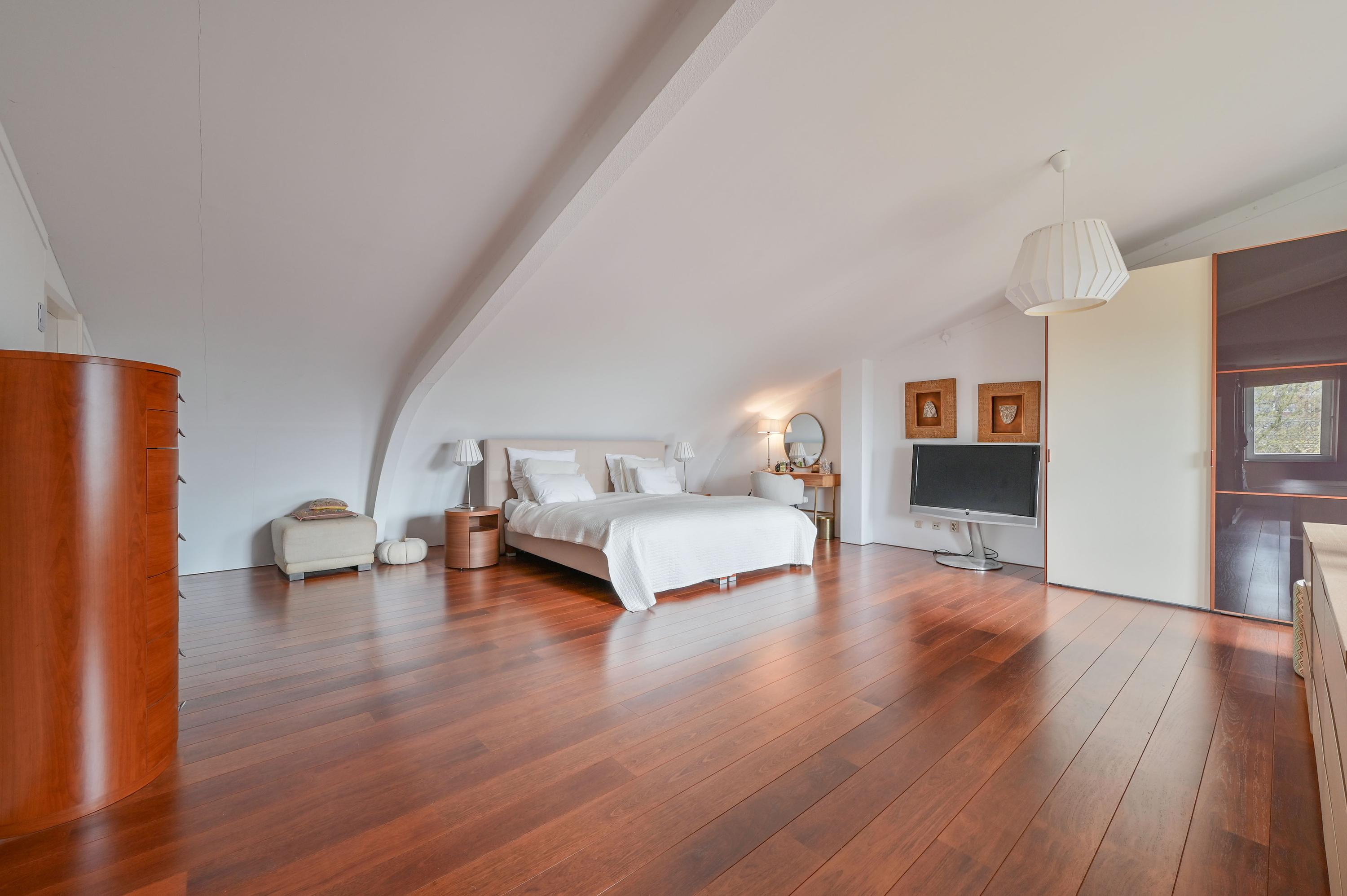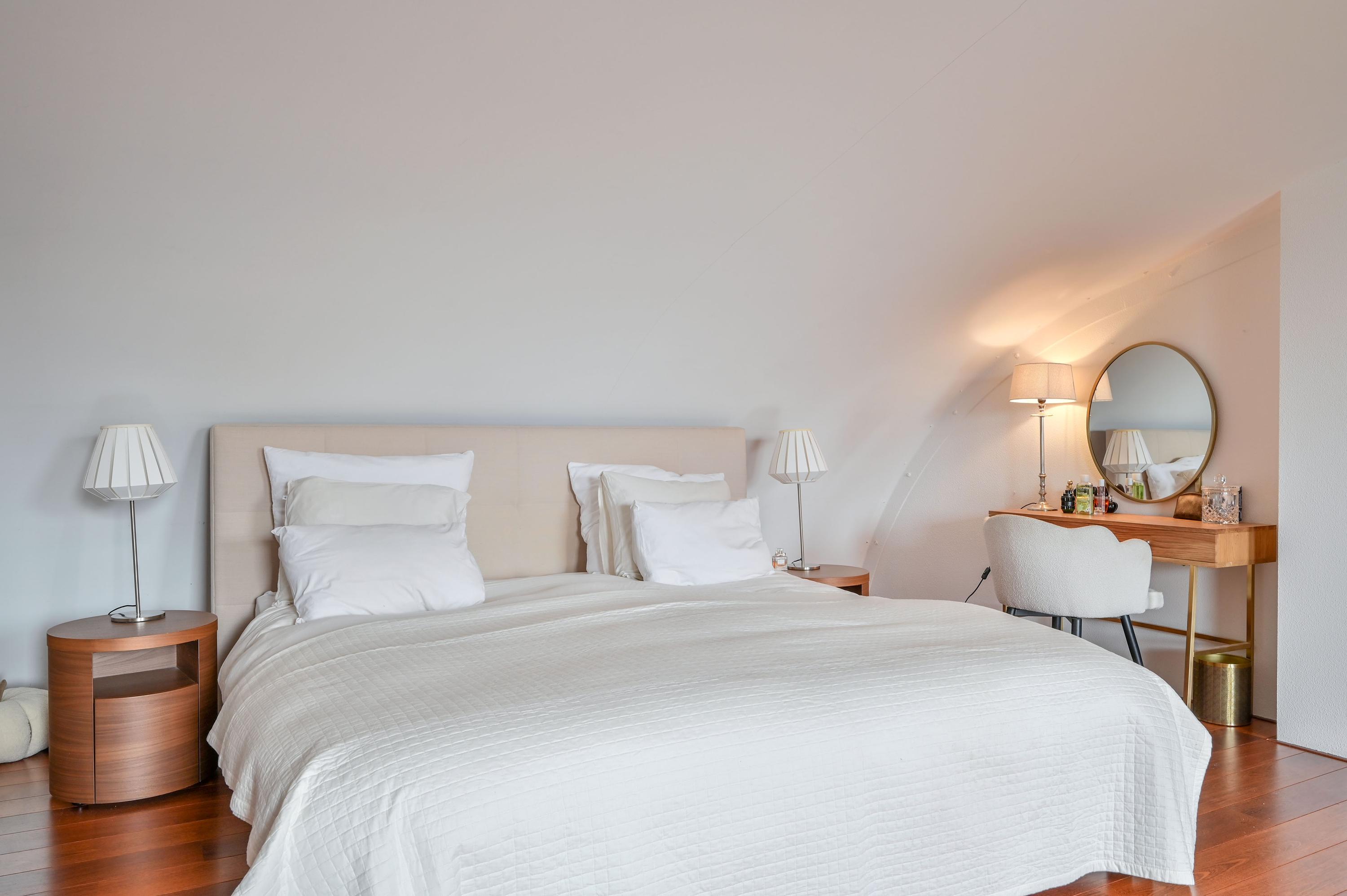 Via an open staircase, you reach the second floor, where the master suite is a true showstopper. This spacious room offers plenty of options for a luxurious and practical layout. The room features an open walk-in closet with a window overlooking the side garden, and a built-in wardrobe – both from the Italian brand Poliform – ensuring stylish and efficient storage. Two front windows and the side window provide ample natural light and are fitted with sunscreens. Laminate flooring and air conditioning complete the space. Due to its generous size, this floor also offers potential to add two attic rooms. Additionally, there is a spacious storage room with central heating and mechanical ventilation unit, ideal for extra storage and practical facilities.