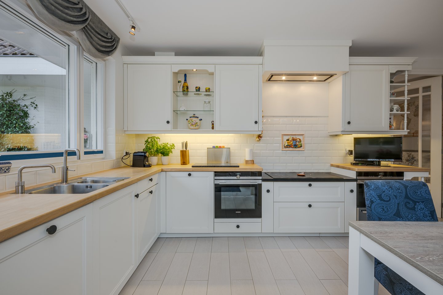 The spacious kitchen is equipped with various appliances and offers plenty of space for cooking and dining together. From the hall you have access to the garage with electric door, where also the connection for washing equipment is realized.