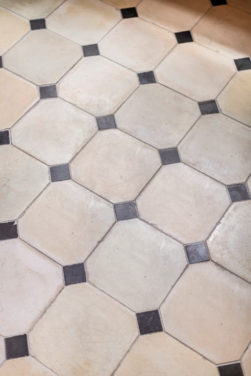 The generous hallway sets the tone right away: high ceiling, a combination of classic tiles and sleek walls, elegant staircase, panelled doors, and an authentic feel. From here you access various rooms, including the living room, dining room, WC with washbasin, and the kitchen.