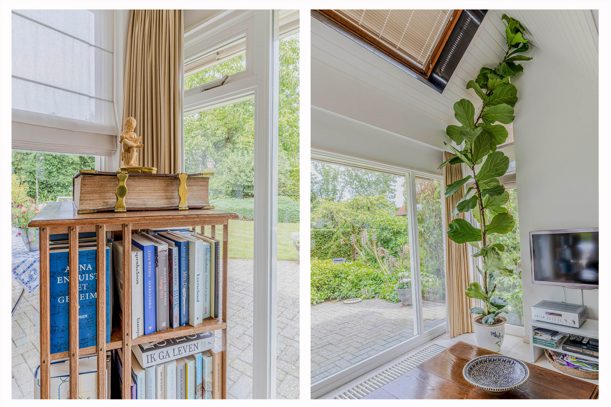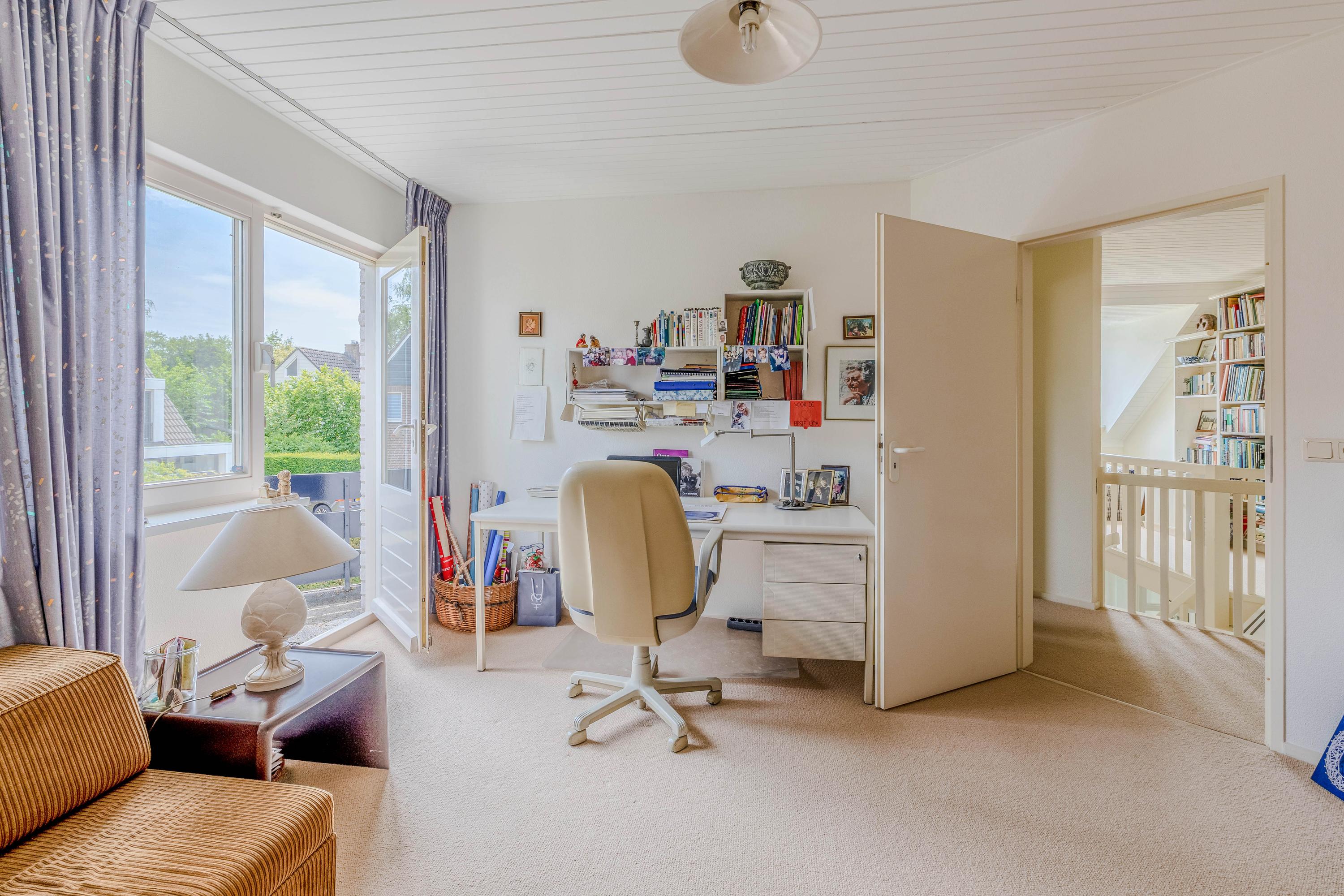 Enjoy a bright and spacious living room of 62 m² with a beautiful view of the landscaped garden. The living room features a bay window, a TV corner with striking architecture highlighted by a roof window, and a fireplace.