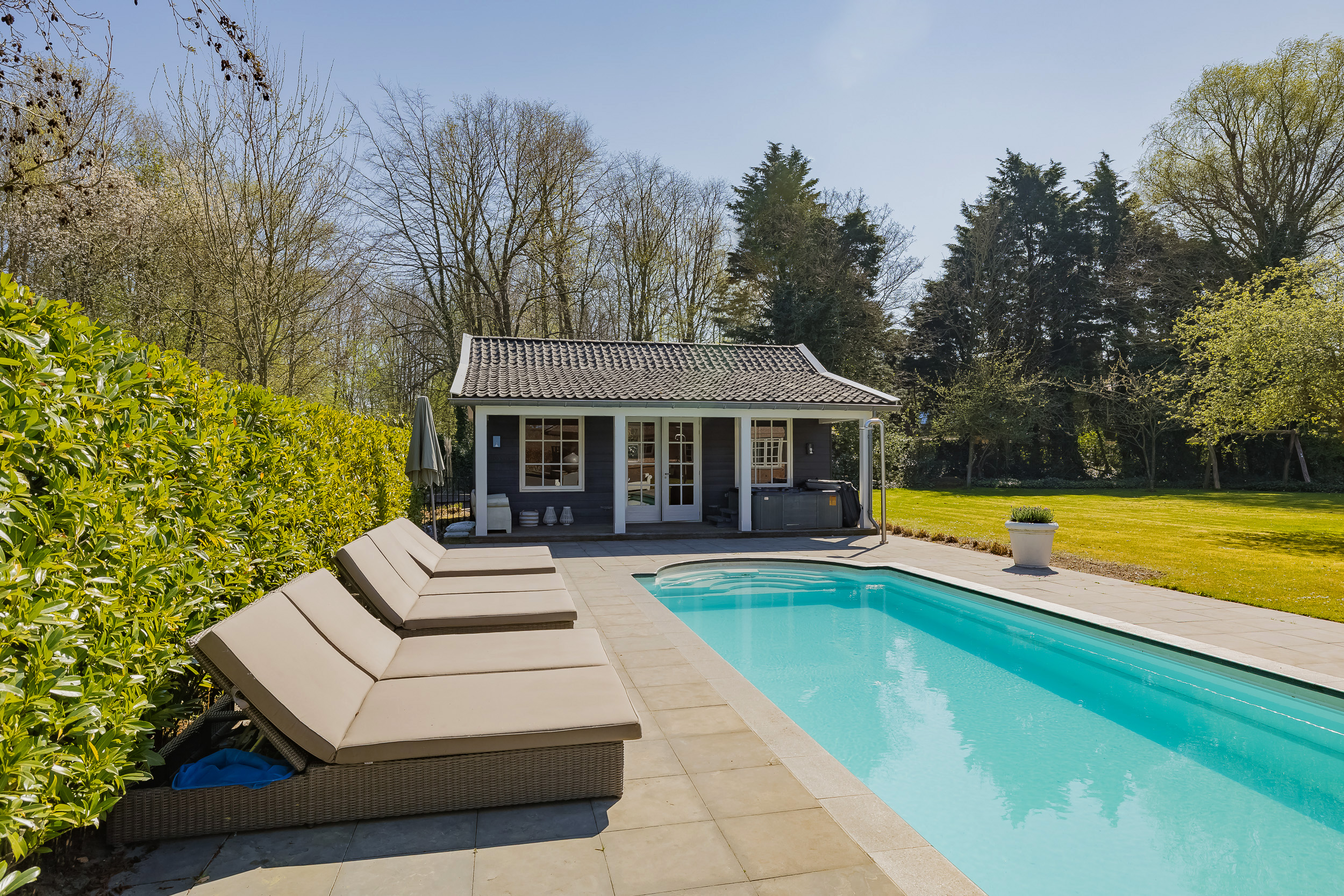 At the front of the house you will find a spacious veranda and there is a large terrace, at the rear, ideal for outdoor dining or enjoying the serene surroundings. The spacious outdoor pool offers cooling and luxury on hot days, and the adjacent pool house with storage room, shower and toilet provides additional comfort.