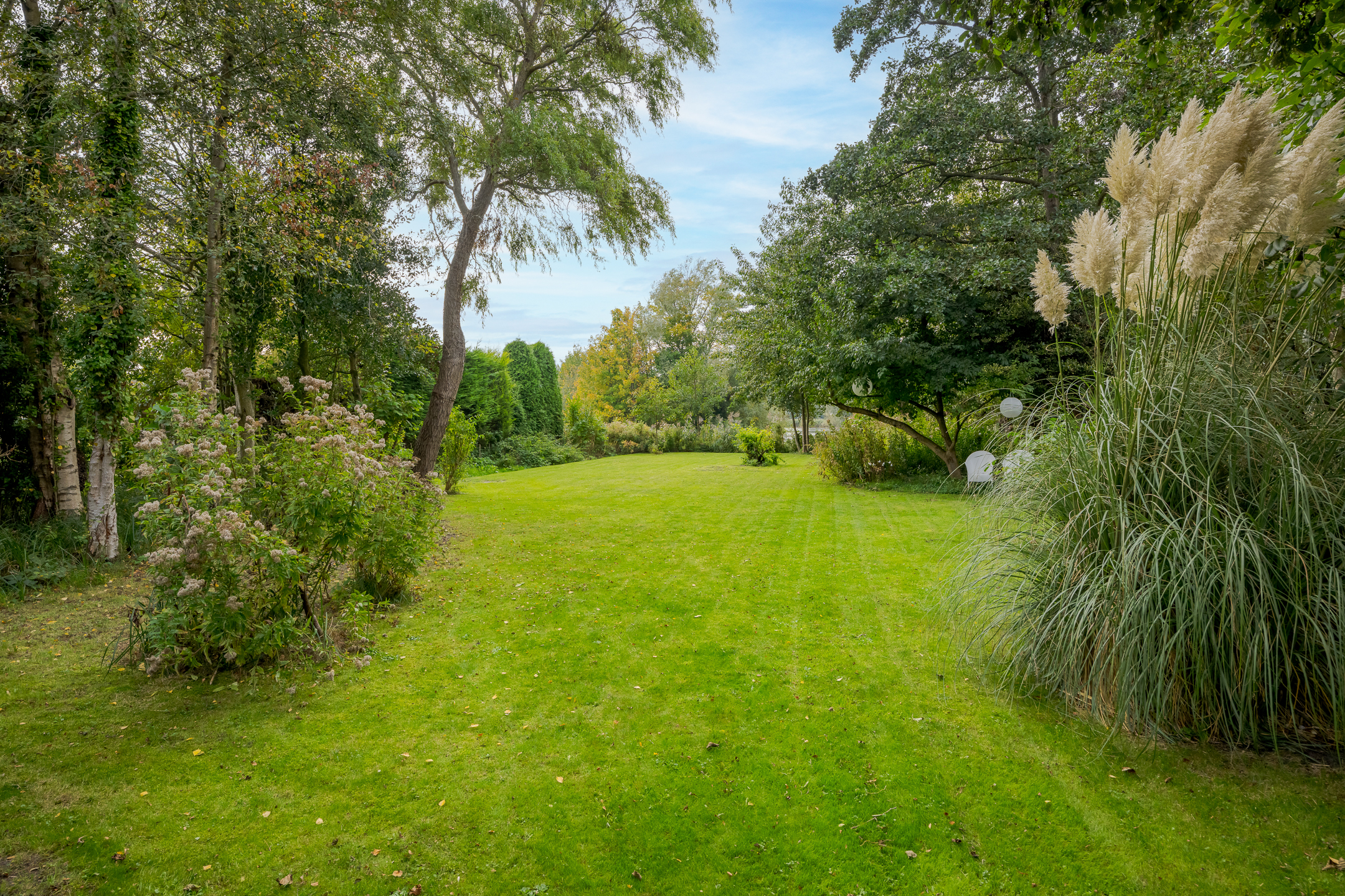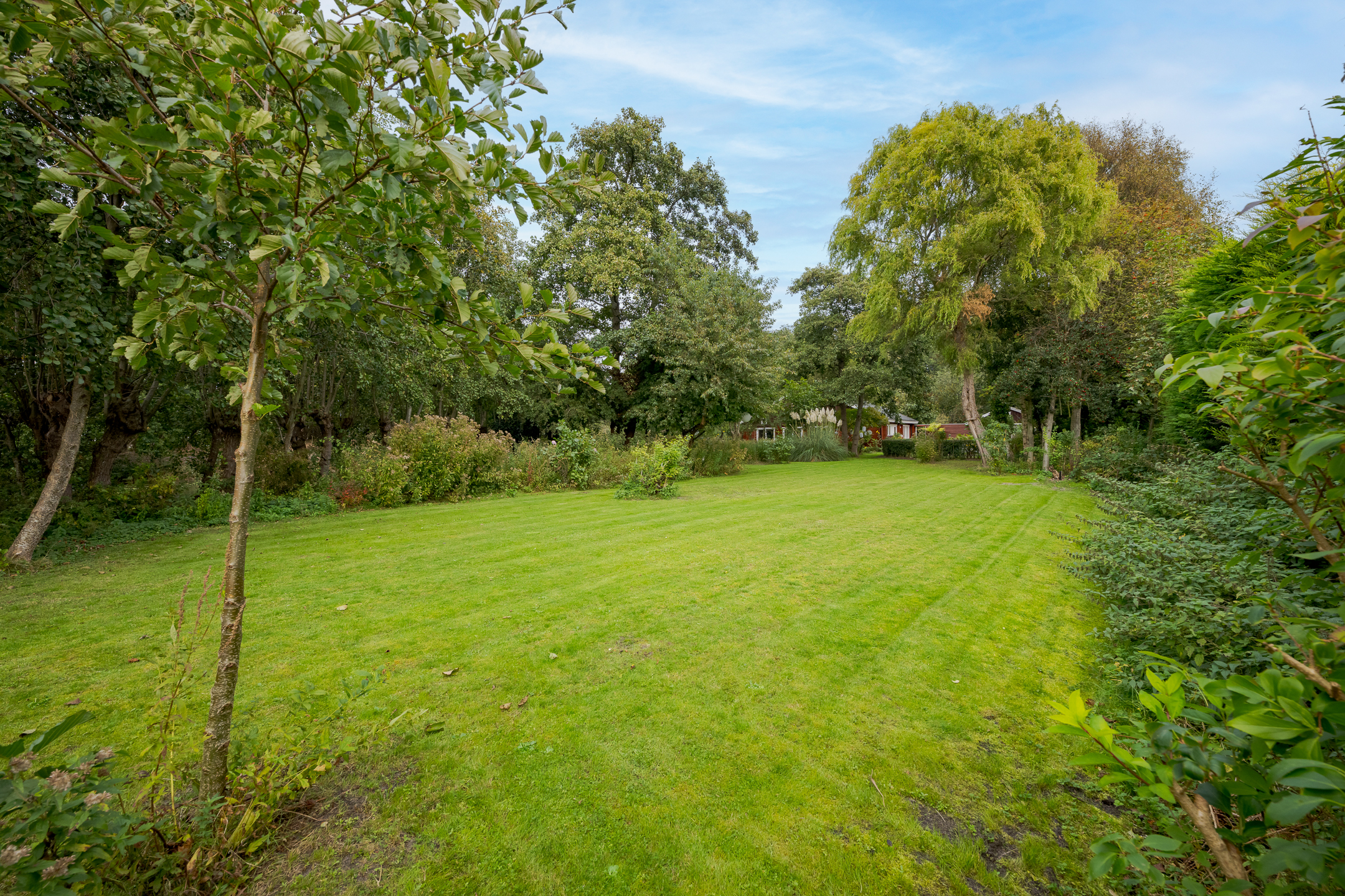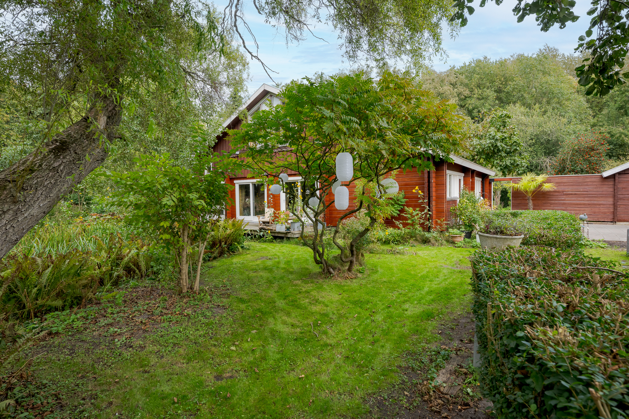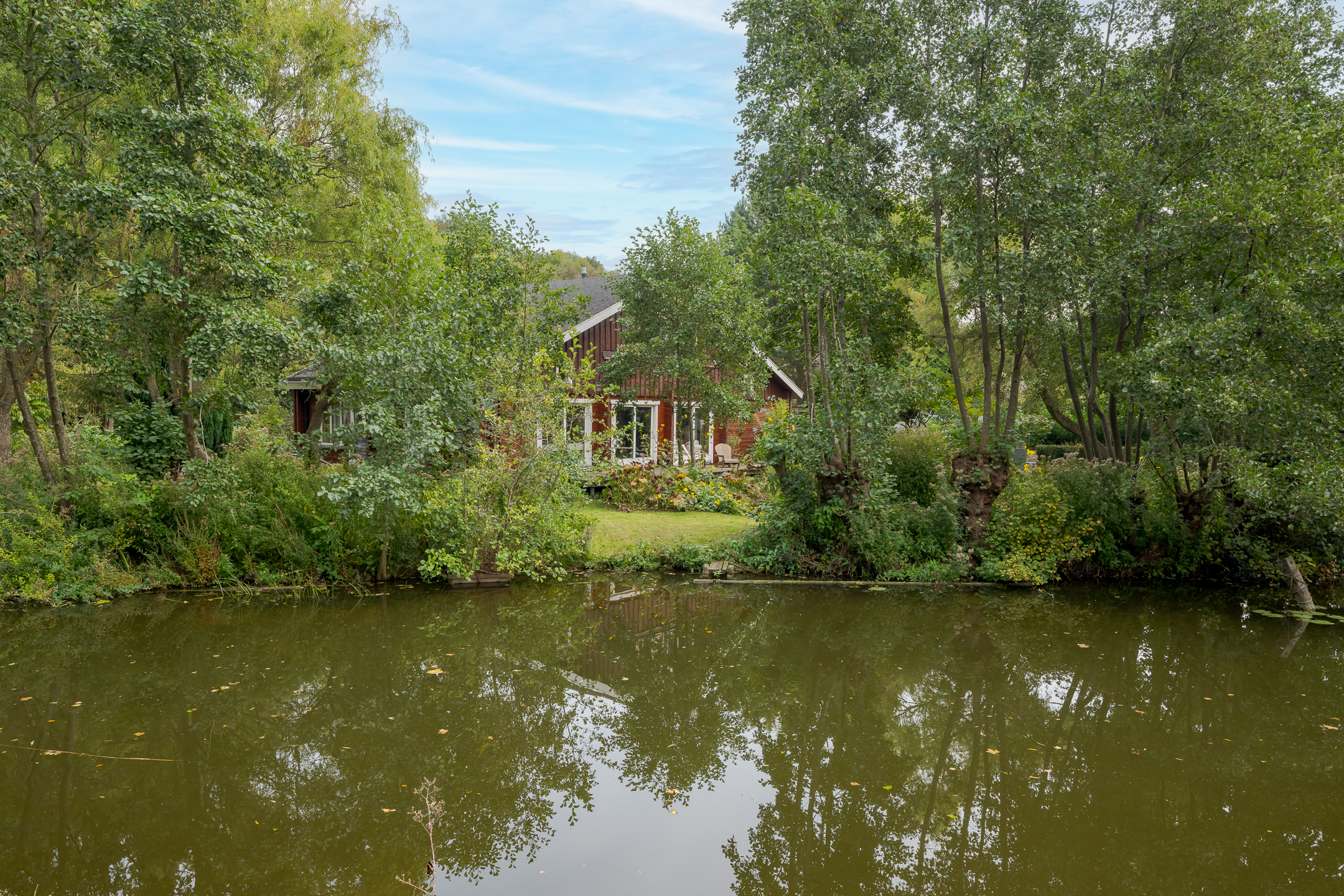 In the front yard, a spacious wooden garage (approximately 6 by 12 meters) sits perpendicular to the house, creating a courtyard with ample parking for several cars. But the real action is behind the house: the garden is over 50 meters deep and borders a tranquil lake with a view of a bird island.