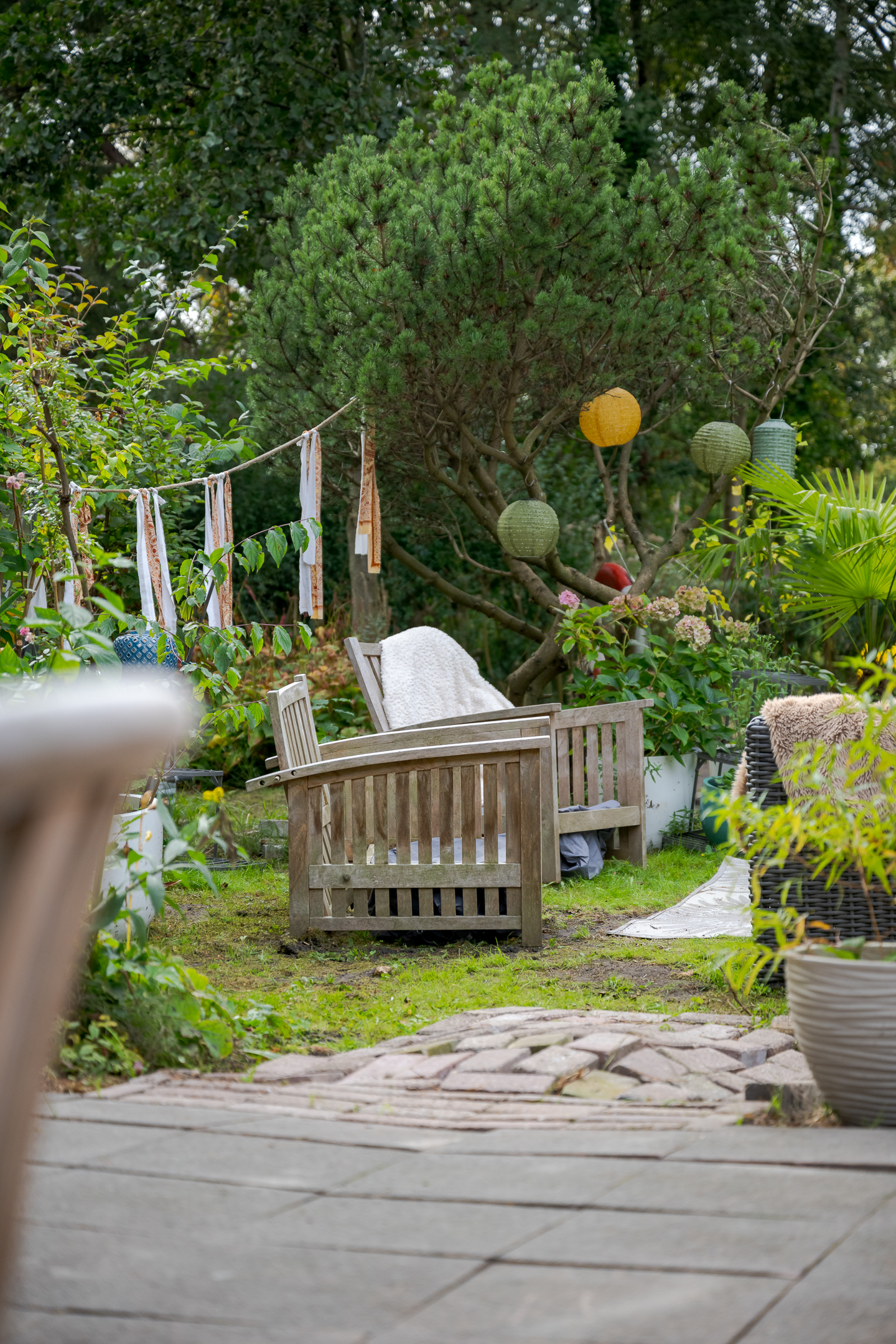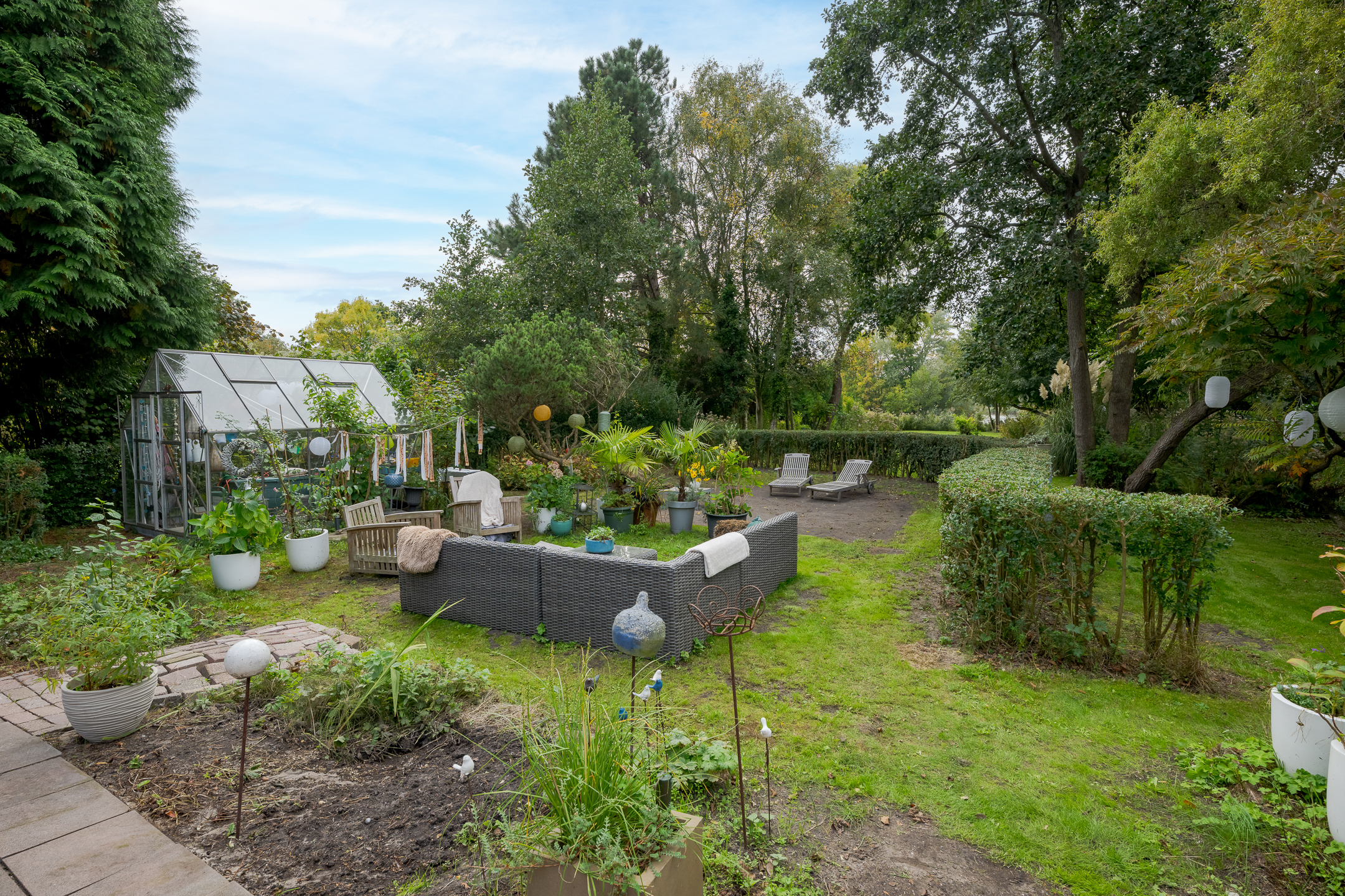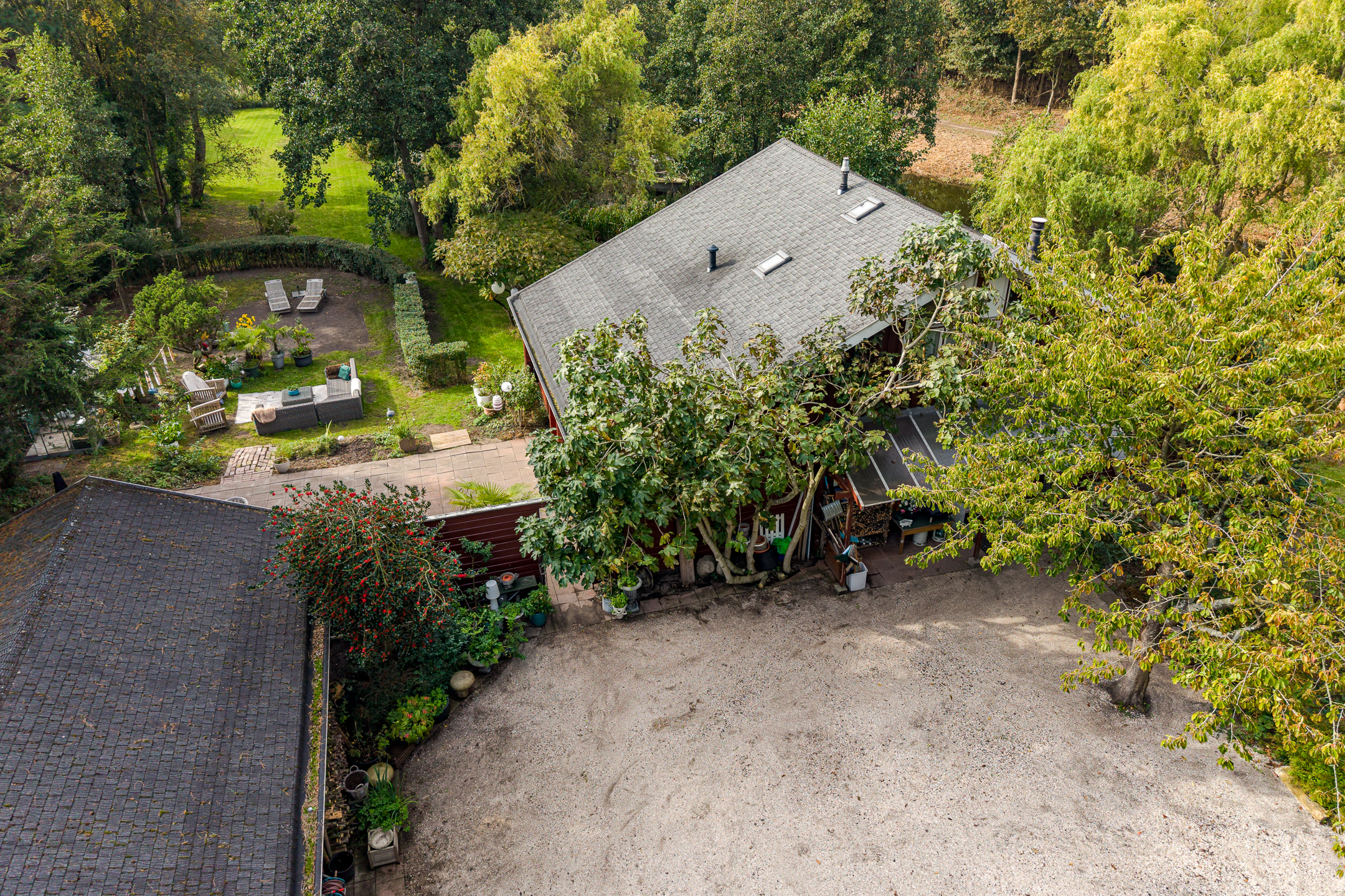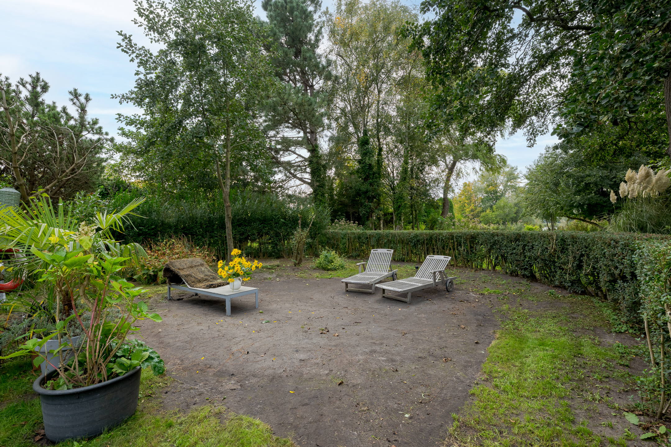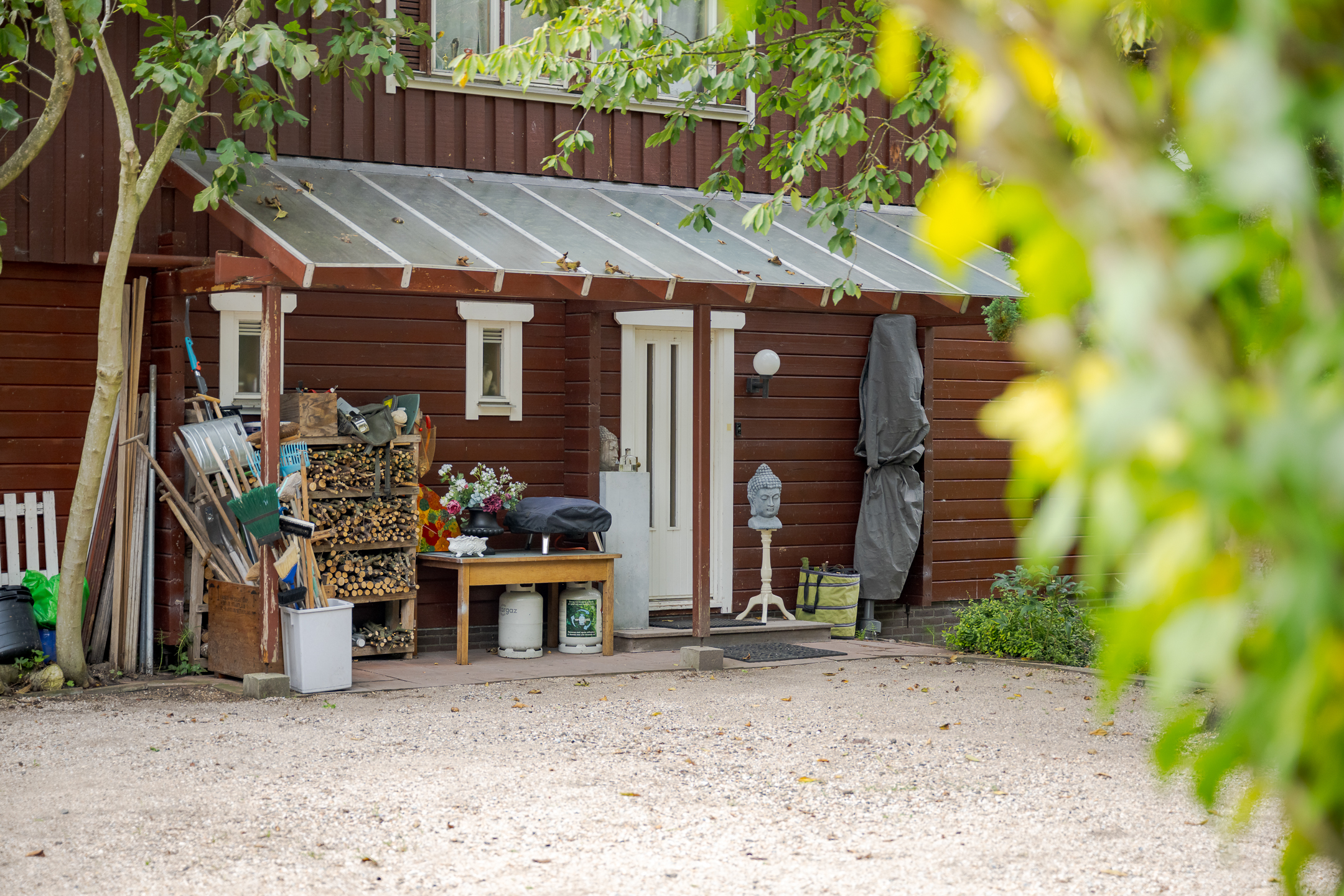 In the front yard, a spacious wooden garage (approximately 6 by 12 meters) sits perpendicular to the house, creating a courtyard with ample parking for several cars. But the real action is behind the house: the garden is over 50 meters deep and borders a tranquil lake with a view of a bird island.