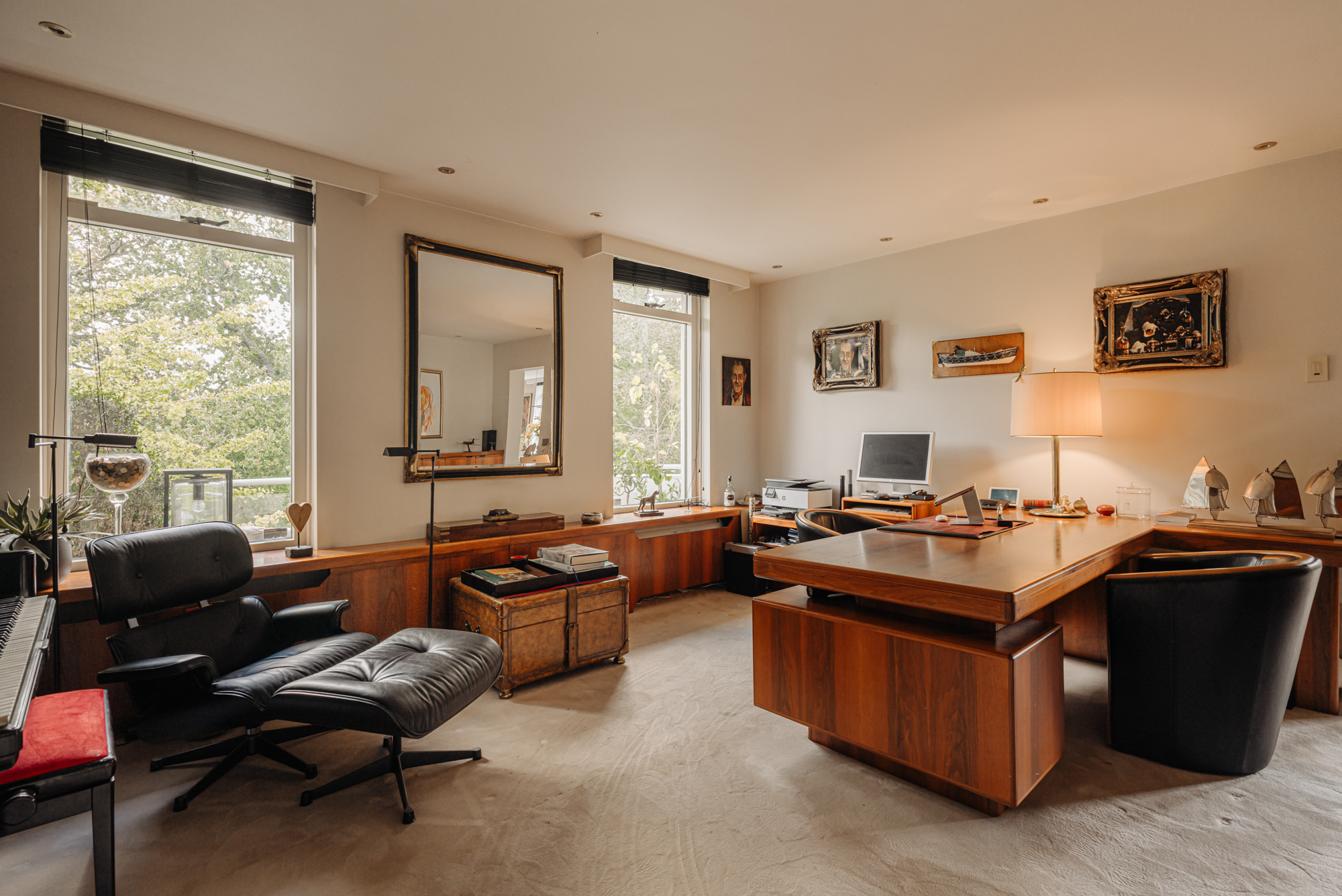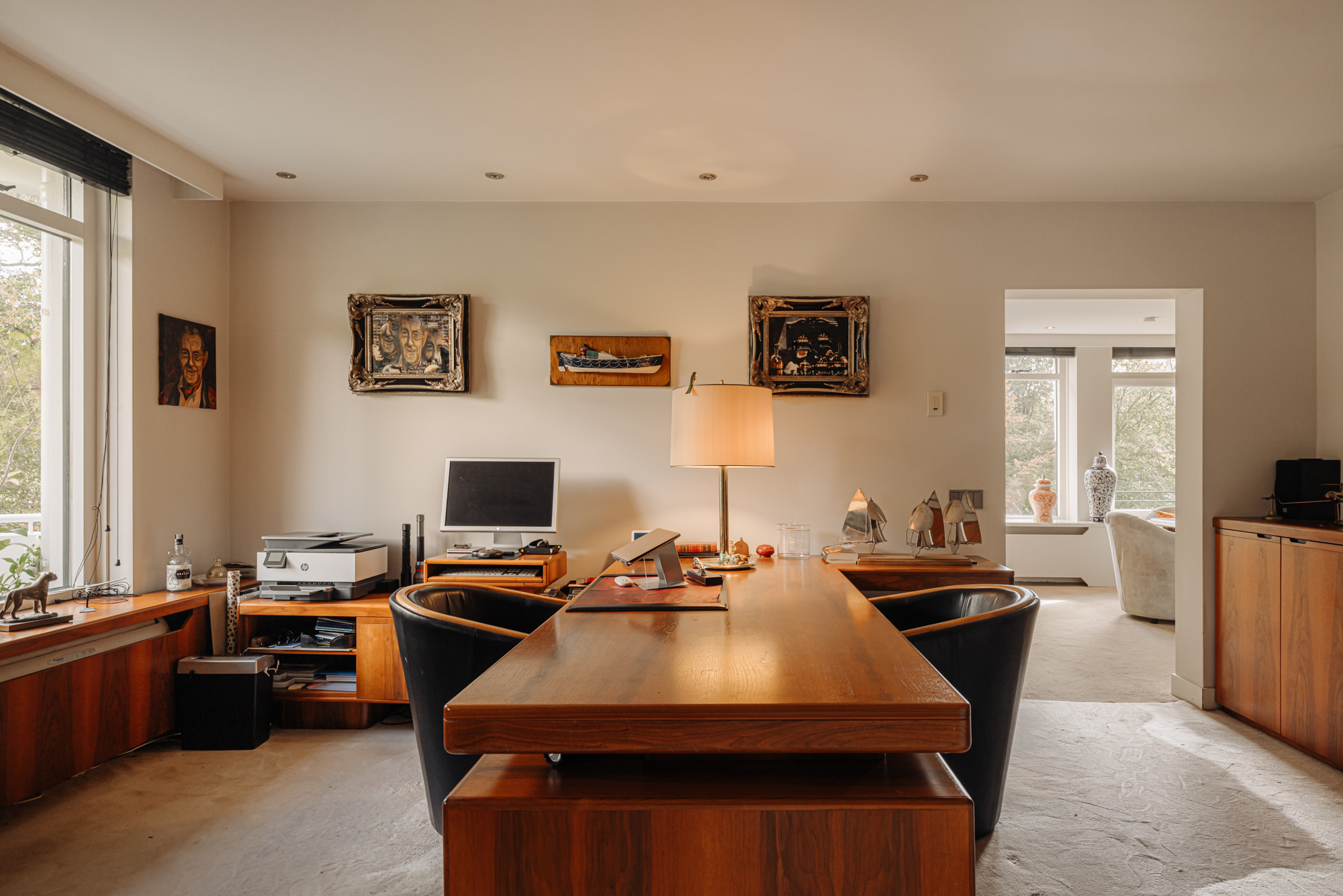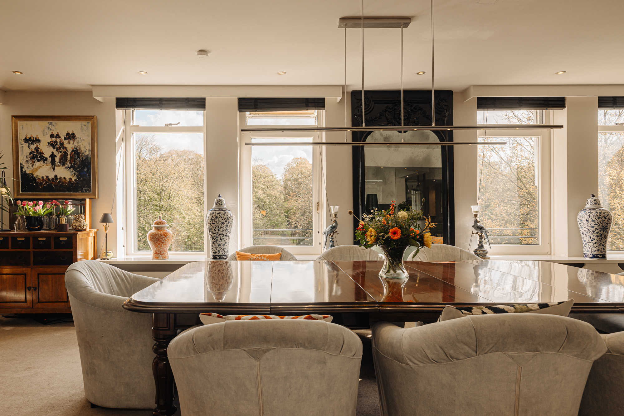 Beautifully situated 4-room penthouse (approx. 265 m² living space) with large balconies on the third floor of a small apartment complex on the Rust en Vreugd Estate. Originally two apartments, it was completely renovated and redesigned in 2009. You will find high-quality materials and luxurious details, including a custom-made interior and air conditioning. There are also two parking spaces and a storage unit in the basement.