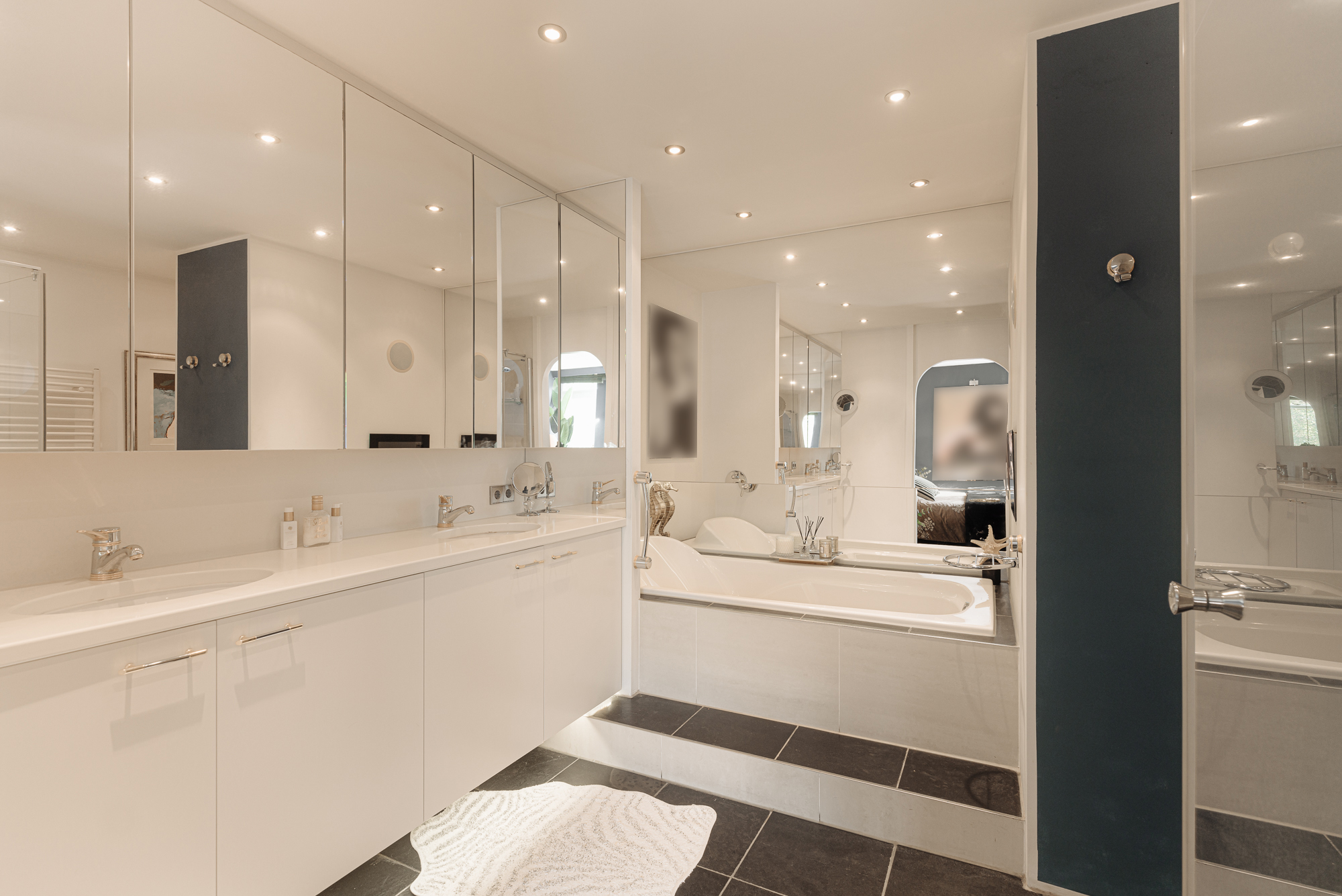 Master bedroom at the rear has an ensuite bathroom with a steam shower, spacious bathtub and double vanity. The second bedroom at the front also has its own bathroom.