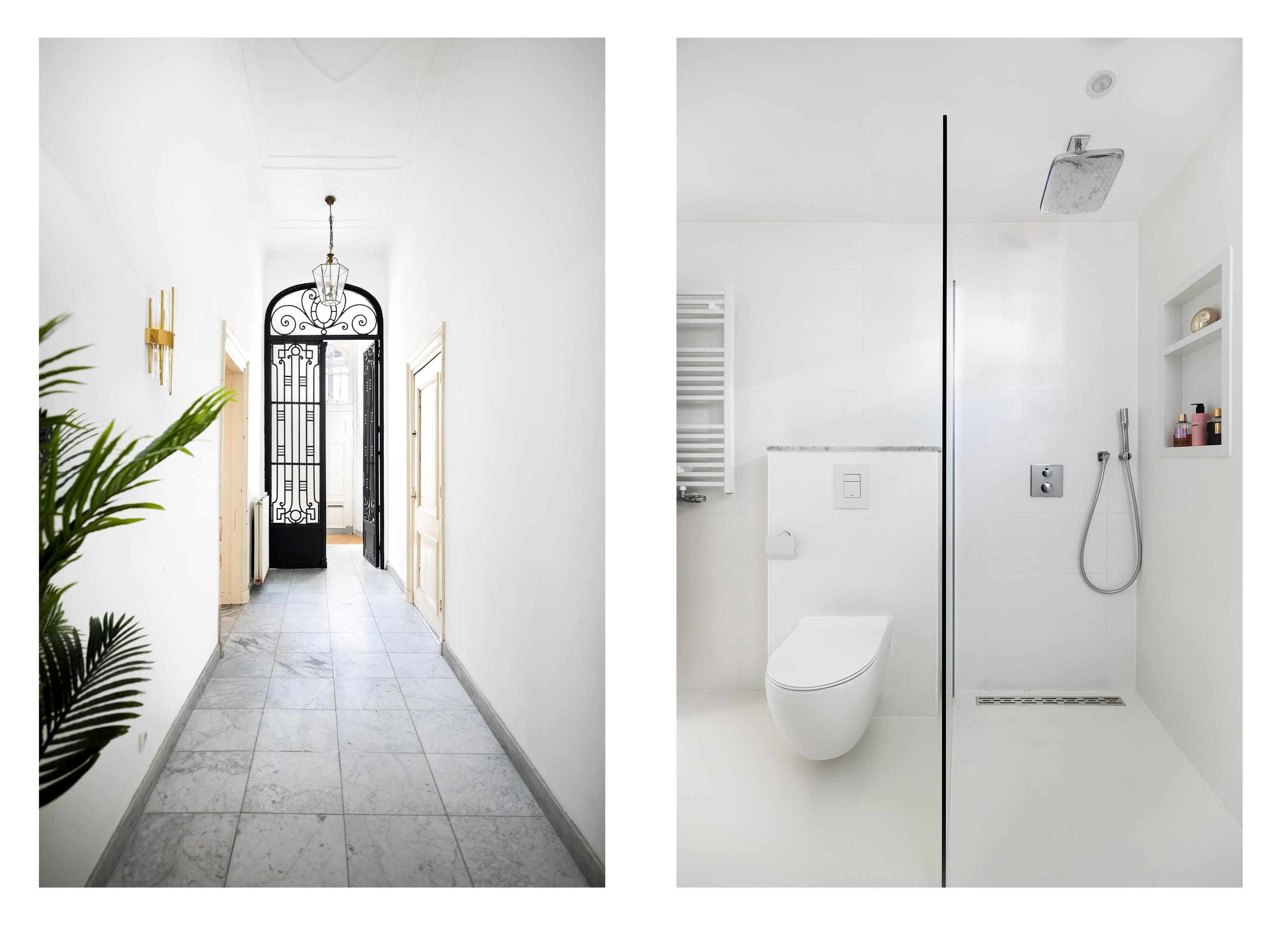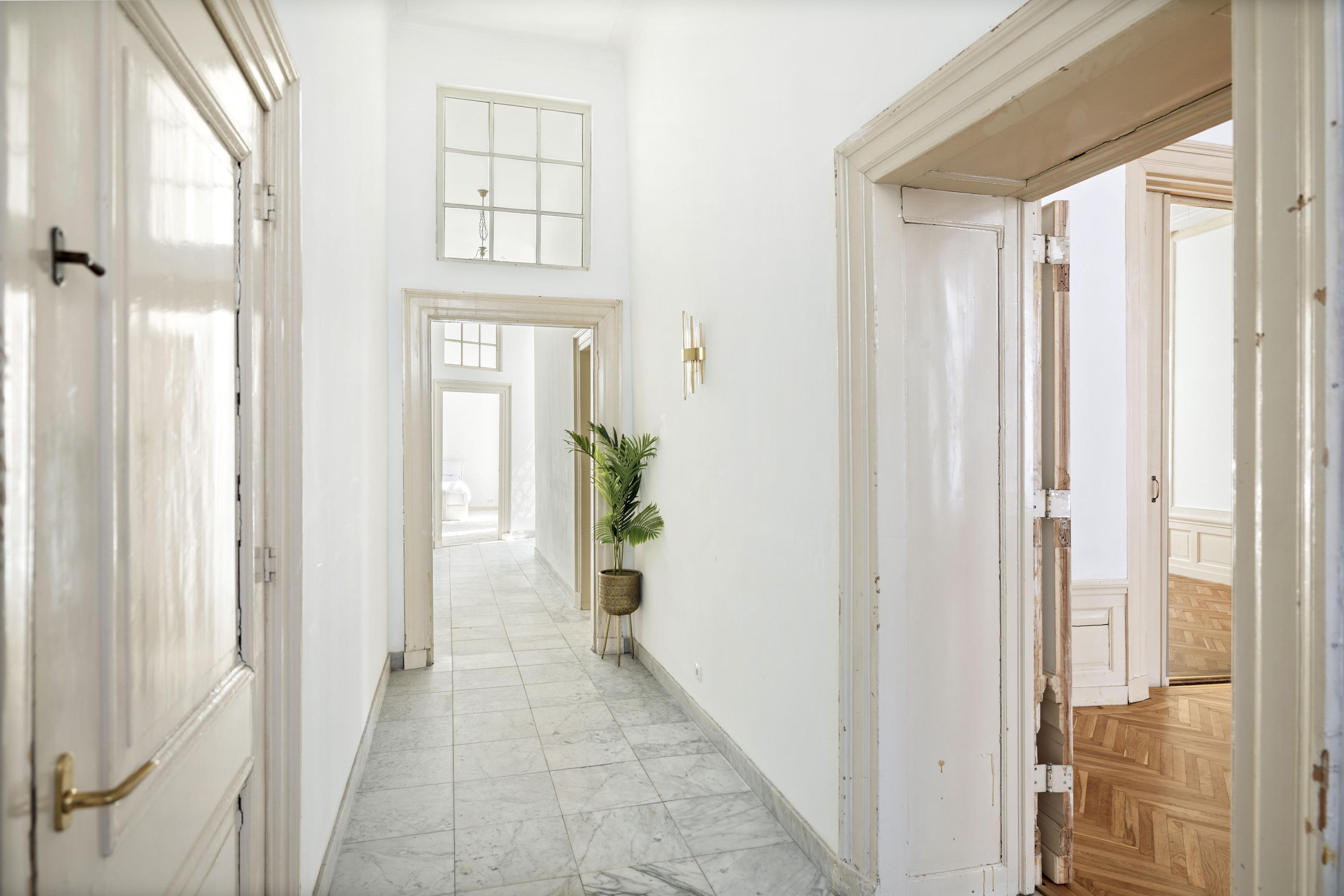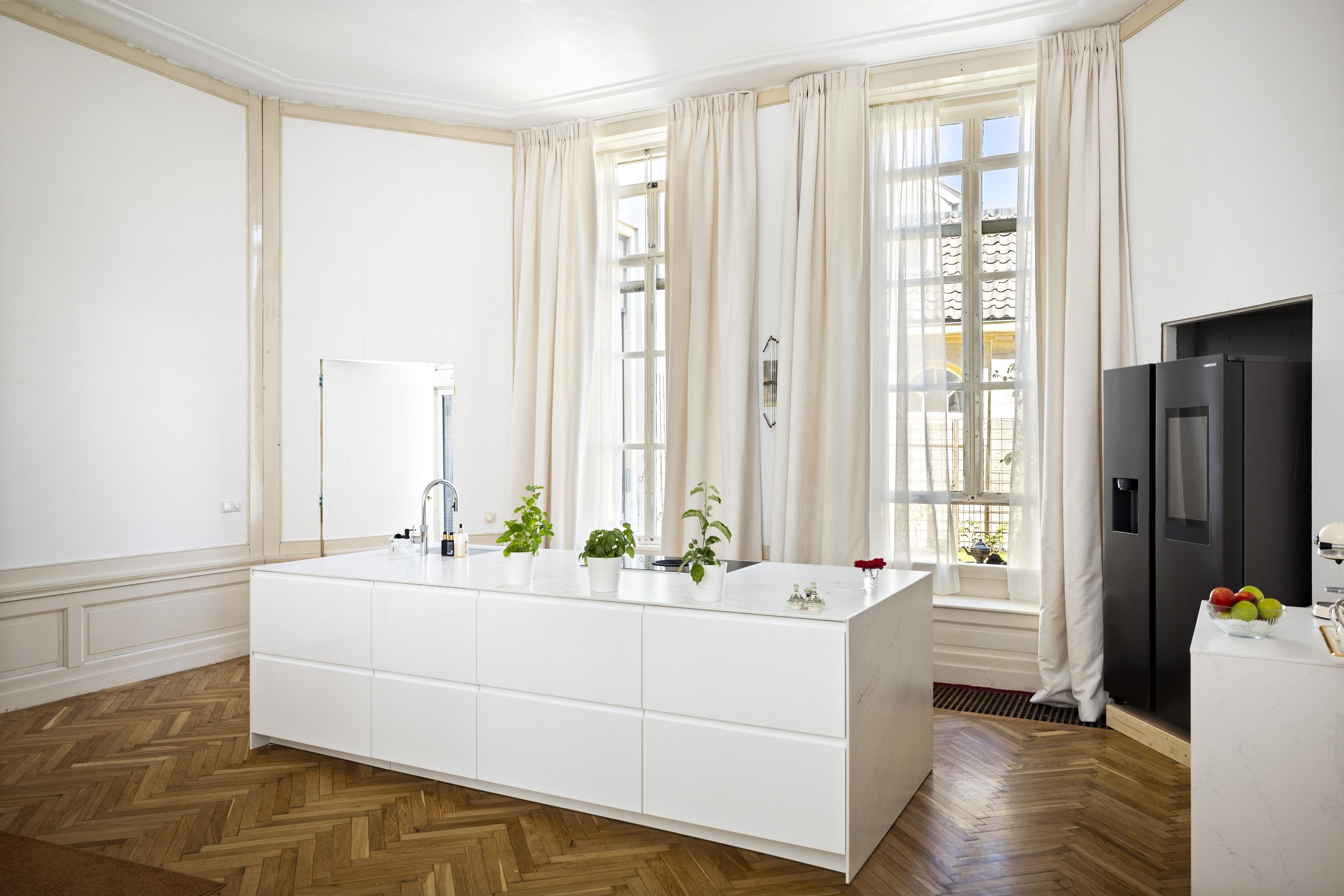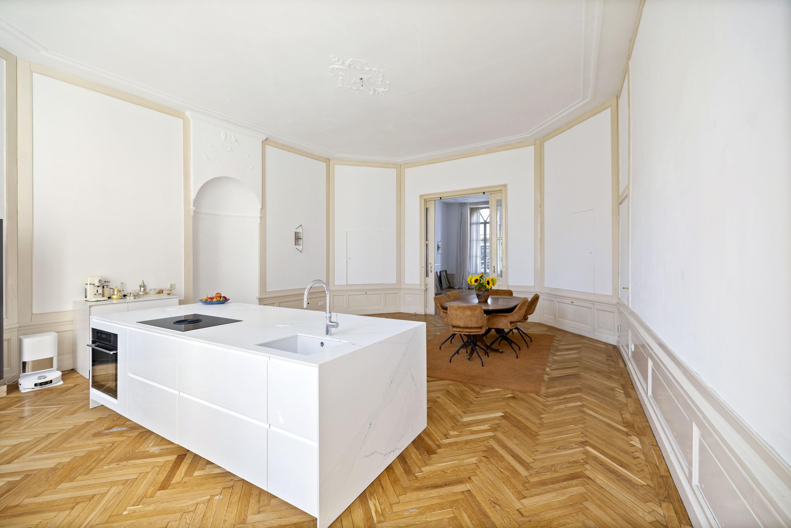 Past the classic double entrance, the vestibule greets you with a marble floor and abundant daylight. A combined living room and kitchen of nearly 100 m² anchor the main floor. The living room, at 43 m², features original window benches and a period mantelpiece, while herringbone oak floors establish a warm, graceful rhythm. The kitchen is fitted with white, handle-less cabinetry, high-spec appliances including an induction cooktop with downdraft extraction, and a large fridge-freezer.