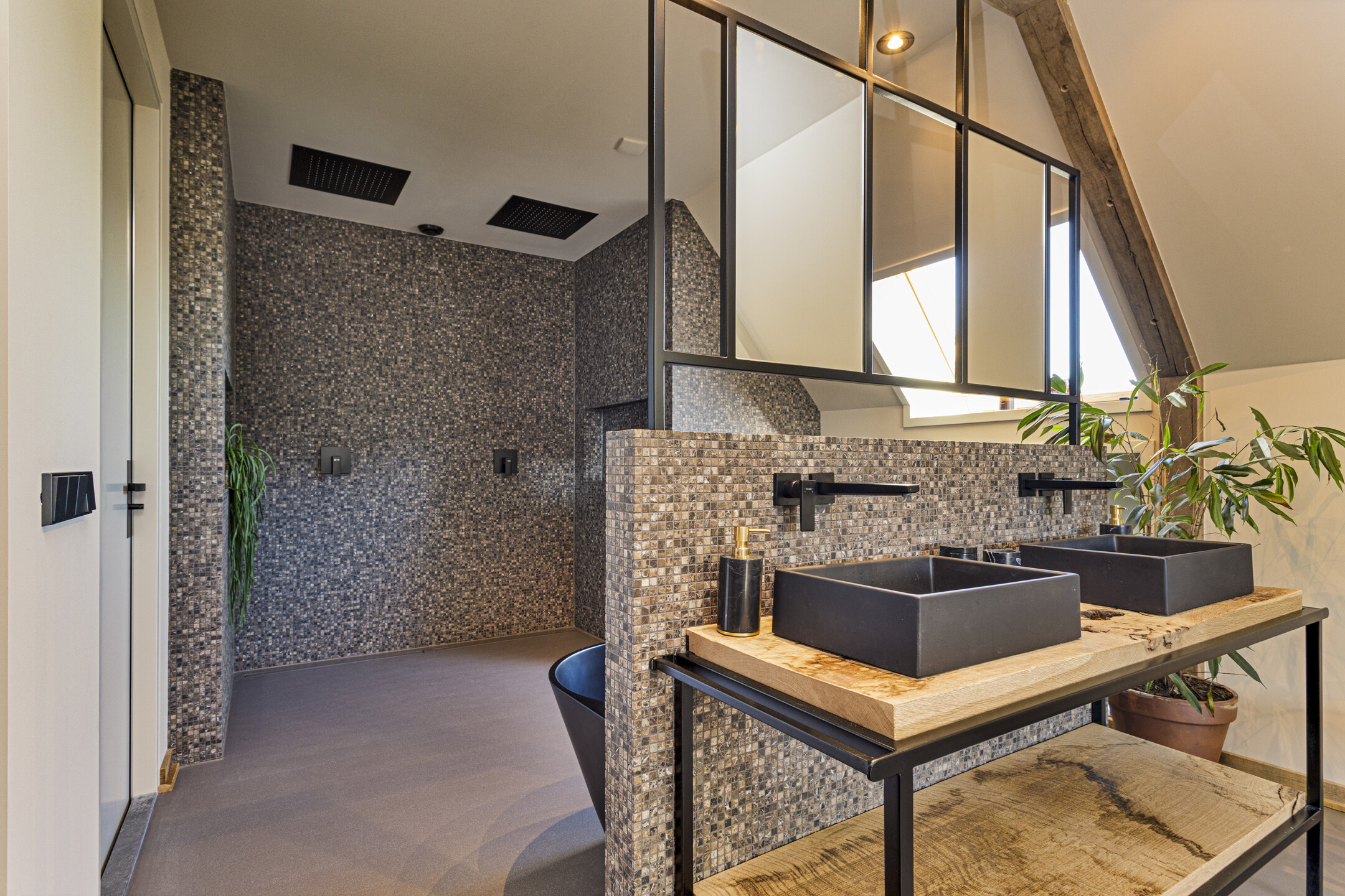 De grote slaapkamer is te bereiken middels de badkamer: met de allure van een exclusief resort, is deze voorzien van een dubbele douche met regendouche, een vrijstaand bad met uitzicht op de tuin, en een grote dubbele wastafel.