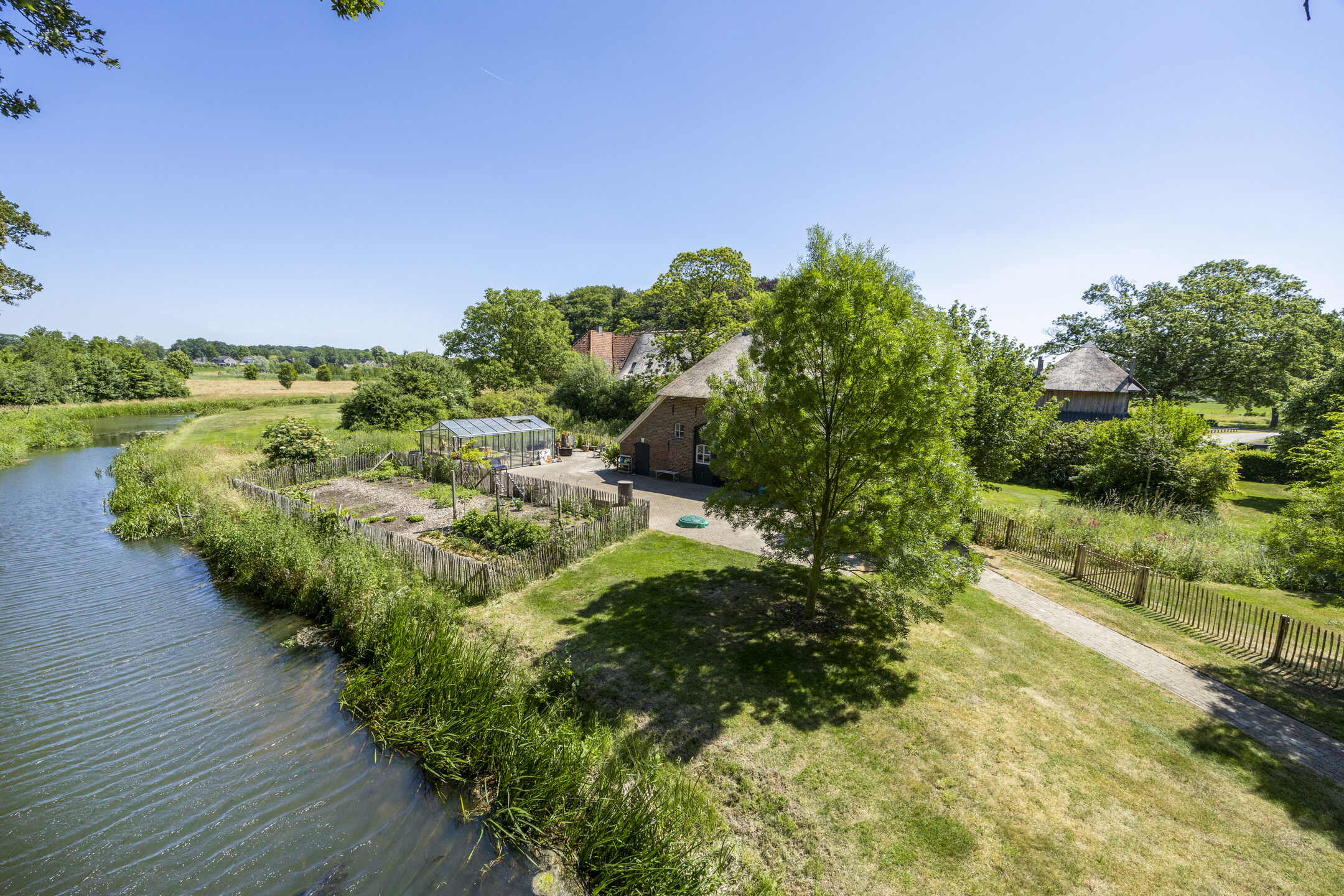 Na een lang leven – eeuwenlang – werd in 2011 deze fraaie hoeve omgebouwd tot een hoogwaardig afgewerkt en optimaal verduurzaamd woonhuis. Omdat de agrarische bestemming eraf ging, werd ook landschappelijk de omgeving anders ingevuld. Zo besloot men destijds om de historische gracht in ere te herstellen en weer rondom het huis te leiden.
