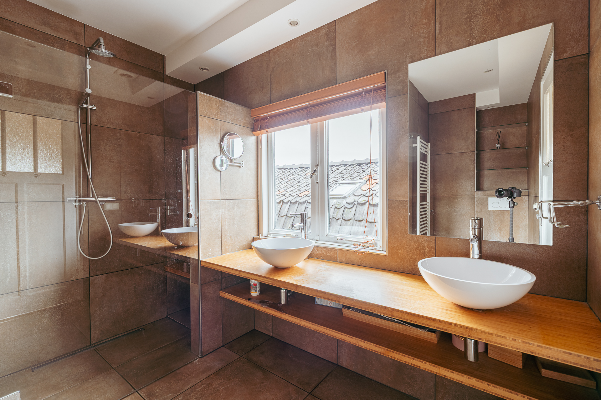 De bovenste verdieping is een open ruimte met hoge nok (ruim 3 meter) en grote dakramen en dakkapellen die zorgen voor veel lichtinval. Hier bevindt zich tevens een moderne badkamer met inloopdouche, wastafelmeubel, vloerverwarming en een derde toilet. Deze verdieping is bovendien voorzien van airconditioning, wat extra comfort biedt in alle seizoenen. De combinatie van het authentieke balkenplafond en de strakke afwerking geeft deze ruimte een bijzondere uitstraling. Indien gewenst kan de verdieping relatief eenvoudig worden opgedeeld in twee aparte slaapkamers.