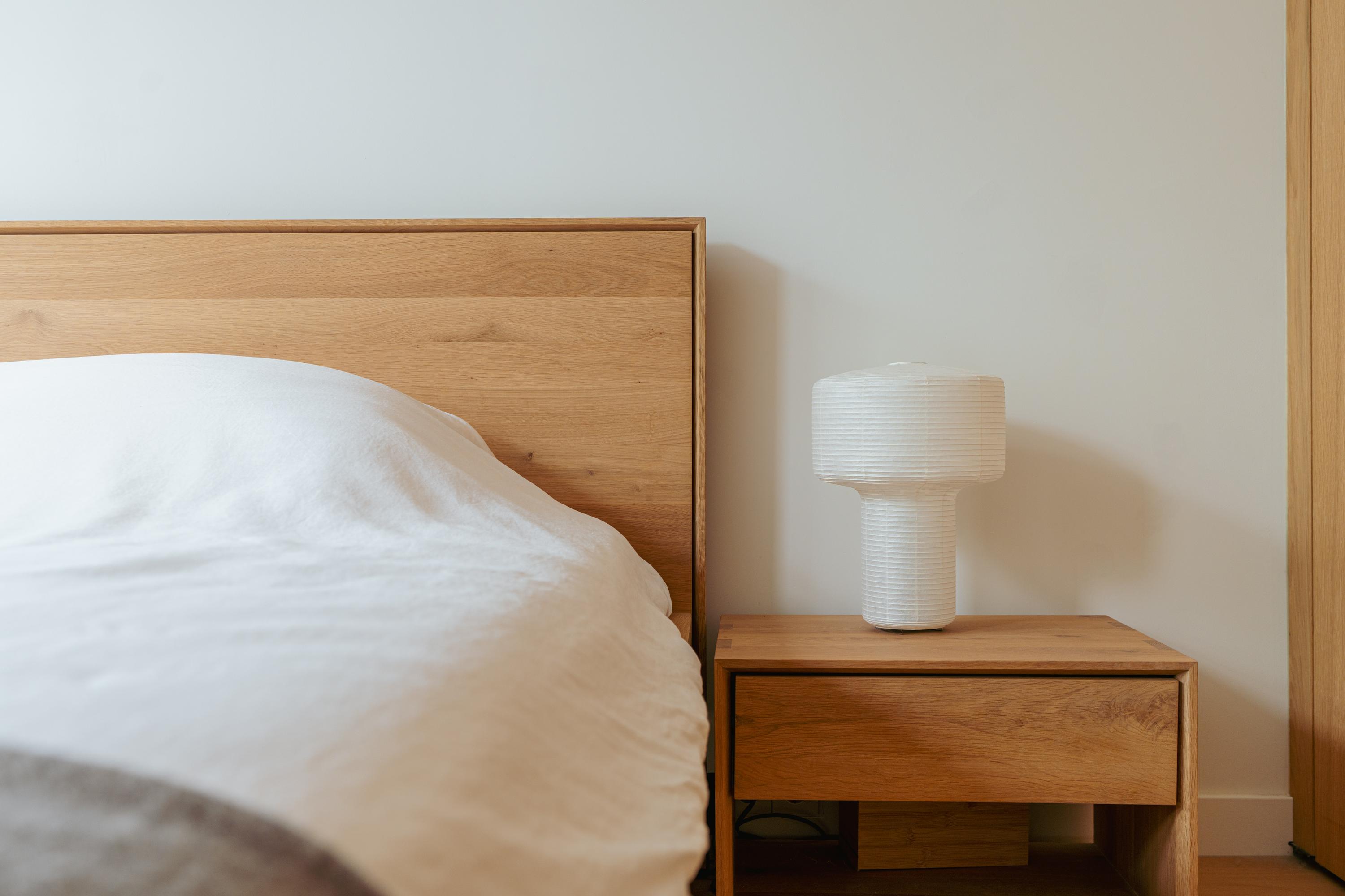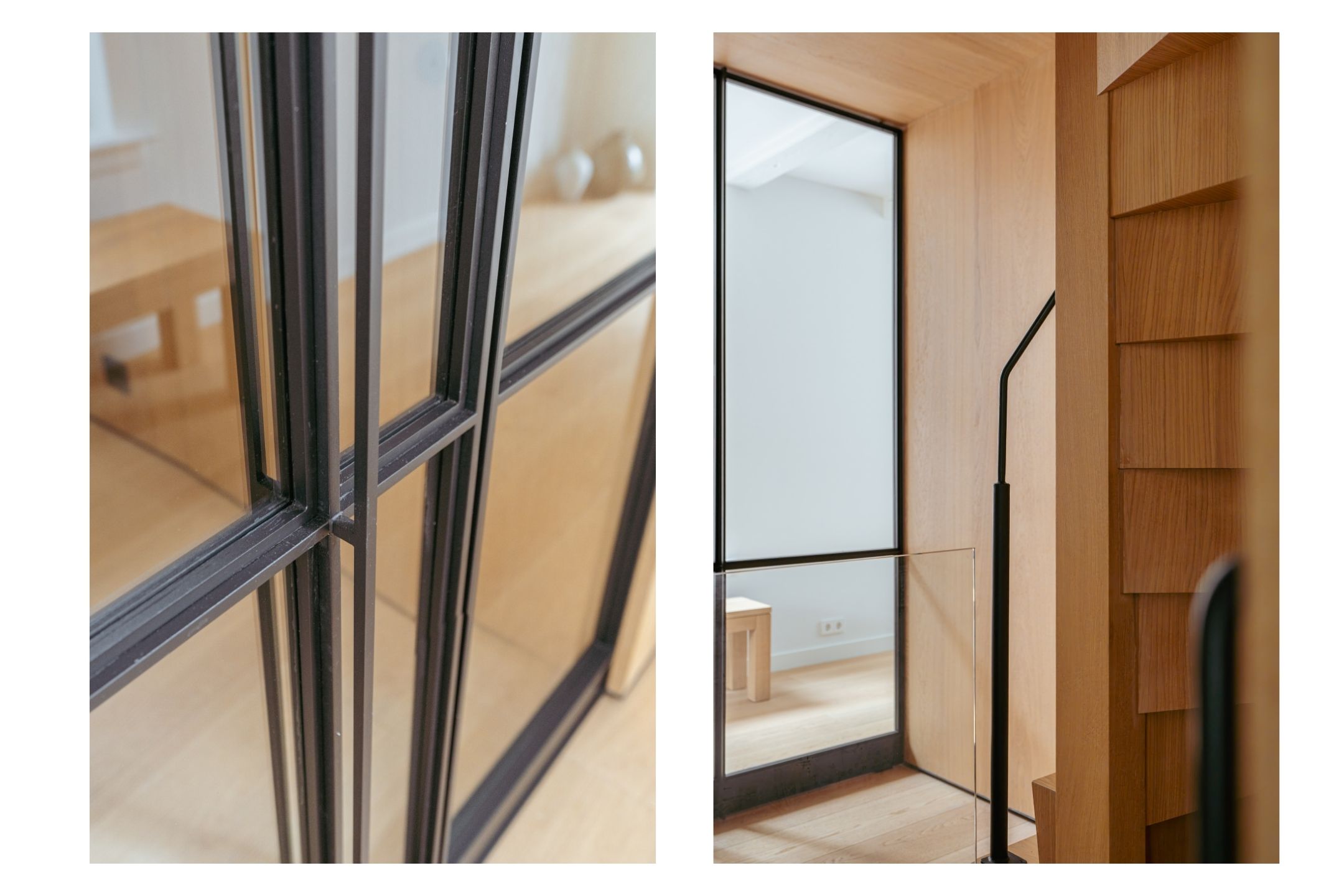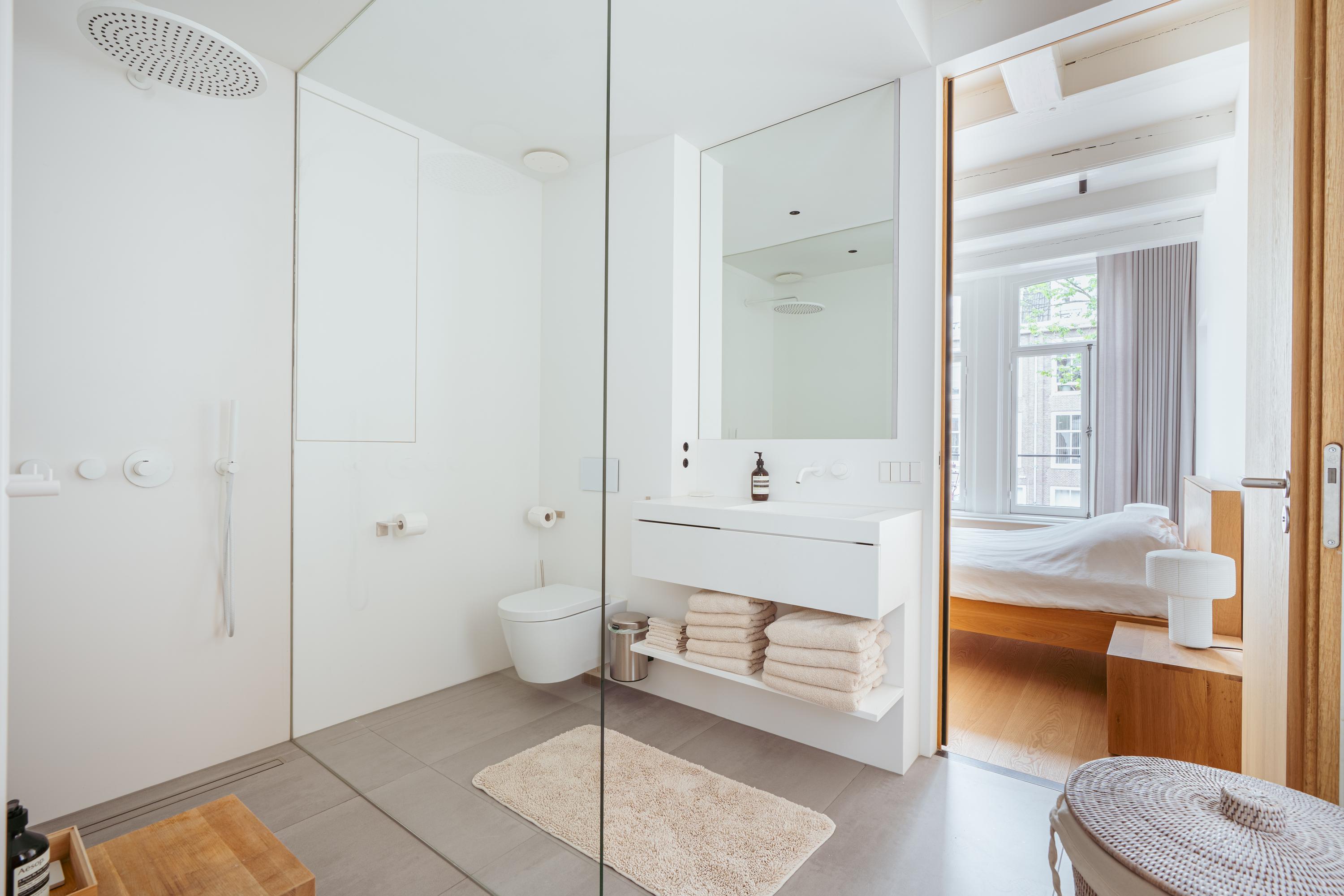 Via een nette overloop met ingebouwde opbergruimte bereikt u de beide slaapkamers. Deze verdieping is afgewerkt met een prachtige houten vloer en hoogwaardige materialen. Aan de voorzijde bevindt zich een royale slaapkamer met een maatwerk kastenwand die naadloos is geïntegreerd in het ontwerp. Grote raampartijen zorgen hier voor een overvloed aan natuurlijk licht en bieden een prachtig uitzicht op de gracht en de historische gevels van de stad. De tweede ruime slaapkamer, gelegen aan de achterzijde van de woning, beschikt eveneens over een ingebouwde kastenwand. Centraal op deze verdieping bevindt zich de modern uitgevoerde badkamer. Deze is uitgerust met een ruime inloopdouche, een strak wastafelmeubel en een stijlvol toilet, allemaal in een luxe en tijdloze afwerking. Wat deze verdieping extra bijzonder maakt, zijn de elegante stalen deuren waarmee beide slaapkamers stijlvol kunnen worden afgesloten – een combinatie van design en functionaliteit die perfect aansluit bij de rest van het interieur.