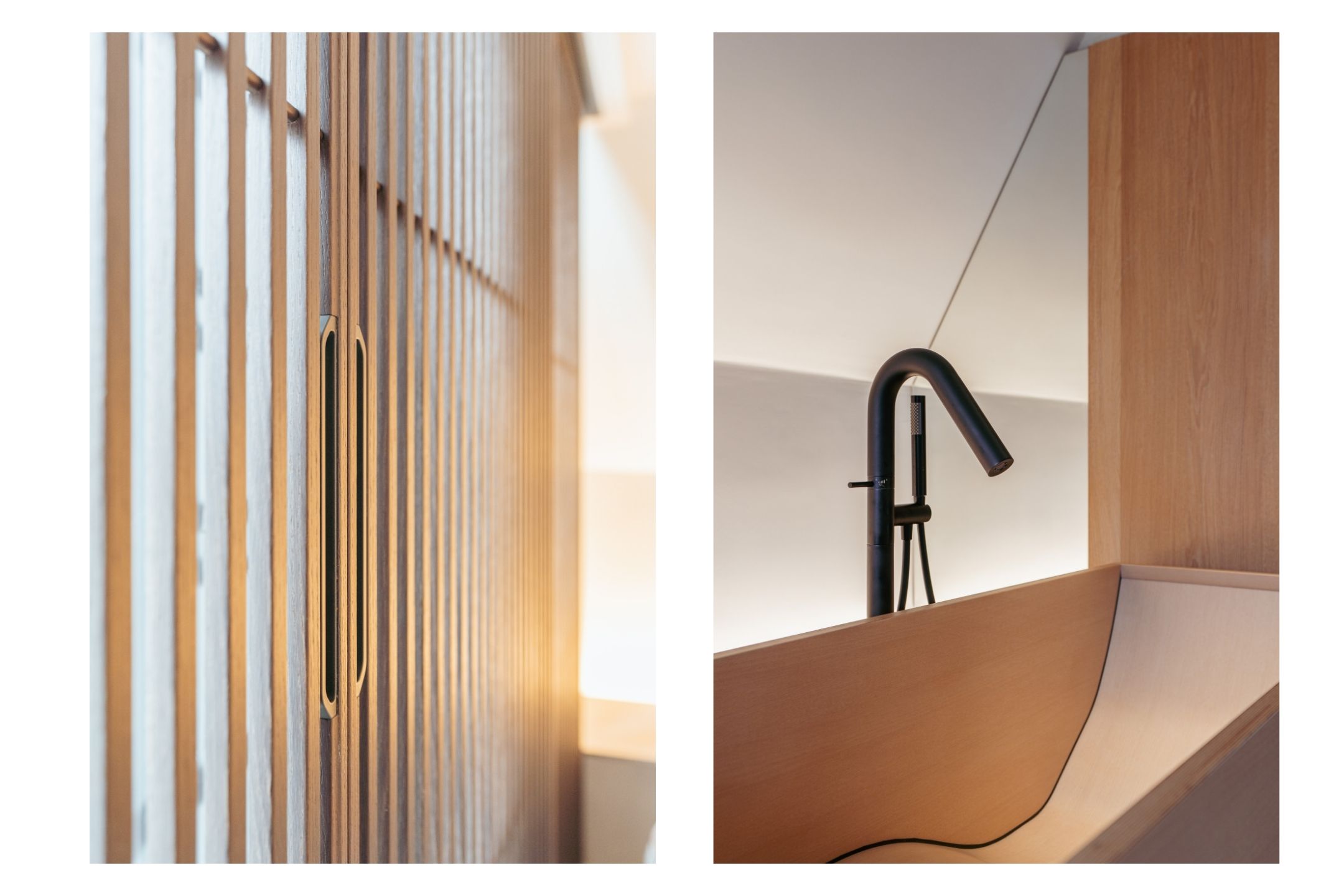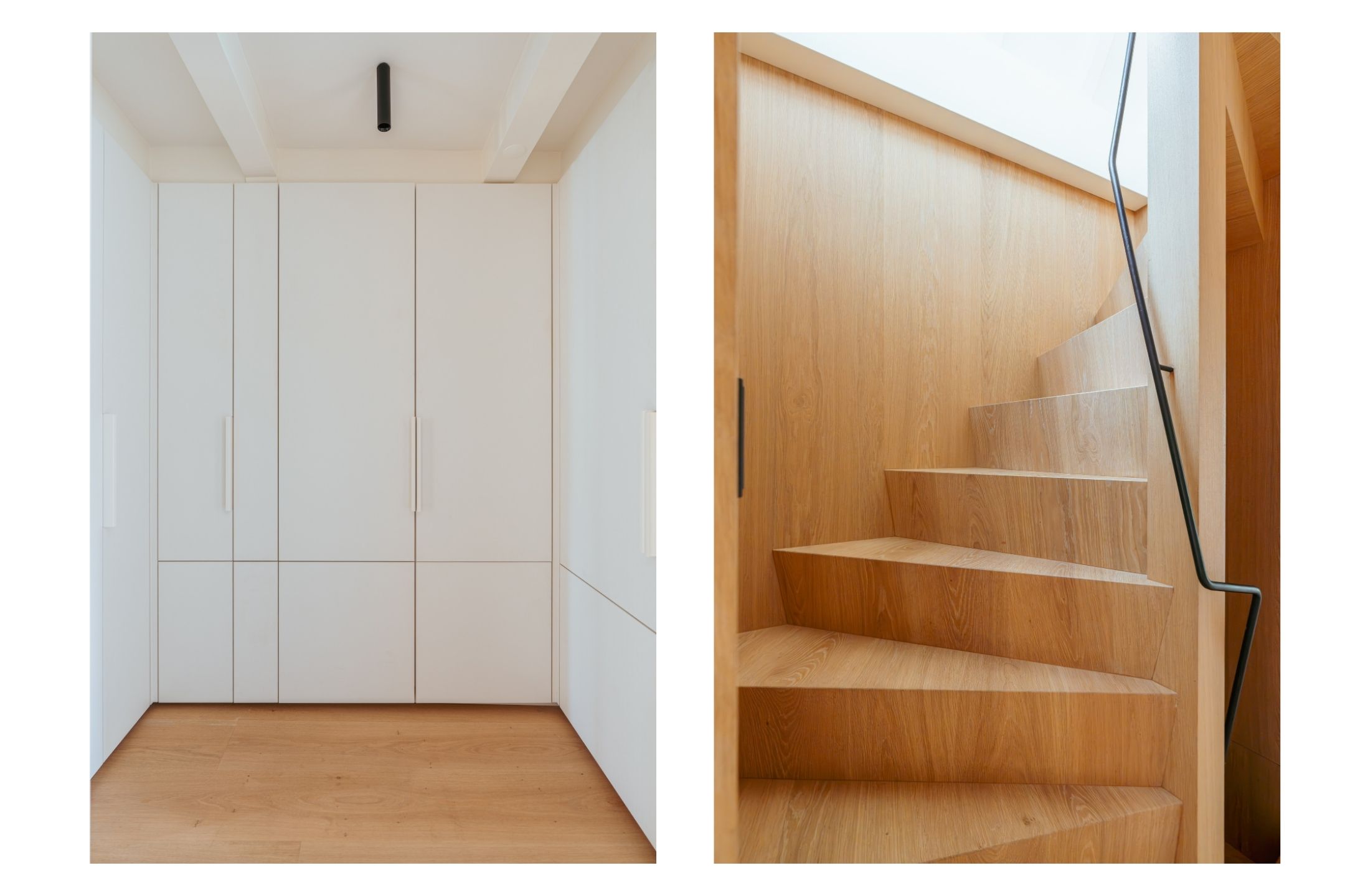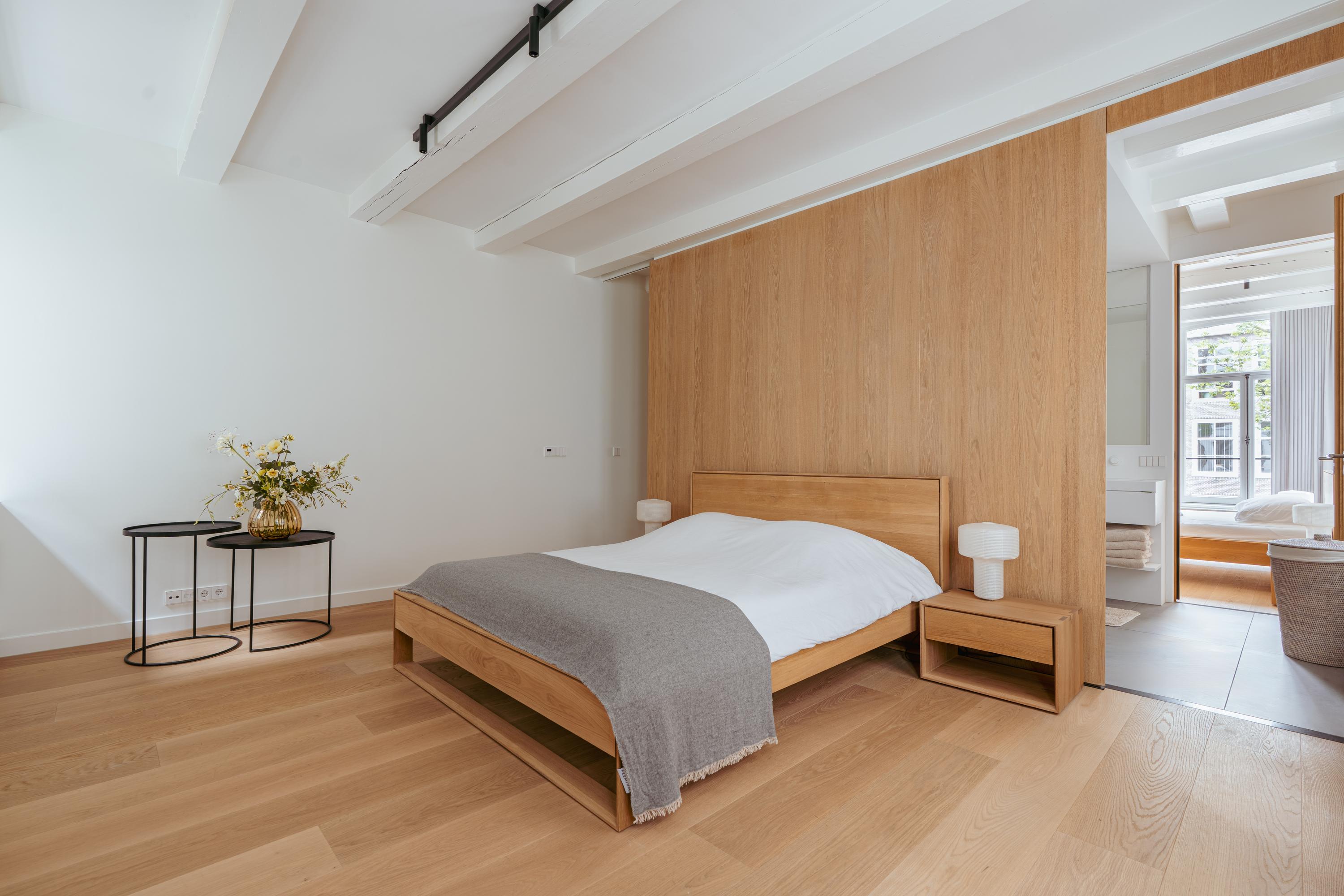 De bovenste verdieping van het pand is volledig ingericht als exclusieve master bedroom – een stijlvolle oase van rust, ruimte en comfort. Centraal op deze etage bevindt zich een ruime walk-in closet, voorzien van op maat gemaakte kasten die niet alleen praktisch zijn, maar ook bijdragen aan de serene uitstraling van de ruimte. Aan de voorzijde vindt u de sfeervolle slaapkamer, waar authentieke plafondbalken en een indrukwekkende nokhoogte direct in het oog springen. Hoge ramen tot in de nok zorgen voor een overvloed aan natuurlijk licht en versterken het gevoel van openheid en ruimte. Ook hier zorgen ingebouwde kastenwanden voor een strak en opgeruimd geheel. Aan de achterzijde ligt de luxueus uitgevoerde badkamer, een ware wellnessruimte in eigen huis. Hier treft u een elegant vrijstaand Agape Spoon Woodline ligbad als eye-catcher, een dubbele wastafel met stijlvol meubel, een bijzonder royale inloopdouche, stoomcabine én een ingebouwd ligbed voor ultieme ontspanning. De ruimte is afgewerkt met warme materialen en doordachte details, waaronder ingebouwde verlichting die een gevoel van hotel-luxe oproept. Prachtige houten schuifpanelen dienen zowel als zonwering als sfeervol designelement en zorgen voor privacy zonder het daglicht buiten te sluiten. Het toilet is separaat gesitueerd.