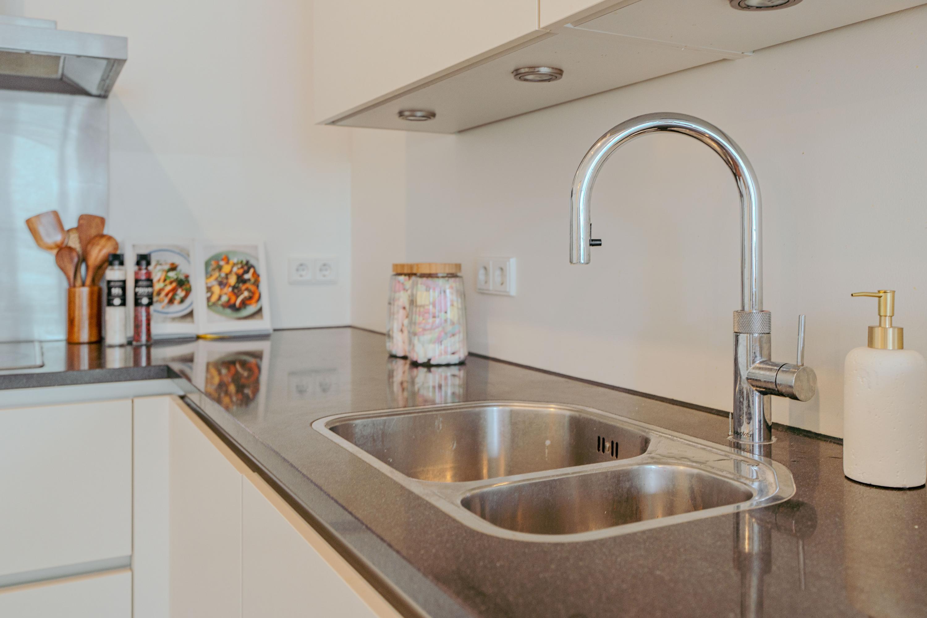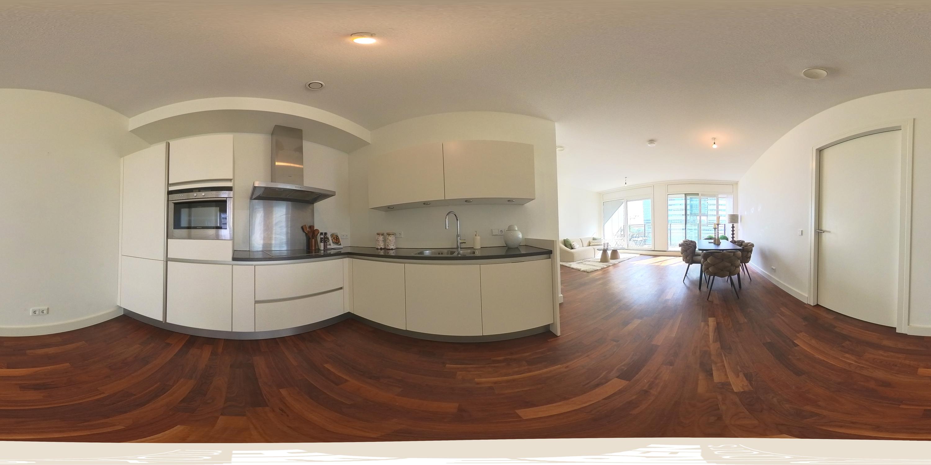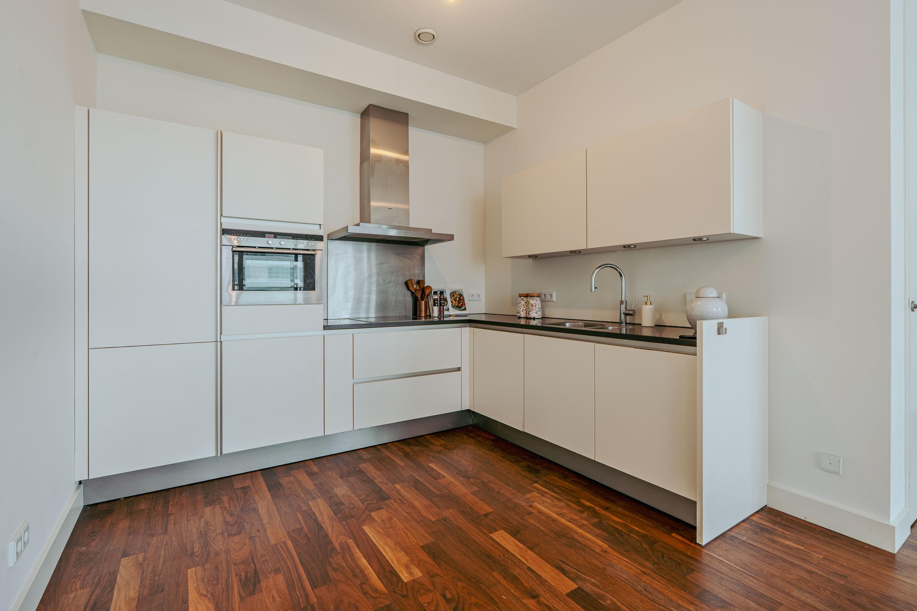 Bij binnenkomst op de 8e verdieping betreedt u een ruime hal met de meterkast, een separaat toilet en ruimte voor een garderobe. Vanuit hier loopt u het ruime woon/leefgedeelte in, waar u niet ontkomt aan het uitzicht wat de ruimte open doet aanvoelen. Middels een schuifpui aan de voorzijde heeft u toegang tot het ruime balkon dat zich over de gehele breedte van het appartement strekt. Een ideale plek om te ontspannen, te genieten van u ontbijt of het uitzicht. De open keuken is gelegen aan de achterzijde en is voorzien van moderne inbouwapparatuur, waaronder een koelkast, vriezer, inductiekookplaat, Quooker en vaatwasser.