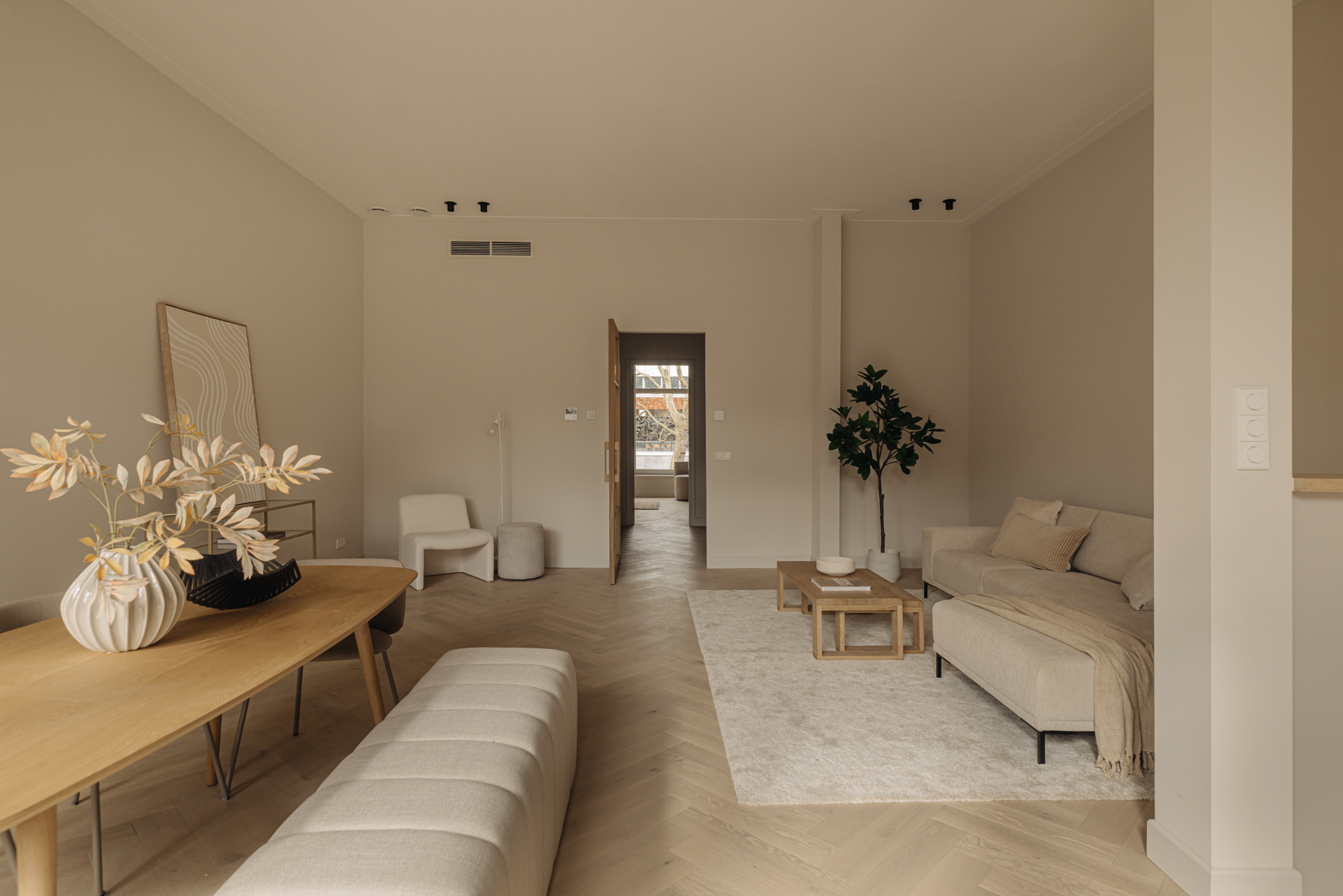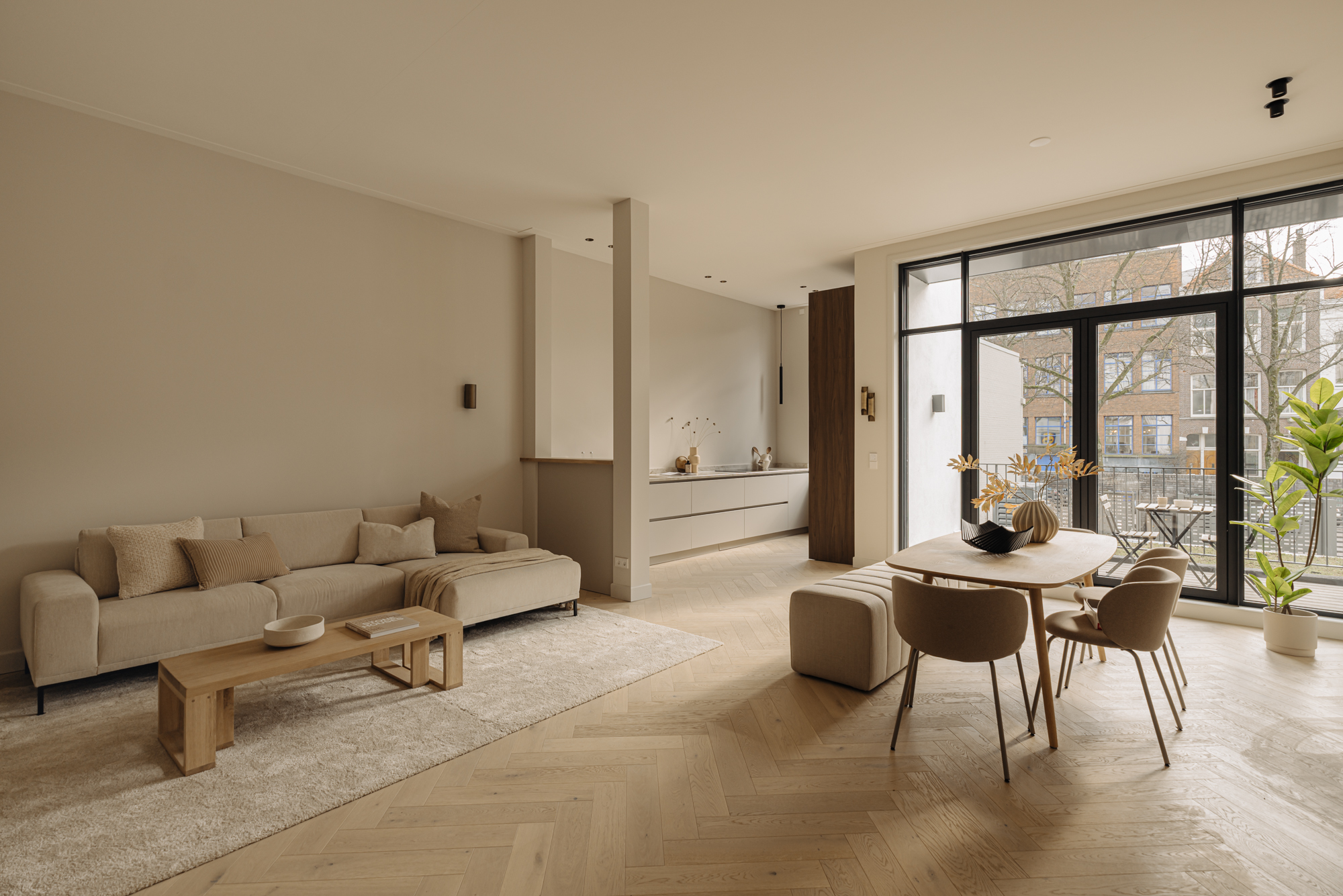 Luxe dubbel benedenhuis van ca. 182 m² met vier slaapkamers, twee badkamers, een balkon, een terras, interne berging en entree naar het appartement via zowel de voor als achterzijde. De appartementen zijn vormgegeven met zorgvuldig geselecteerde, hoogwaardige materialen die een gevoel van warmte en comfort creëren. Luxe visgraatvloeren, hoge plafonds, subtiele tinten in de keukens en badkamers, en een doordacht lichtplan zorgen voor een harmonieuze en uitnodigende ambiance. De keuken, met haar strakke lijnen en ruime opbergruimte, biedt een perfecte combinatie van stijl en praktische functionaliteit. Het gebouw is gelegen op eigen grond.