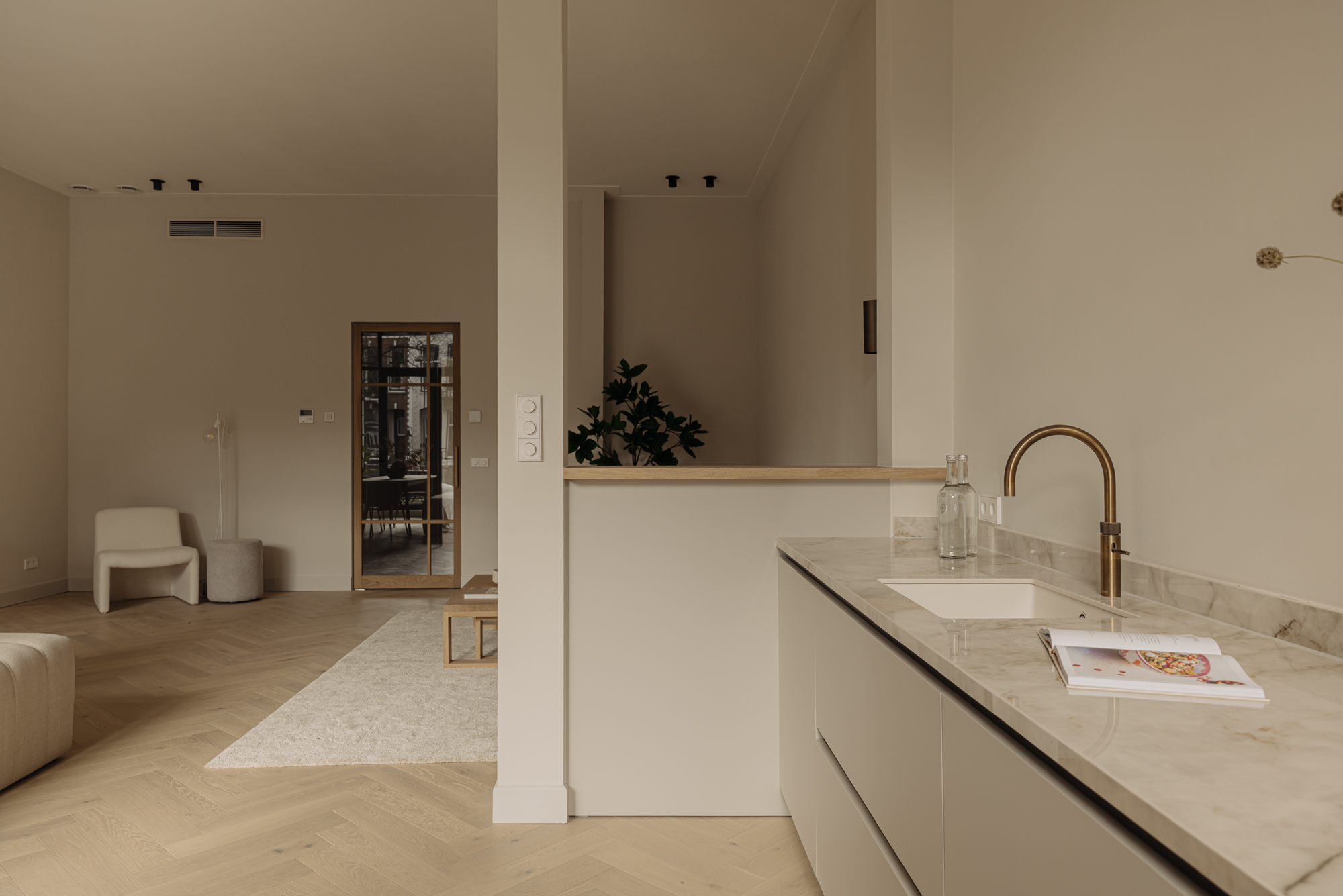 Via de privéparkeerplaatsen heeft u toegang tot het stijlvolle en gemeenschappelijke entree met marmeren lambrisering. Deze entree geeft toegang tot de meterkasten van elk appartement. Via de trap of de elegante marmeren lift bereik je de eerste verdieping, waar je het appartement betreedt. Daarnaast is de entree ook toegankelijk vanaf de achterzijde van het pand.
