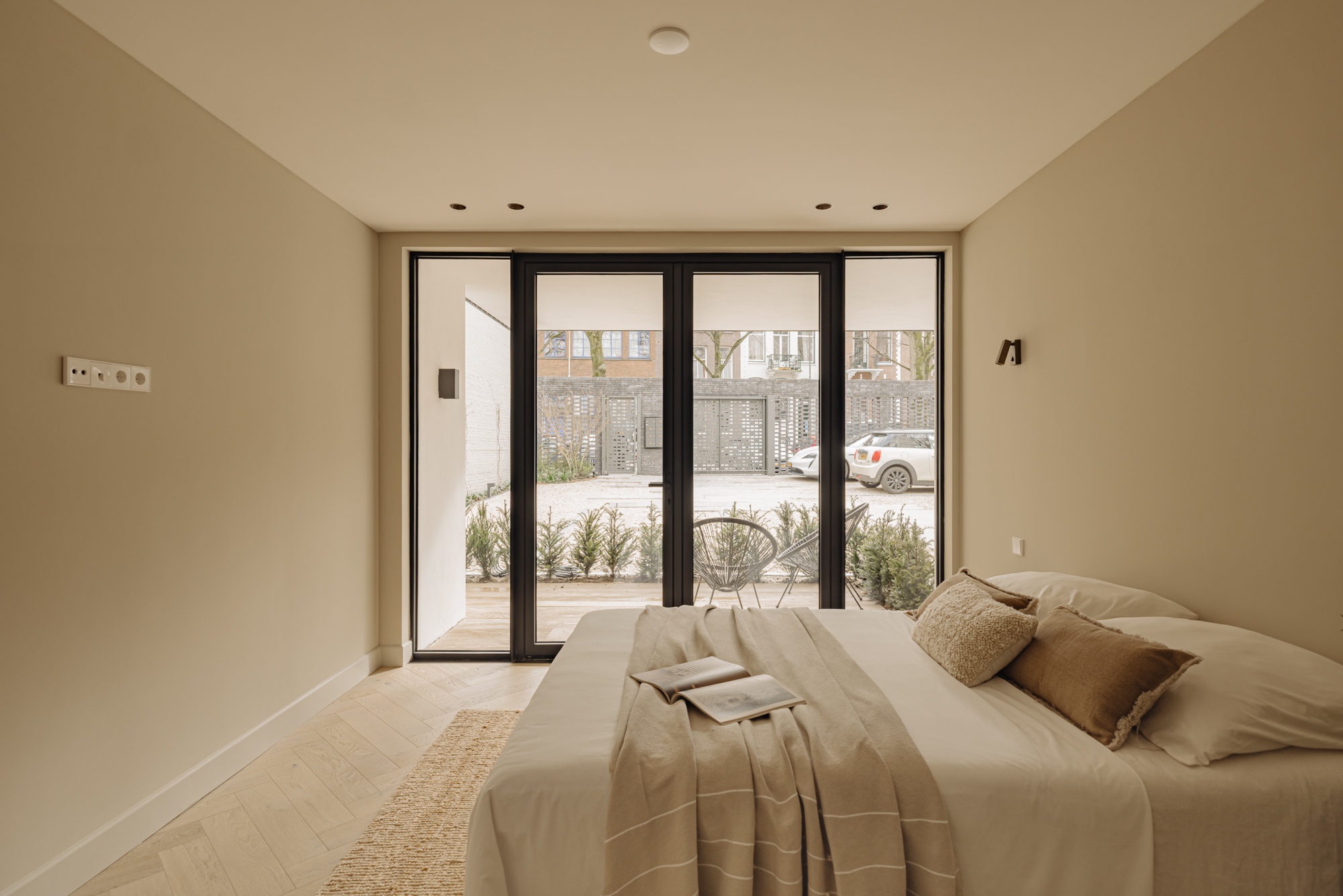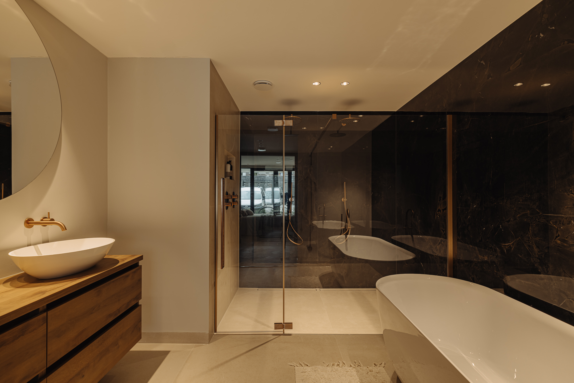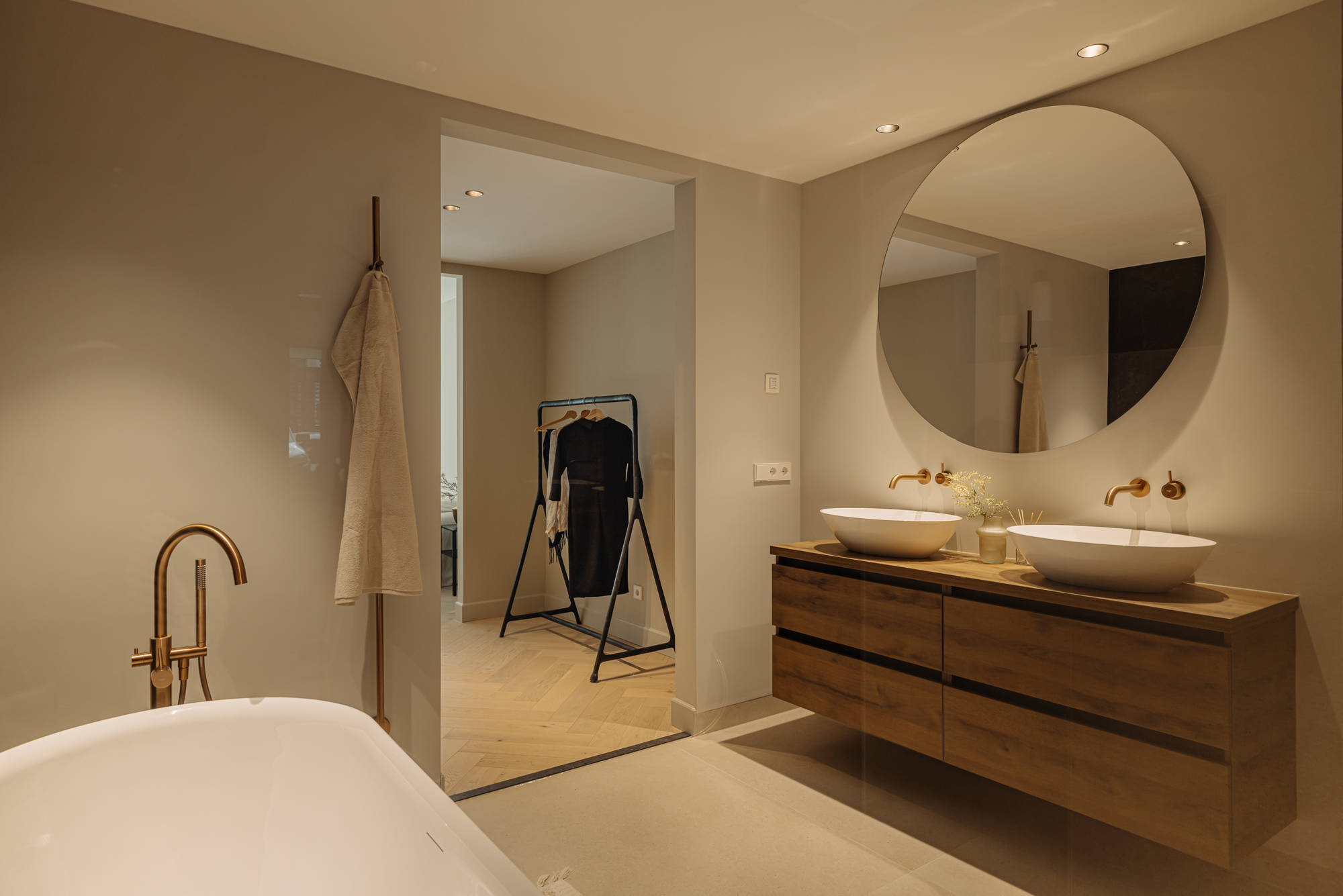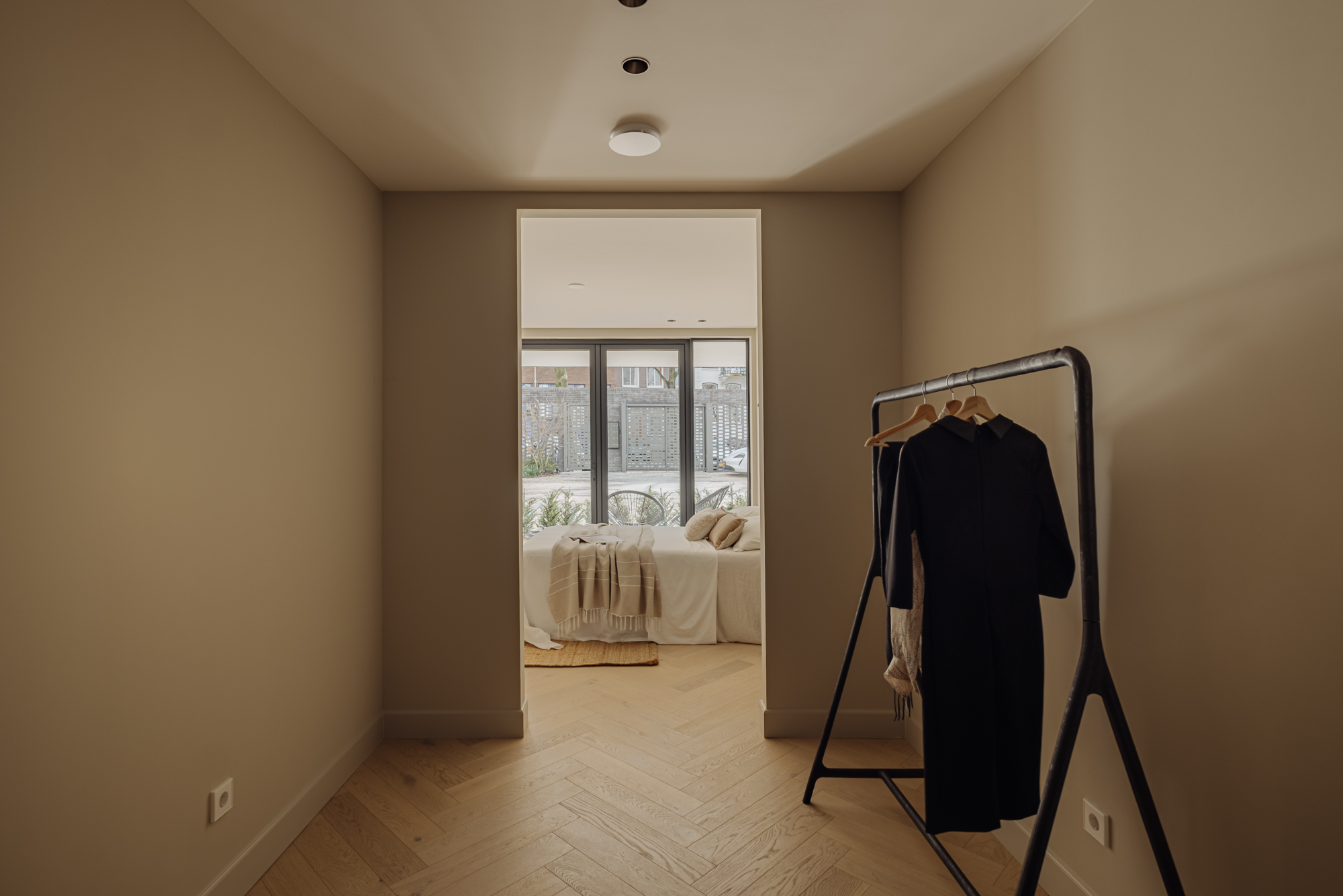 Via de interne trap bereikt u de begane grond, waar een royale overloop met een separaat toilet en een inbouwkast toegang biedt tot alle vertrekken. Aan de voorzijde bevinden zich twee ruime slaapkamers, beide met directe toegang tot het zonnige terras. De master bedroom heeft een luxe en-suite badkamer, voorzien van een ligbad, dubbele wastafel en een dubbele inloopdouche. De tweede, stijlvolle badkamer, eveneens aan de voorzijde gelegen, is uitgerust met een ruime wastafel en een inloopdouche. Aan de achterzijde vindt u de vierde slaapkamer, evenals een ruime berging van circa 11 m².