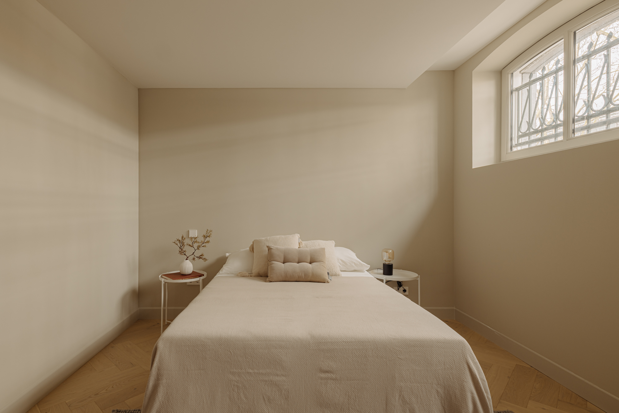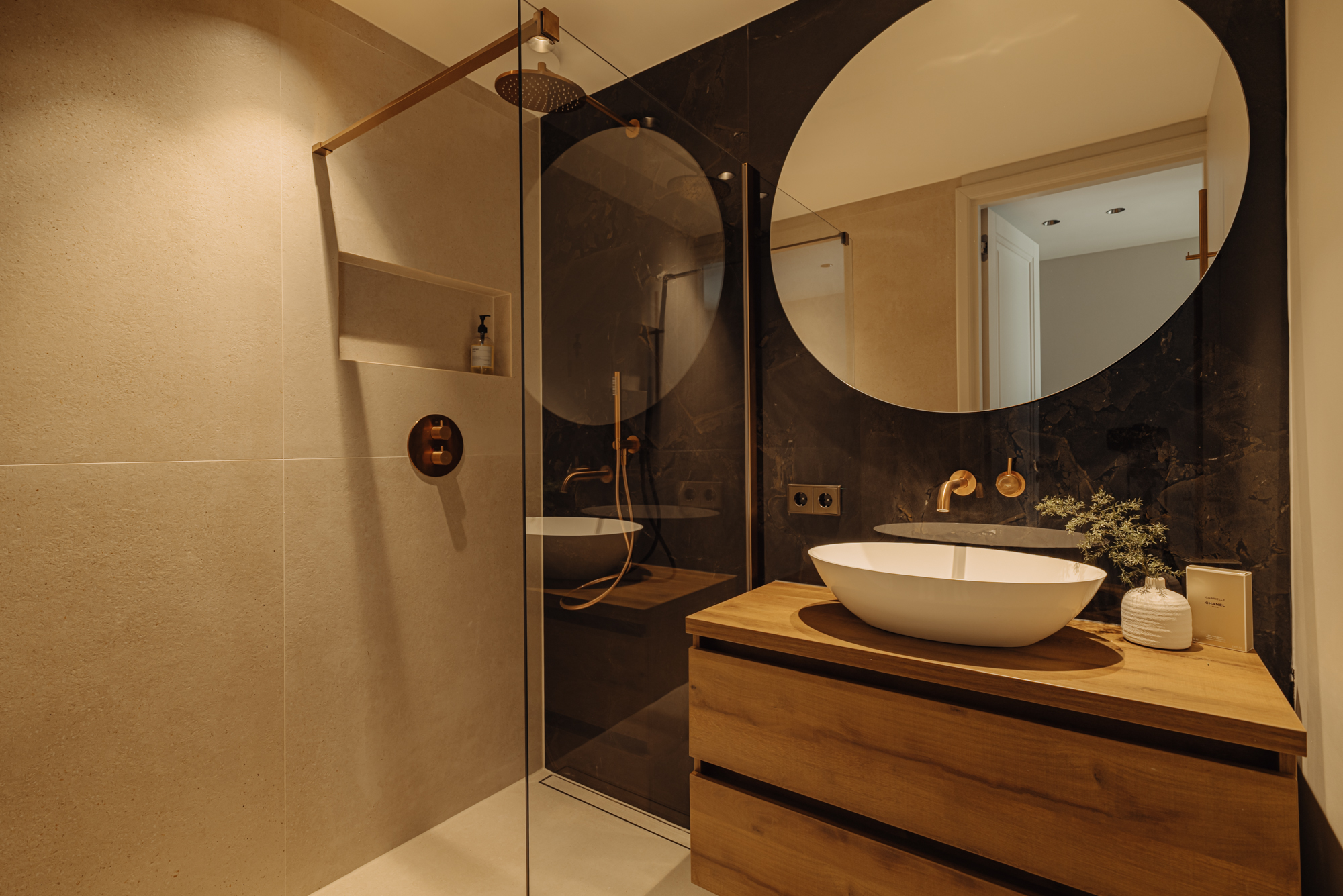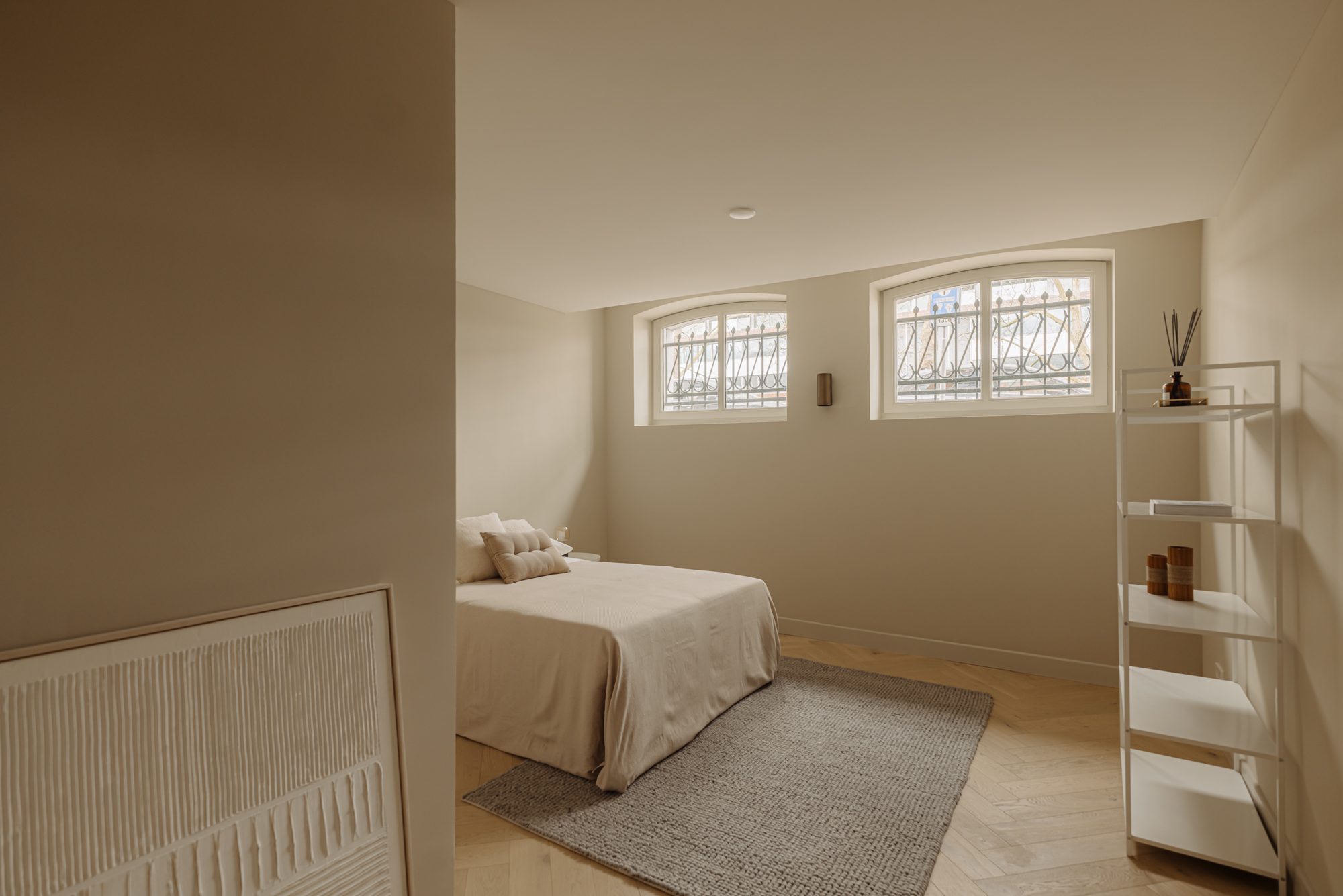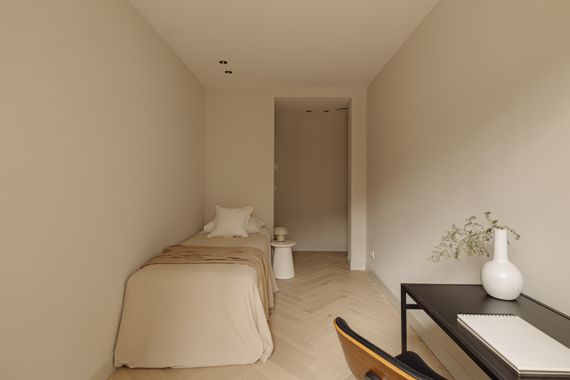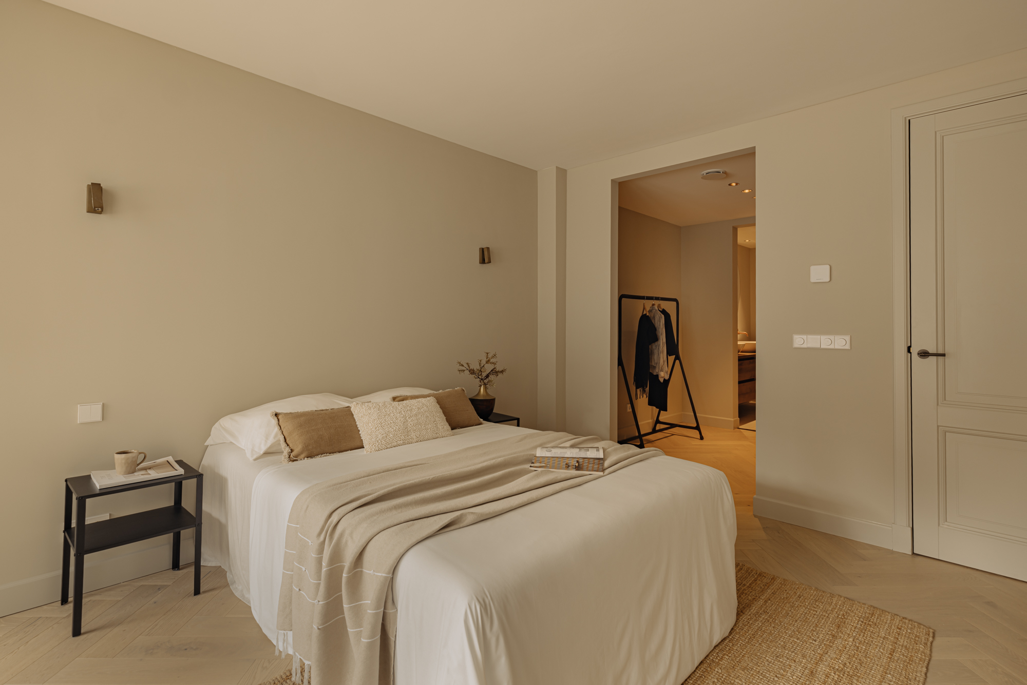 Via de interne trap bereikt u de begane grond, waar een royale overloop met een separaat toilet en een inbouwkast toegang biedt tot alle vertrekken. Aan de voorzijde bevinden zich twee ruime slaapkamers, beide met directe toegang tot het zonnige terras. De master bedroom heeft een luxe en-suite badkamer, voorzien van een ligbad, dubbele wastafel en een dubbele inloopdouche. De tweede, stijlvolle badkamer, eveneens aan de voorzijde gelegen, is uitgerust met een ruime wastafel en een inloopdouche. Aan de achterzijde vindt u de vierde slaapkamer, evenals een ruime berging van circa 11 m².