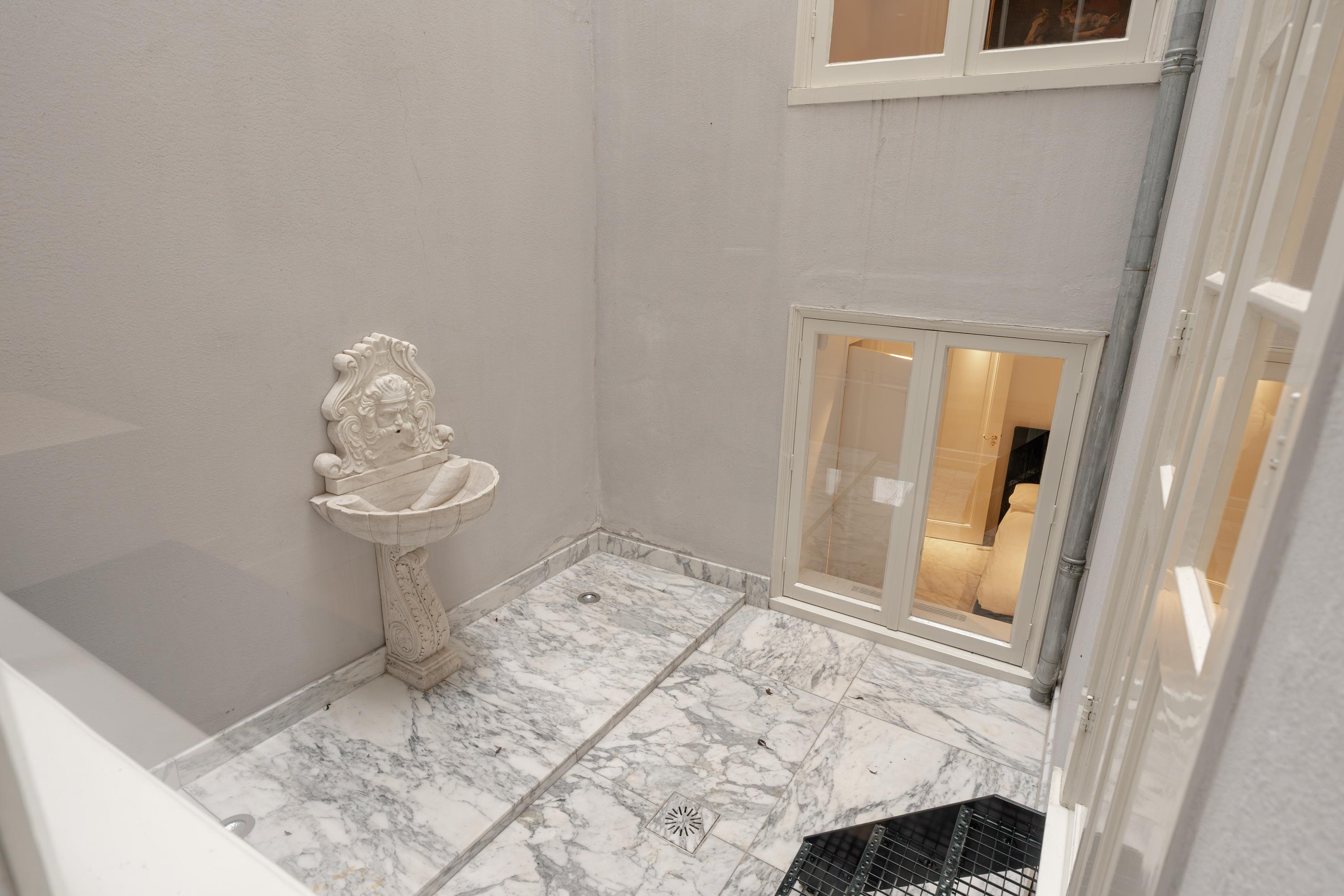 Via de bel-etage betreedt u de woning, waar het uitzonderlijke oog voor detail direct voelbaar is. De ontvangsthal is volledig uitgevoerd in marmer en voorzien van originele marmeren vloertegels, wat zorgt voor een indrukwekkende entree. In de gehele woonkamer zijn verfijnde plafondornamenten zichtbaar die de klassieke allure van het pand benadrukken.