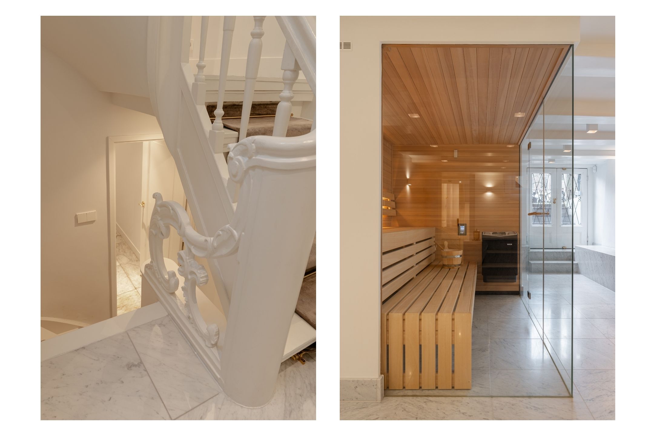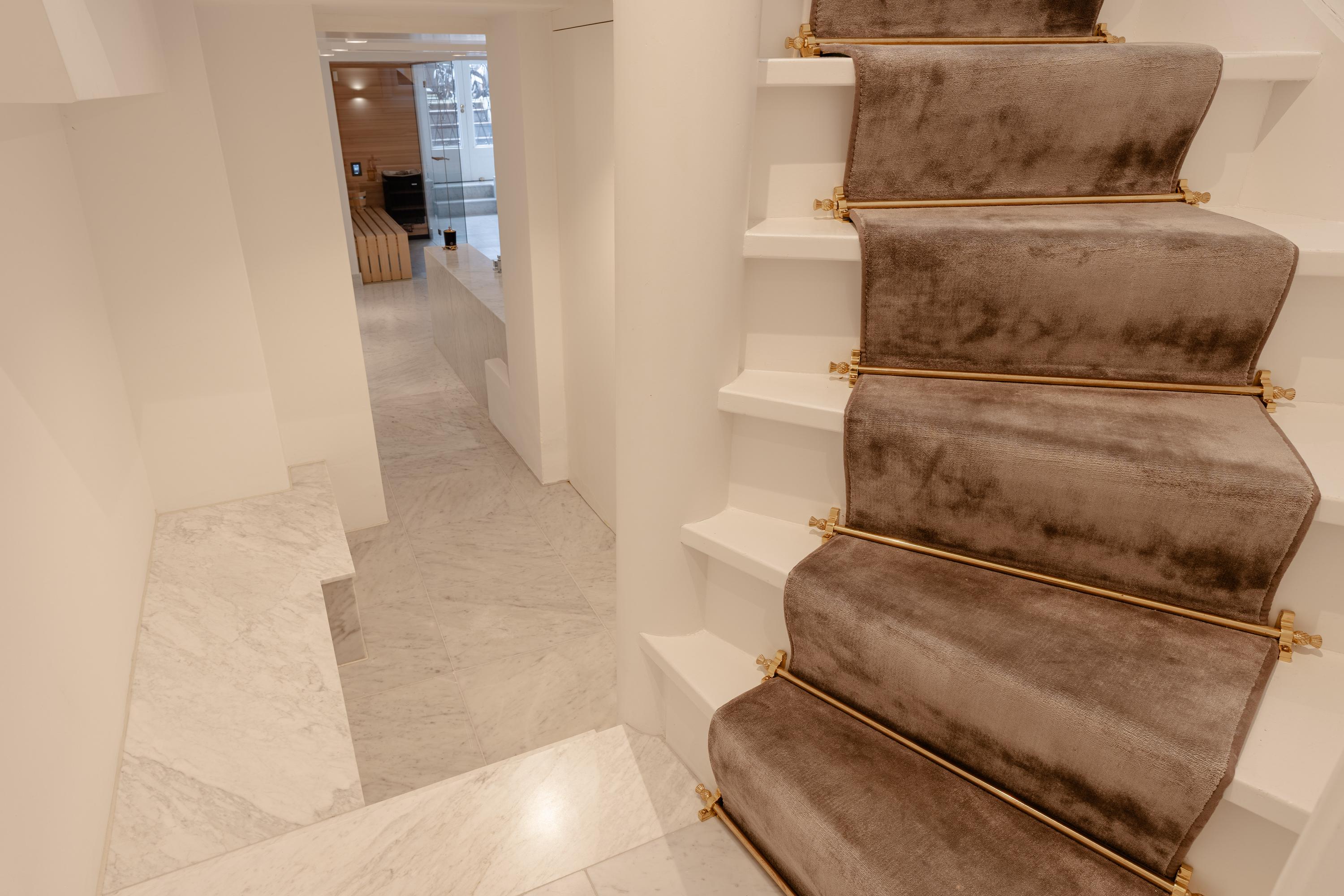 Het souterrain vormt een volwaardige woonlaag waarin luxe, comfort en ontspanning centraal staan. Een zeldzame wellnesservaring in het hart van de Amsterdamse grachtengordel. Deze verdieping is afgewerkt met Carrara marmer van Jan Reek (Italië), toegepast in alle badkamers en de wellnessruimte, en straalt rust en exclusiviteit uit.
