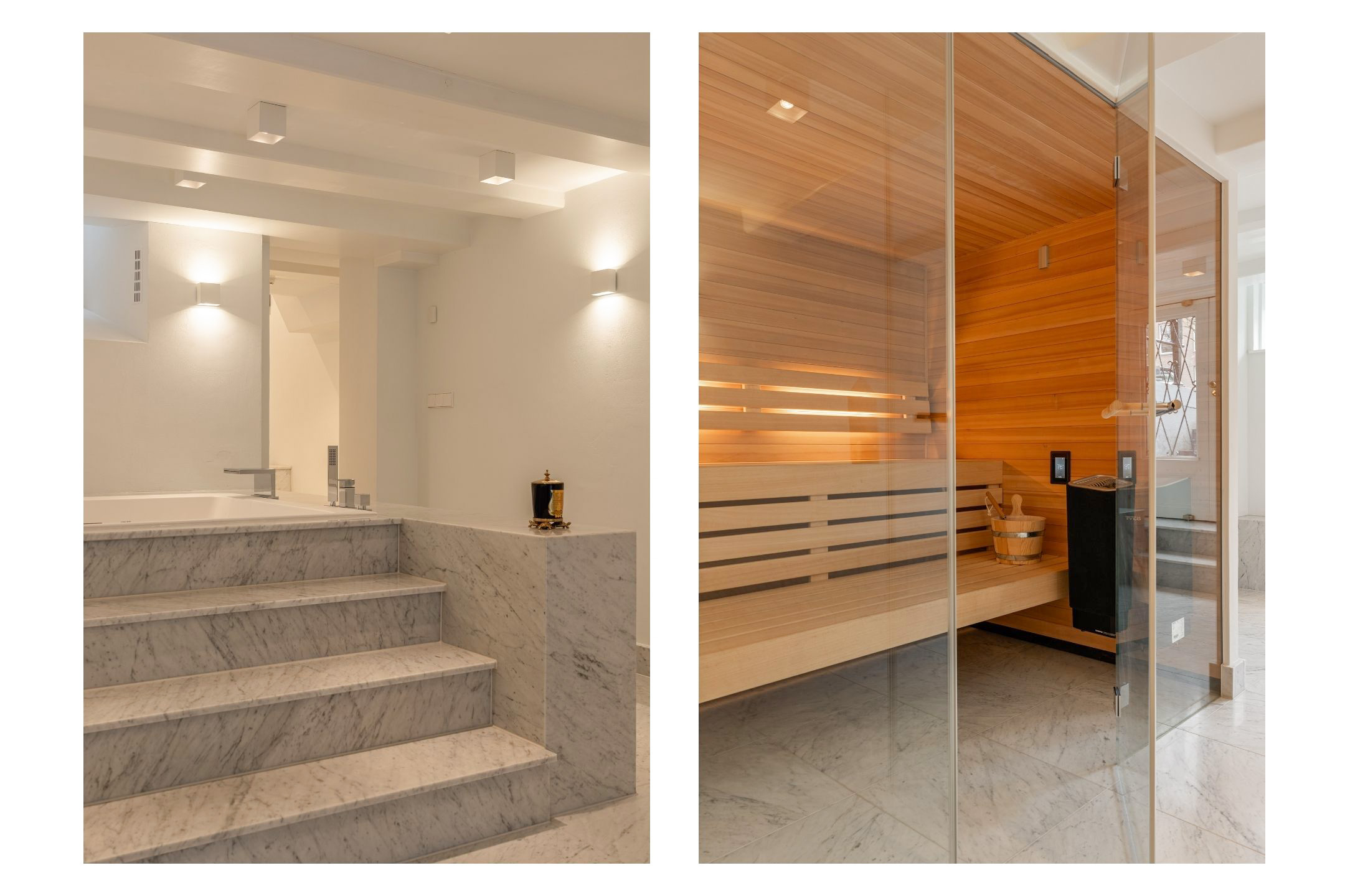 Aan de voorzijde bevindt zich een exclusieve wellnessruimte met jacuzzi en luxe sauna. De combinatie van marmer, hout en zorgvuldig afgestemde verlichting creëert hier een serene, spa-achtige ambiance.