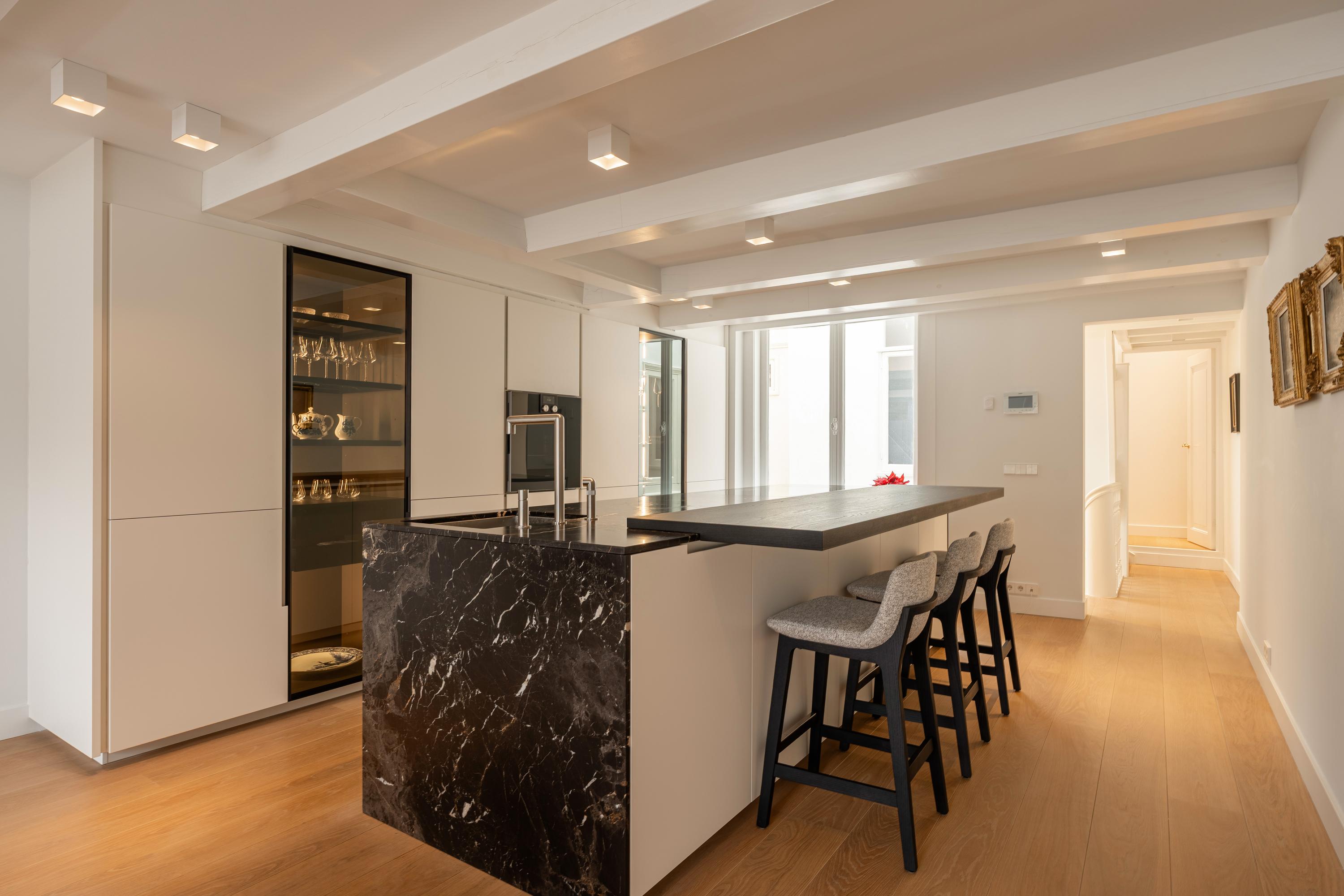De keuken is voorzien van hoogwaardige Gaggenau-inbouwapparatuur, waaronder een inductiekookplaat met geïntegreerde afzuiging, oven, vaatwasser en een koel-vriescombinatie. Verlichte servieskasten en het royale kookeiland met bar maken deze verdieping tot het hart van de woning.