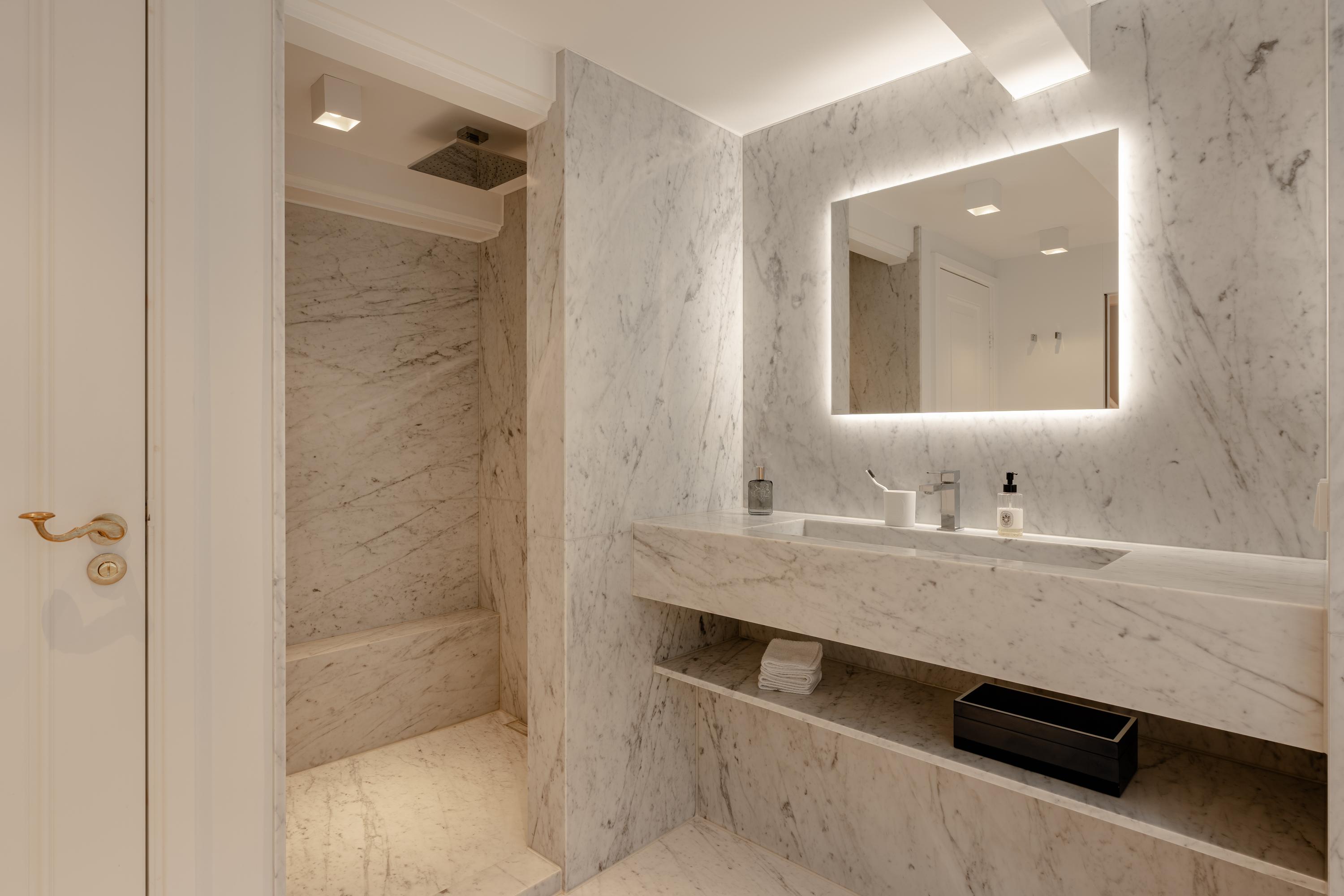 De tweede verdieping is ingericht als een comfortabele en luxueuze privésuite. Aan de achterzijde bevindt zich de badkamer, volledig uitgevoerd in Carrara marmer en voorzien van een strak badkamermeubel, inloopdouche, vloerverwarming, mechanische ventilatie en een separaat toilet.