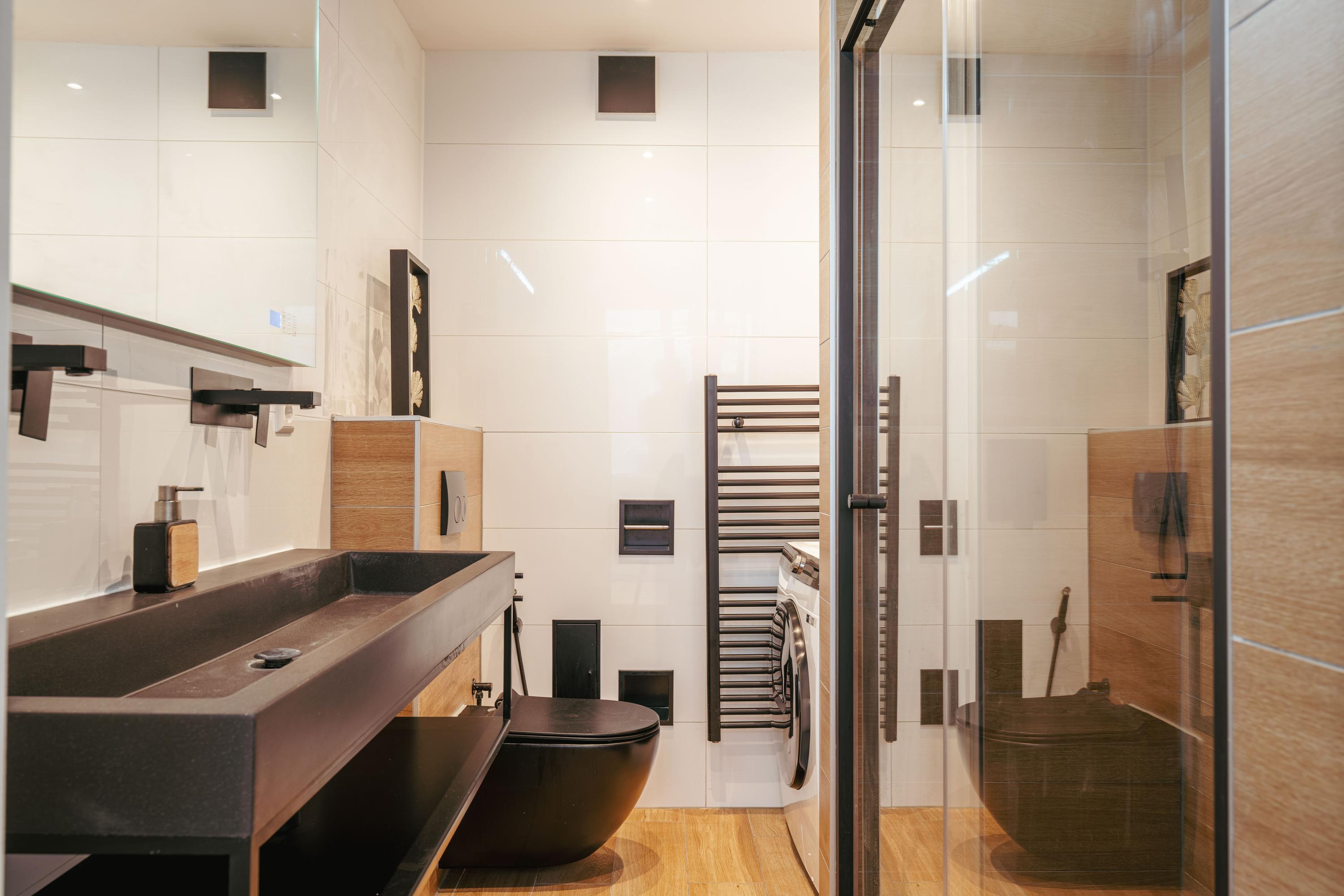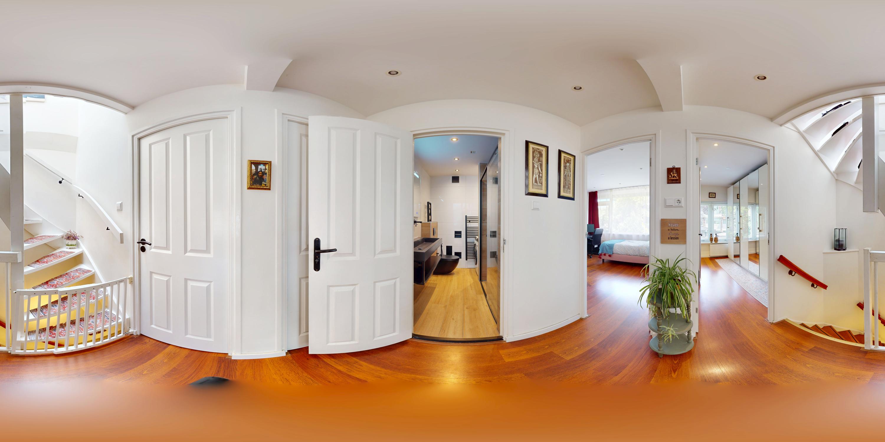 Op de bovenste verdieping bevinden zich nog eens twee royale slaapkamers, eveneens verdeeld over de voor- en achterzijde. De tweede badkamer is centraal geplaatst en uitgerust met een dubbele wastafel met meubel, een dubbele regendouche en een toilet – ideaal voor grotere gezinnen of gasten.