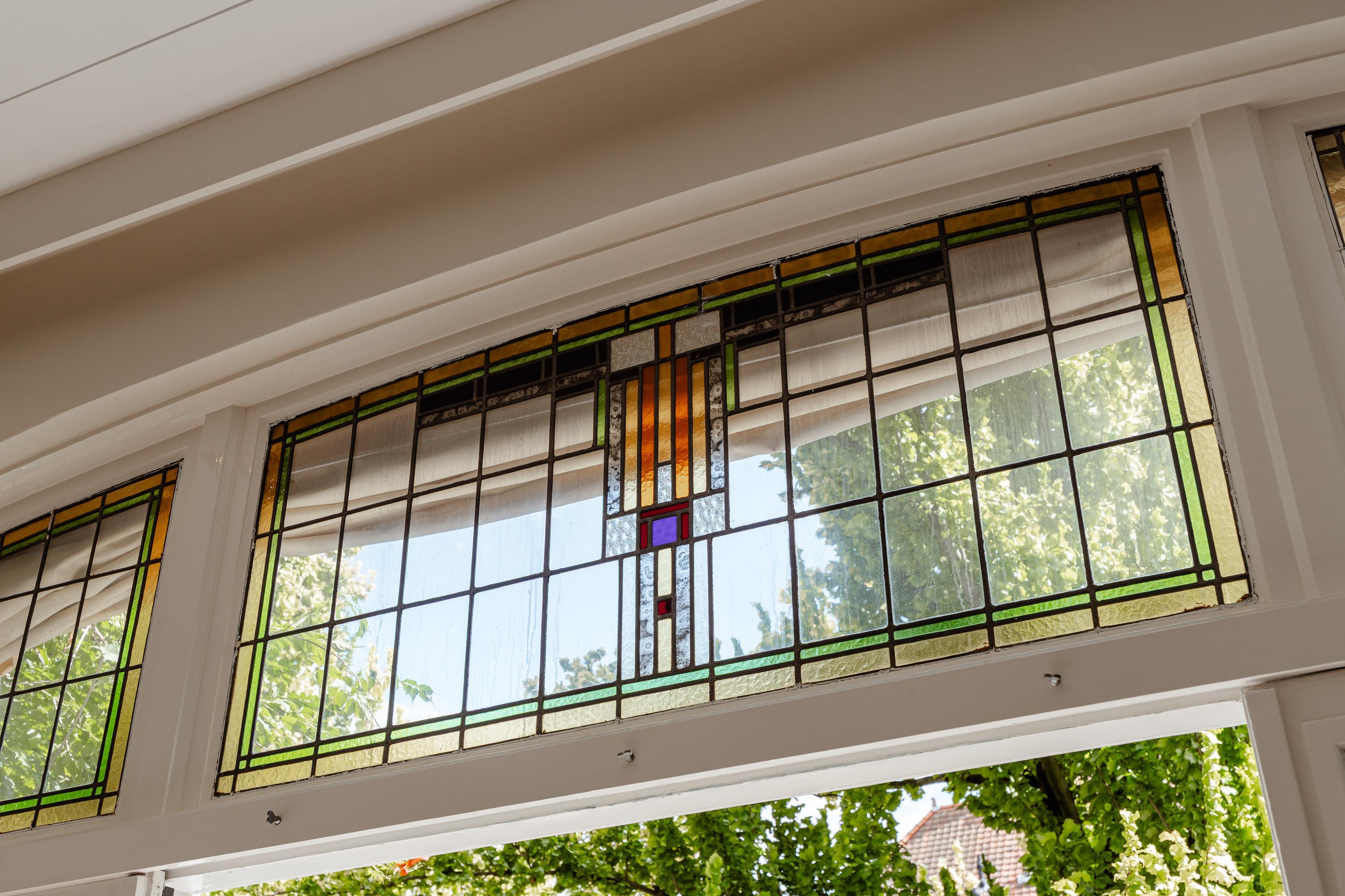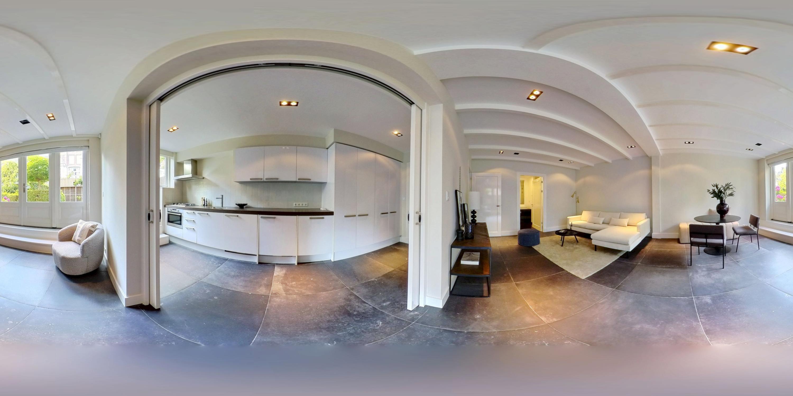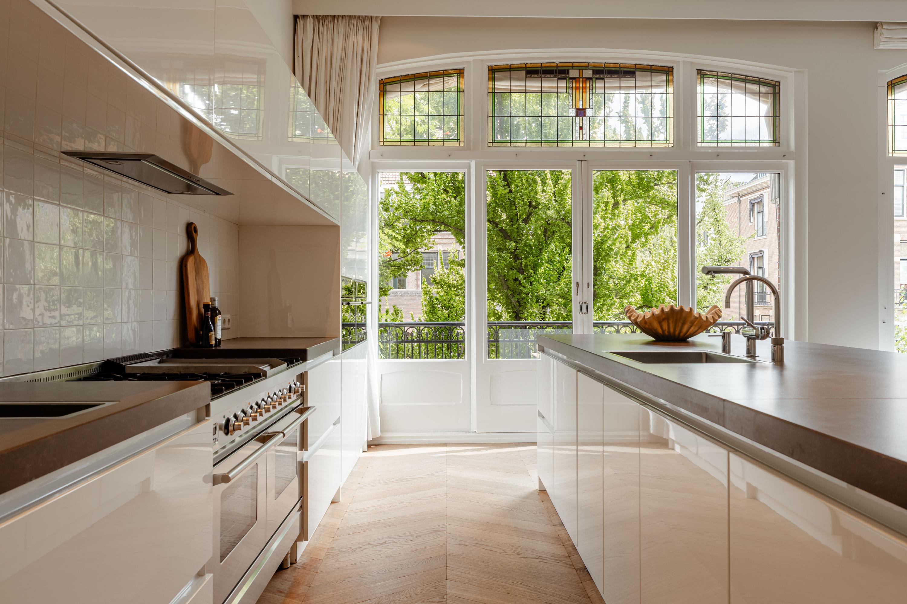 Middels de lift of de eigen entree op de eerste verdieping bereikt u de indrukwekkende leefverdieping. Hier valt direct de royale woonkamer op, met grote raampartijen welke zorgen voor een overvloed aan licht en een verfijnde sfeer. Aan de voorzijde bevindt zich de luxe woonkeuken, een absolute eyecatcher, voorzien van een royaal kookeiland met wijnklimaatkast, dubbele spoelbak met Quooker en hoogwaardige inbouwapparatuur: twee ovens, een volledige koelkast en een aparte vriezer. Deze keuken biedt alles voor de echte culinaire liefhebber en vormt het hart van de woning. Vanuit hier heeft u toegang tot het balkon met karakteristieke glas-in-loodramen, ideaal voor een ontspannen ontbijt in de ochtendzon. Op deze verdieping zijn tevens een garderoberuimte en separaat toilet te vinden.