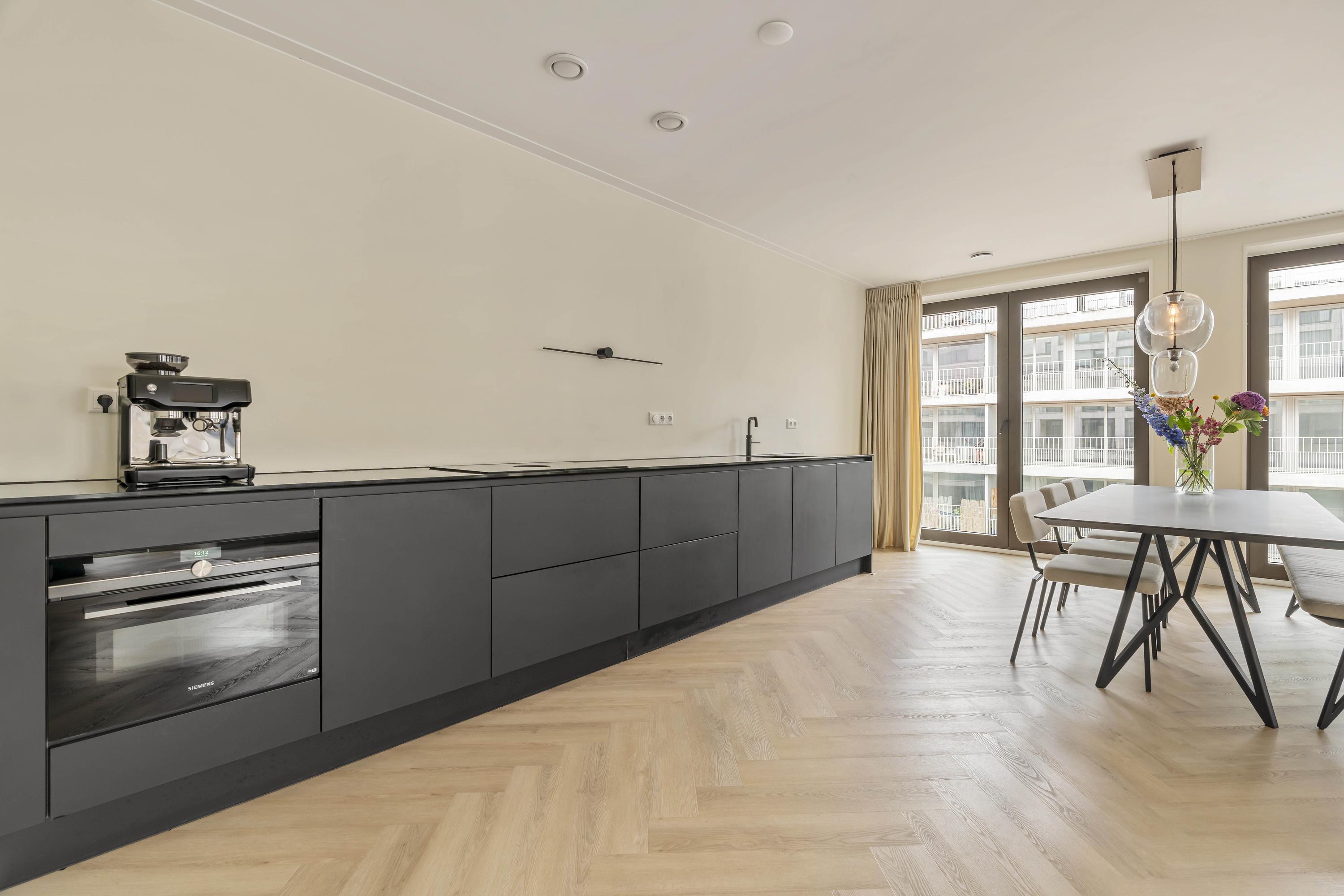 De keuken is uitgevoerd in matzwart design en voorzien van alle denkbare inbouwapparatuur, waaronder een inductiekookplaat, combi-oven, vaatwasser en een Quooker. Er is meer dan genoeg opbergruimte. Vanuit de woonkamer is er toegang tot het ruime balkon op het zuidwesten, waar u geniet van de middag/avond zon en een prachtig uitzicht op het groene plein.