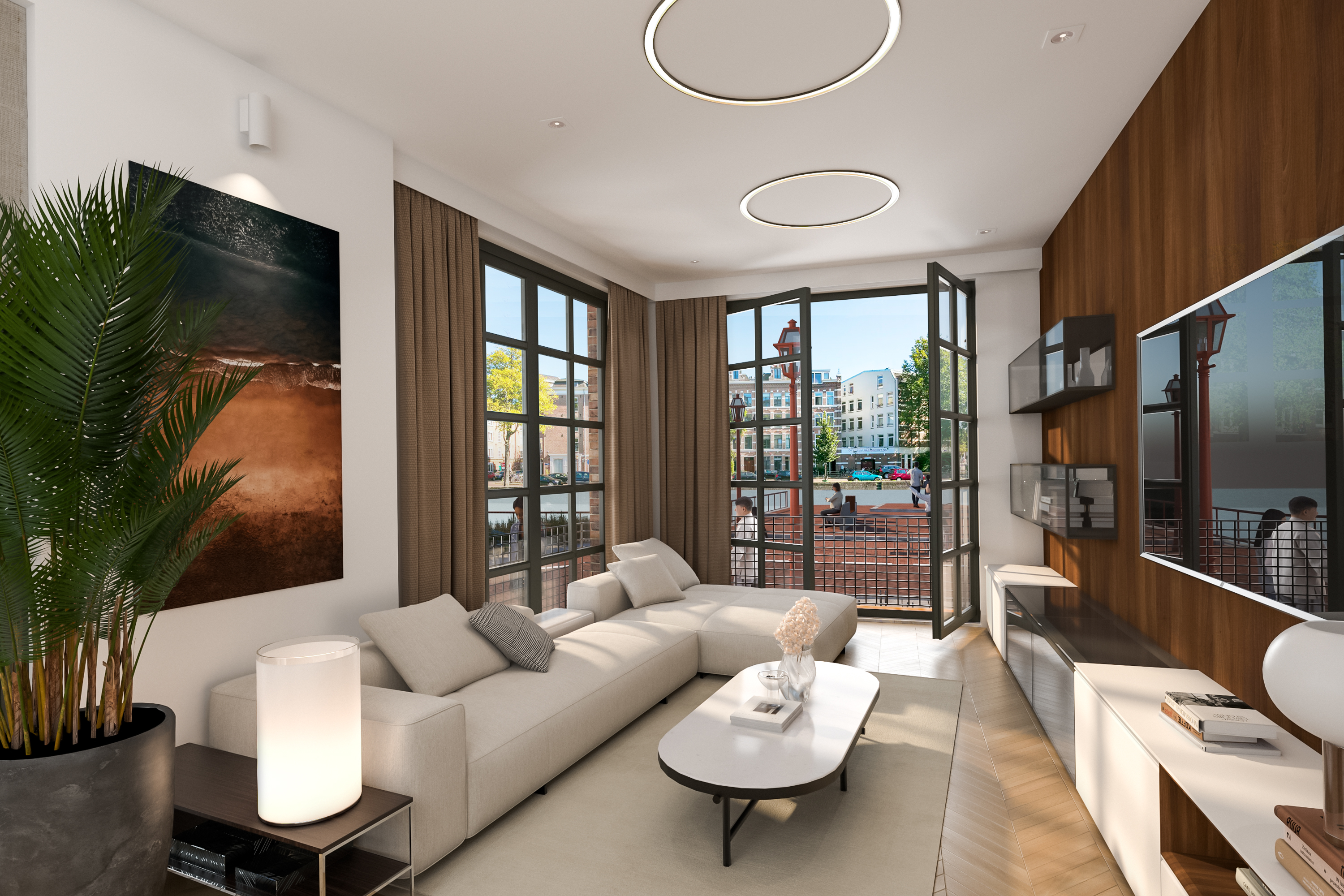 De bel-etage heeft een indrukwekkende plafondhoogte van bijna 2,90 meter. Grote raampartijen en een brede harmonicapui aan de waterzijde zorgen voor veel licht en een directe verbinding tussen binnen en buiten. Deze verdieping leent zich perfect voor een ruime woonkamer en een royale open keuken.
